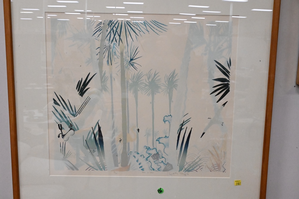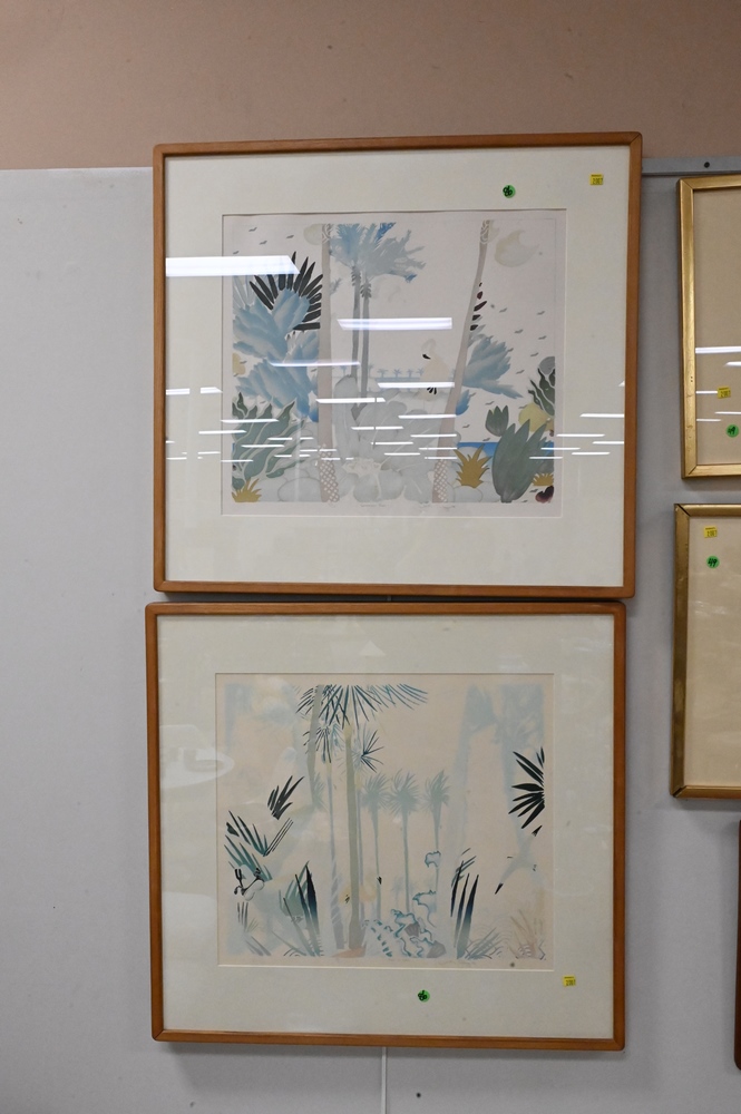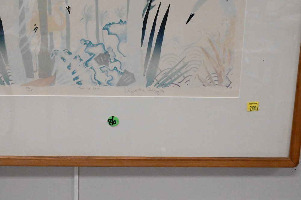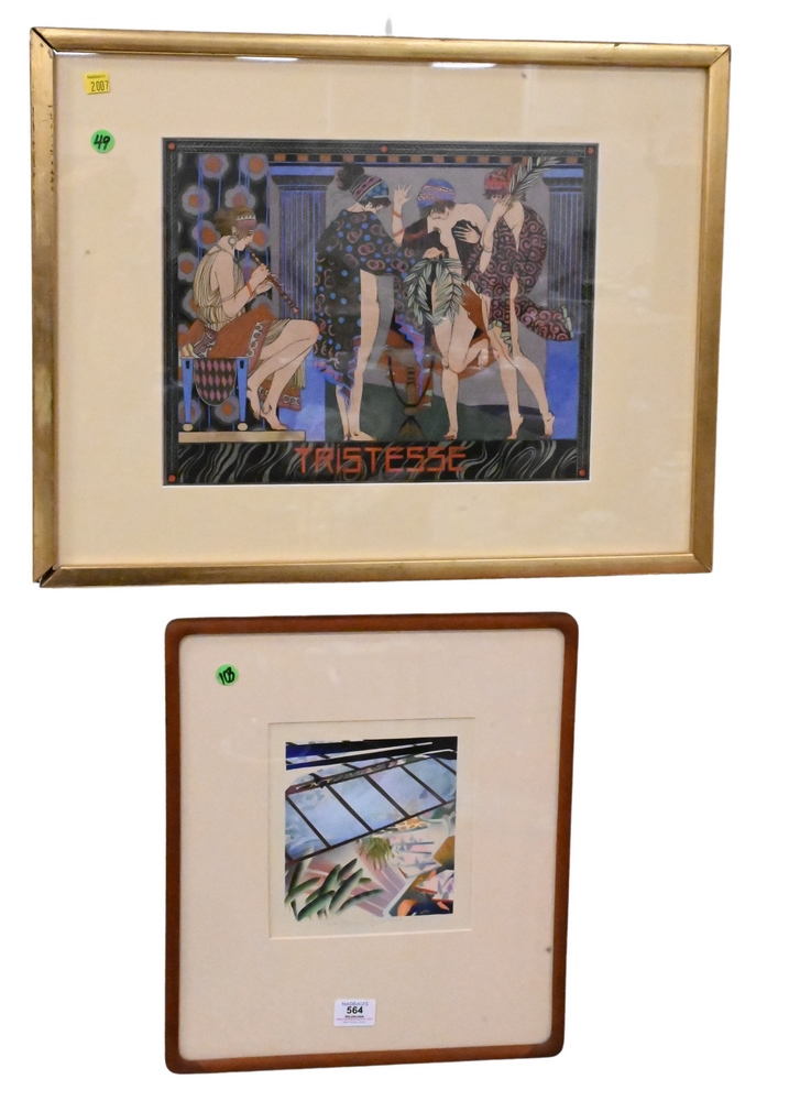 Lot 564: Five Piece Framed Lot, to include two Elizabeth _____ lithographs, to include “Port of Call” along with “Gondanjo Flats”, both signed and titled bottom center; two art deco lithographs “Tristesse” and “Joie”; along with a mixed media, unsigned and titled “Public Gordons Glass Roof”; largest 19″ x 22″.