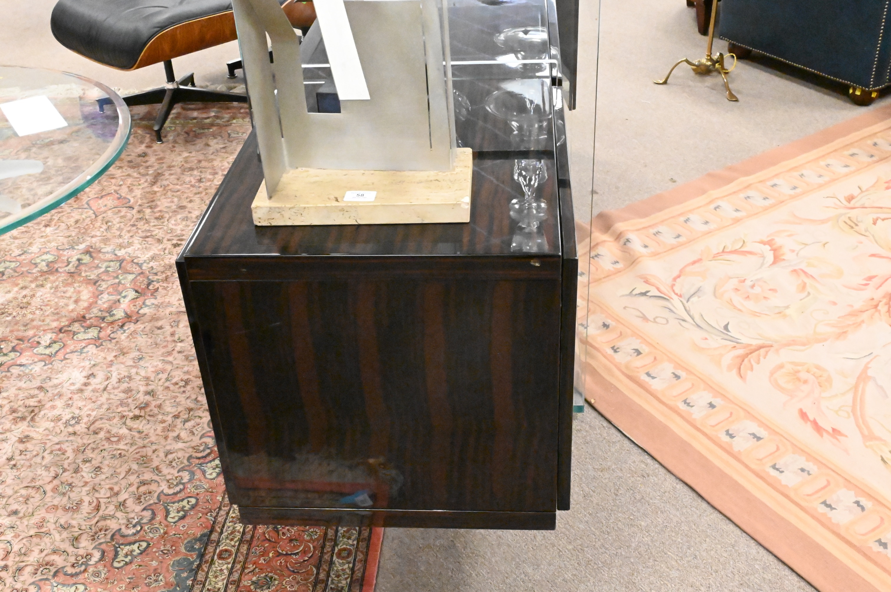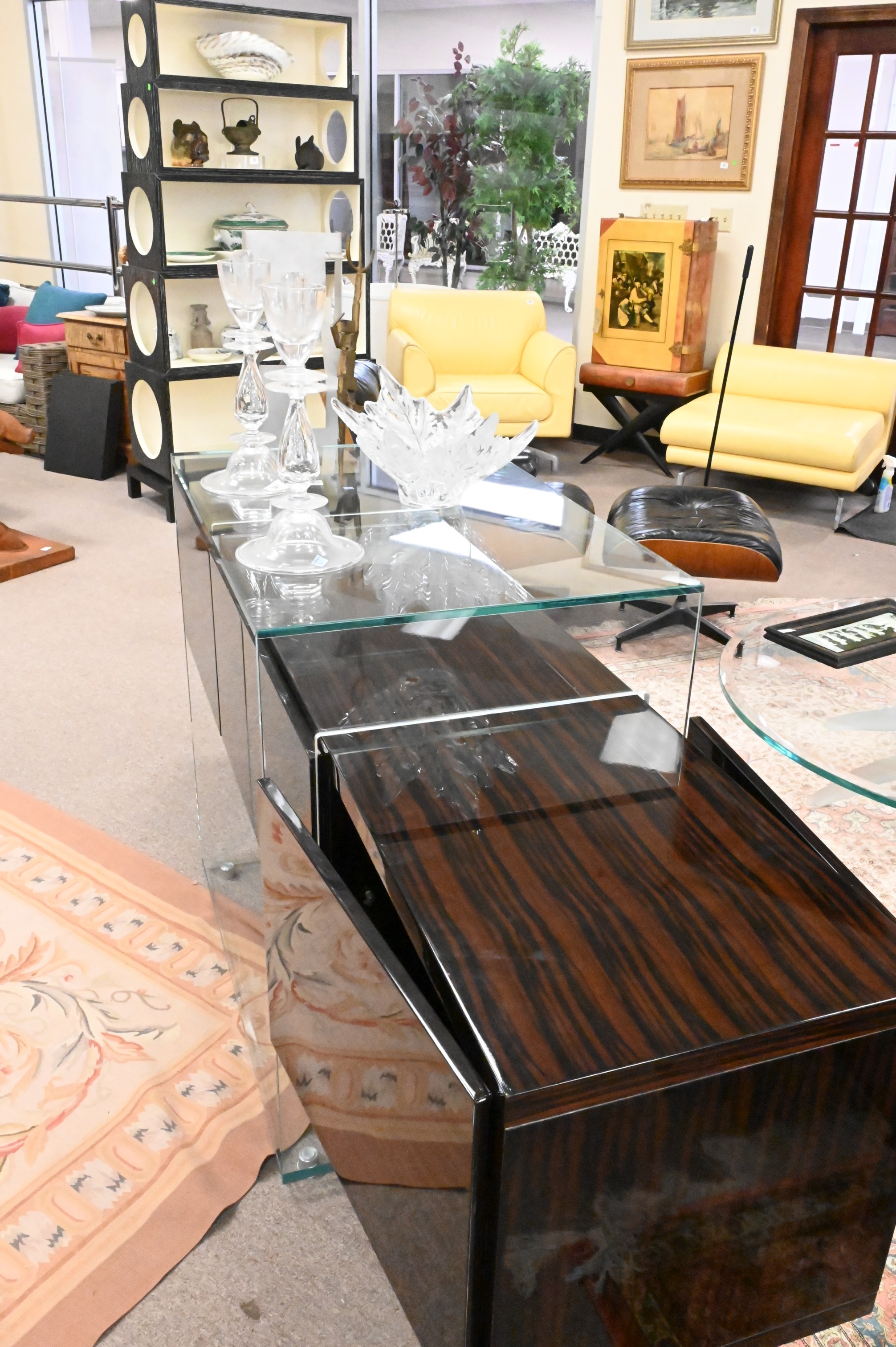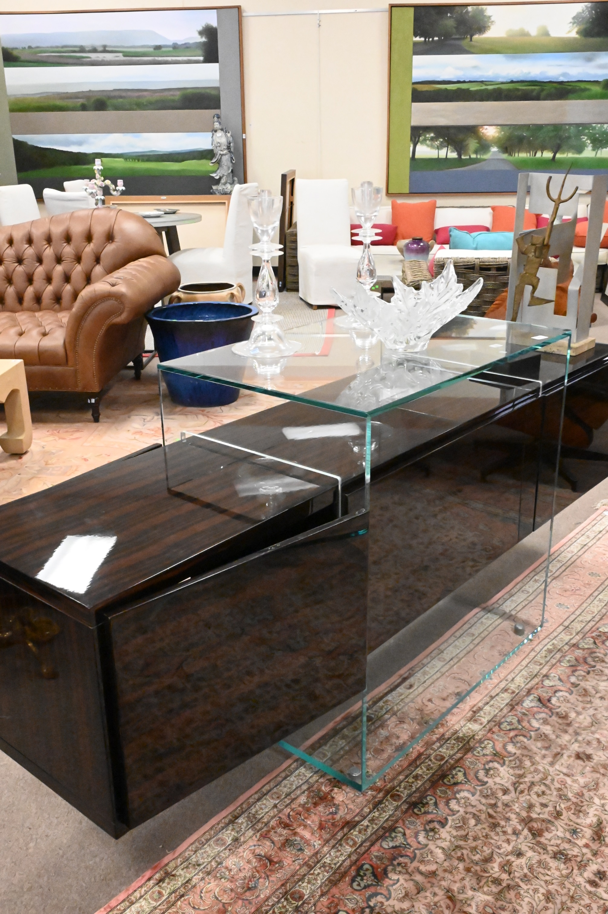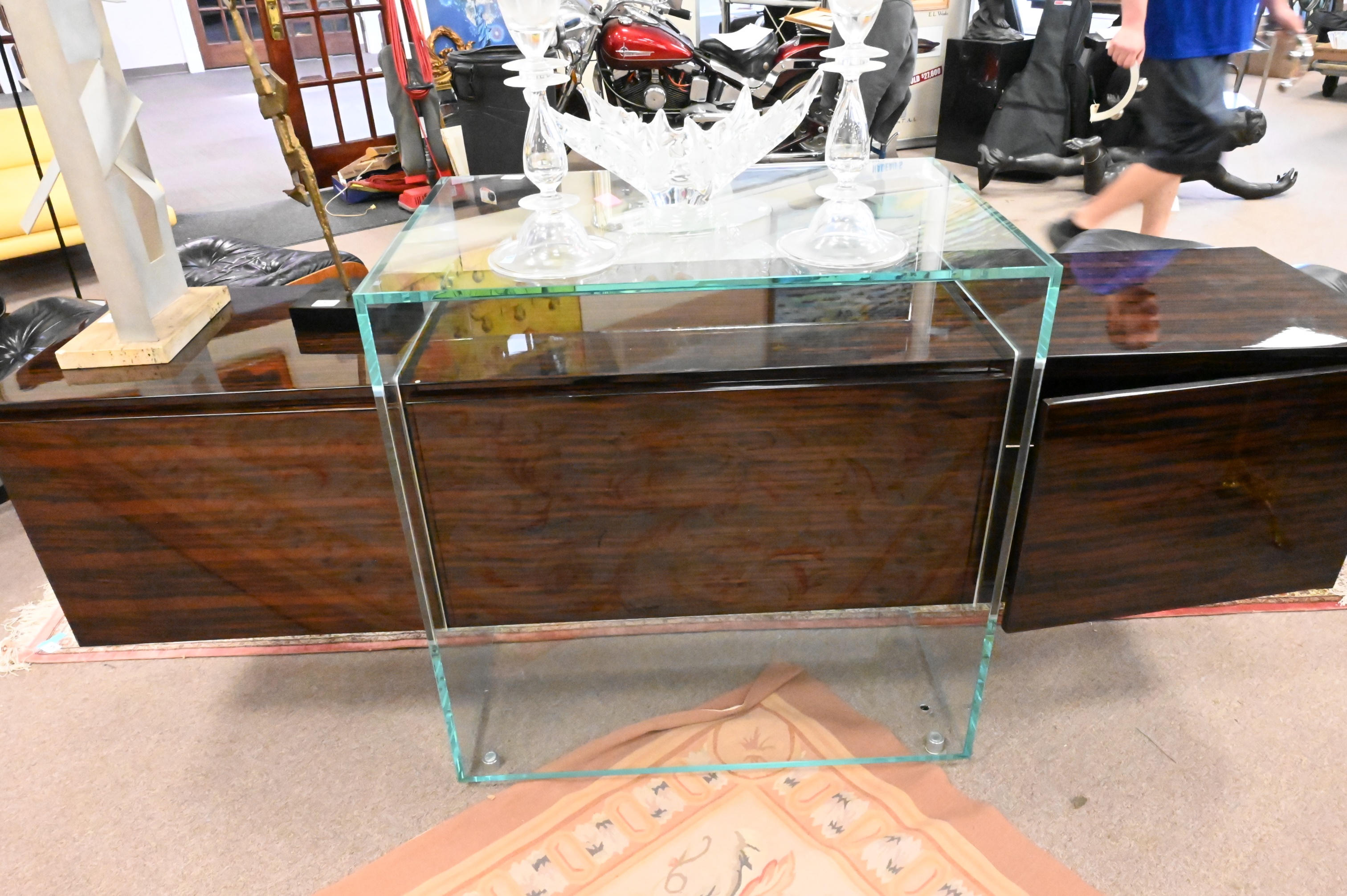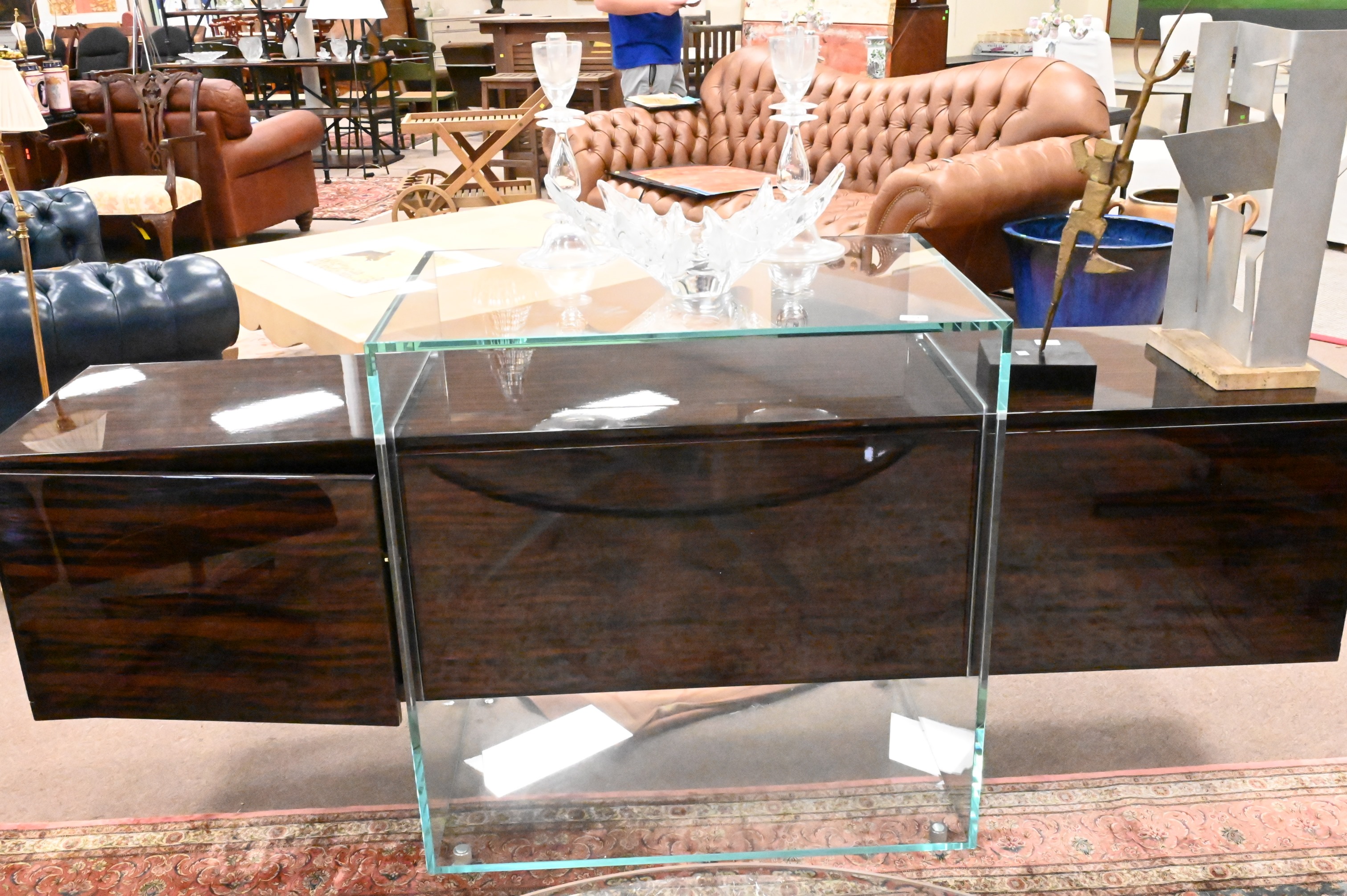 “Kubo Buffet” by Riccardo Lucatello, having canaletto walnut body with four leaf doors, internal partition and one central folding door with clear 15mm thick central extra support glass, retails for $7,400, height 36 1/2 inches, top 18″ x 85″ Provenance: A Private Collection from Greenwich Connecticut.