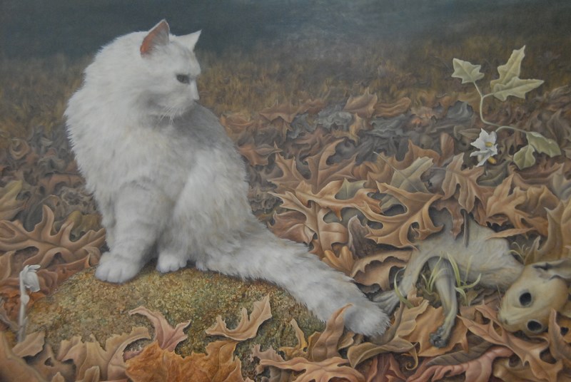 Max Standley 20th century RESURRECTED oil on masonite signed lower right Max Standley labels on reverse with date, title, and artist’s signature written letter stating: Indian-pipe or corps plant, Monotropa uniflora is said to have furnished the Indians with healing eye lotion. This painting has to do with spiritual evolution. Not literal seeing, but spiritual vision. The process of rebirth. 24 x 27