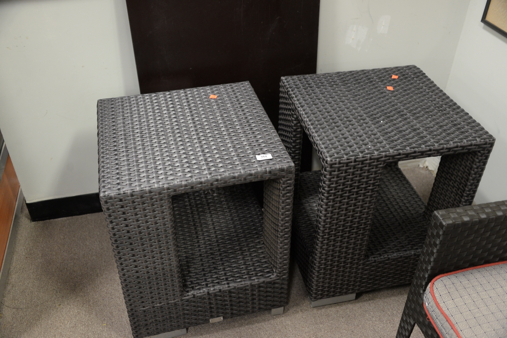 Pair of Barlow Tyrie Outdoor Woven Side Stands, designed by Vladimir Kagan, height 18 1/4 inches, top 23″ x 23″. Provenance: David and Cynthia Kim, 22 Stoney Wylde Lane, Greenwich, Connecticut. View home by visiting: https://www.zillow.com/homedetails/22-Stoney-Wylde-Ln-Greenwich-CT-06830/177238281_zpid/