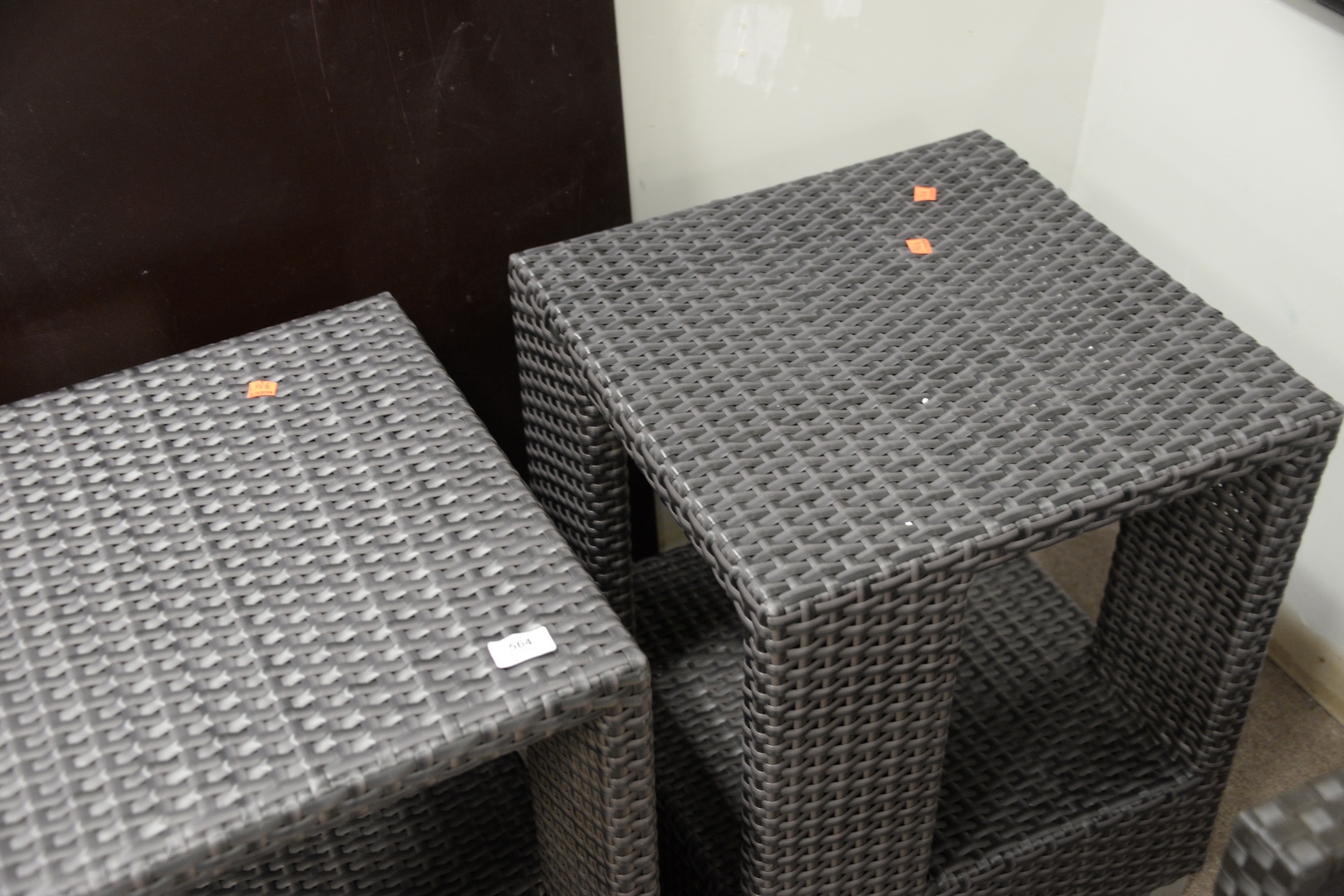 Lot 564: Pair of Barlow Tyrie Outdoor Woven Side Stands, designed by Vladimir Kagan, height 18 1/4 inches, top 23″ x 23″. Provenance: David and Cynthia Kim, 22 Stoney Wylde Lane, Greenwich, Connecticut. View home by visiting: https://www.zillow.com/homedetails/22-Stoney-Wylde-Ln-Greenwich-CT-06830/177238281_zpid/