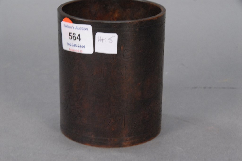 Lot 564: Small bronze brush pot with incised buffalo with boy under a tree, marked on bottom. ht. 5in.