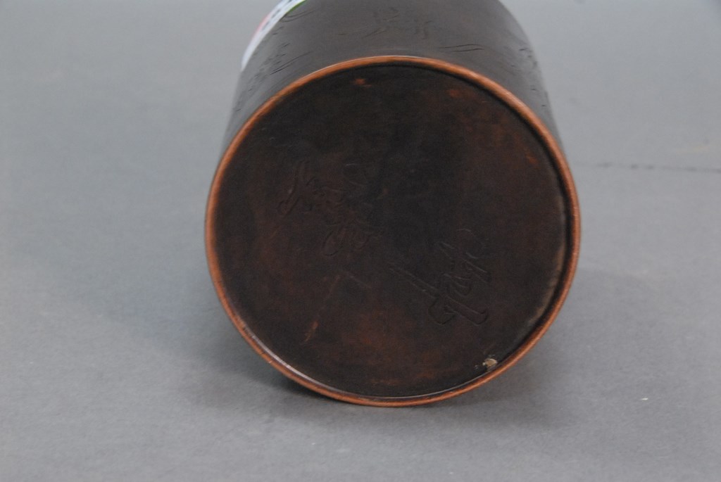 Small bronze brush pot with incised buffalo with boy under a tree, marked on bottom. ht. 5in.