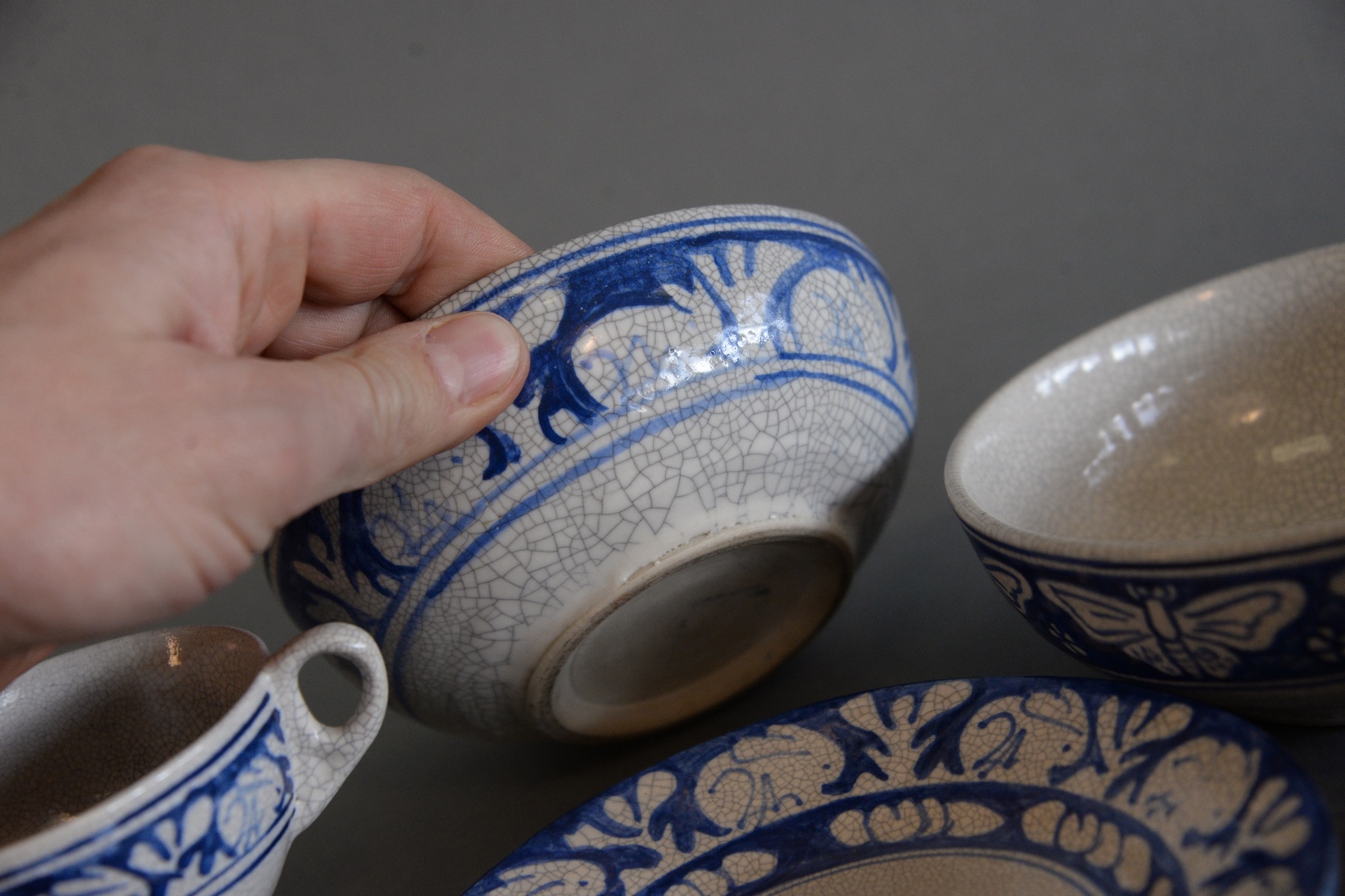 to include double handled stem cup, bowl and small dish with rabbit or bunny design, covered jar with lotus lily flower, and a small bowl with moth