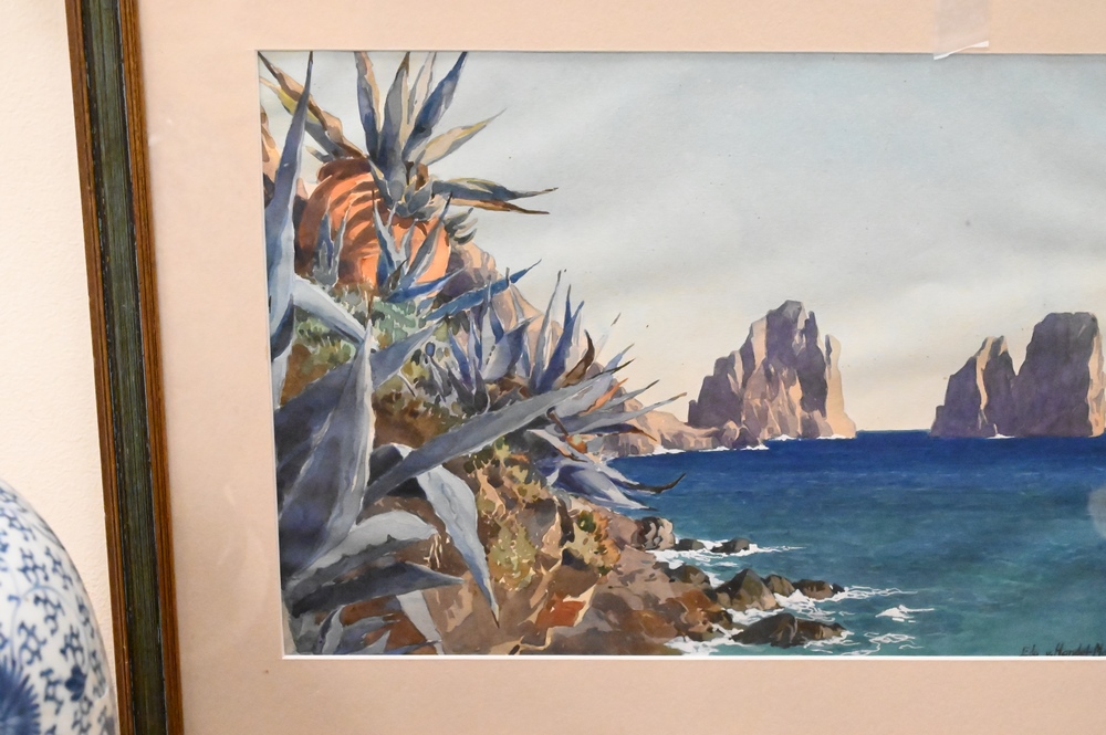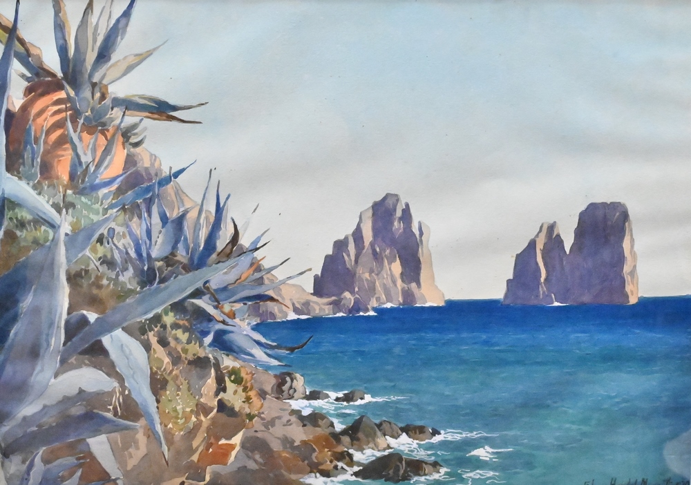 Eduard von Handel-Mazzetti (Austrian, 1883 – 1950), Capri, I Faraglioni, watercolor on paper, signed lower right “Edy v. Handel-Mazzetti, 1930″, sight size 9 3/8″ x 13 1/4”. Provenance: Estate of Wallace Bradway, New Haven, CT.