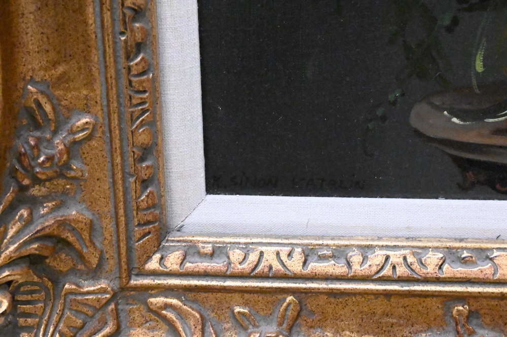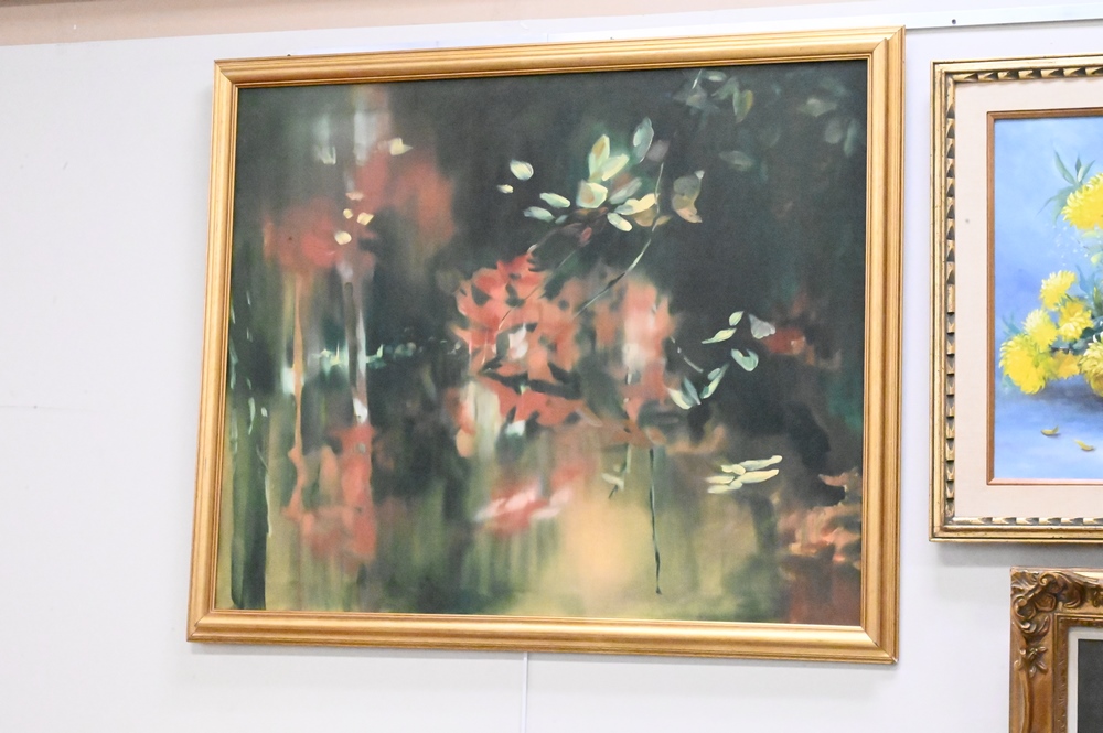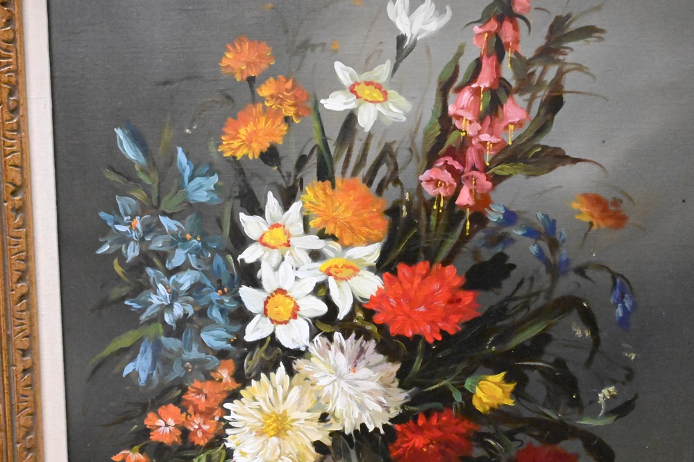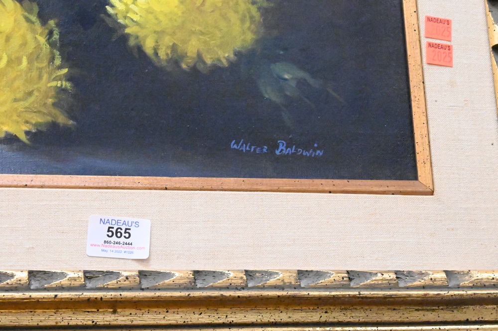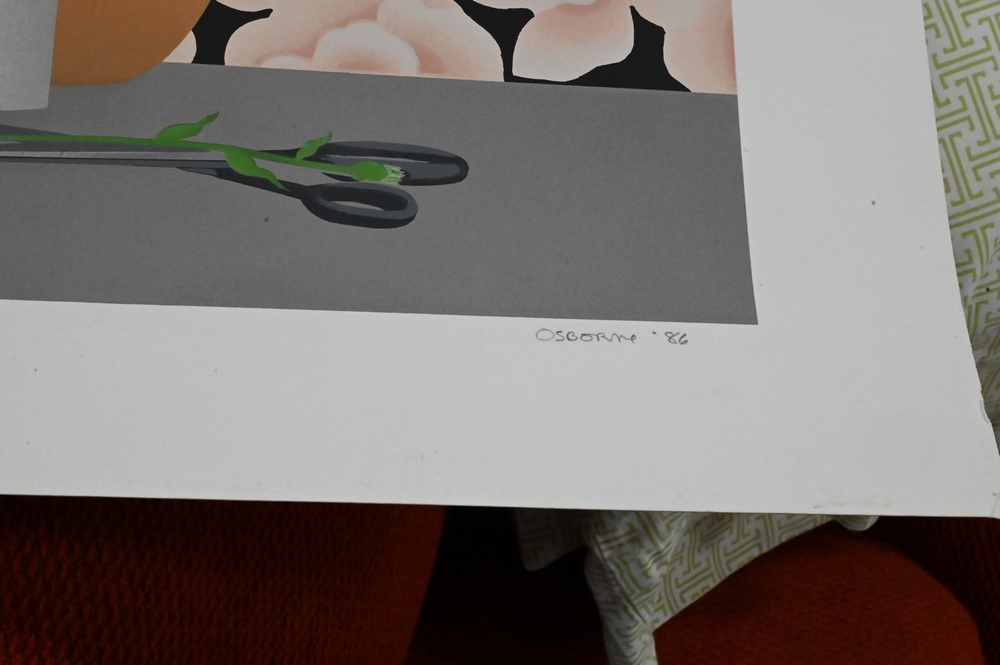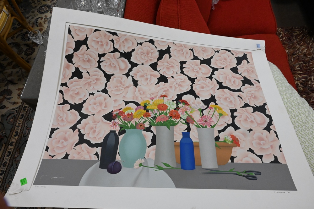 Lot 565: Four Modern Still Lives, including one oil on canvas signed K. Simon Katalin; along with an unframed lithograph signed Osborne 86, canvas 24″ x 20″; Walter Baldwin still life of flowers, oil on canvas, 24″ x 30″; A. Sirico (20th century), modernist flowers, acrylic on canvas, signed twice on the stretcher bars “A. Sirico”, 38″ x 47″.
