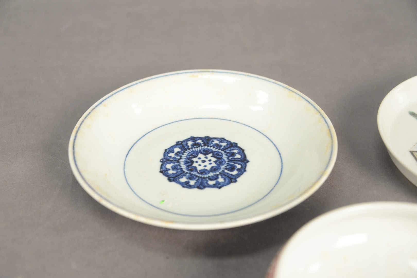 Group of three Oriental porcelain pieces to include a blue and white bowl dia. 7in., Famille rose plate with Guanyin figure having Yongzheng mark, and dragon bowl with Qianlong mark on bottom.