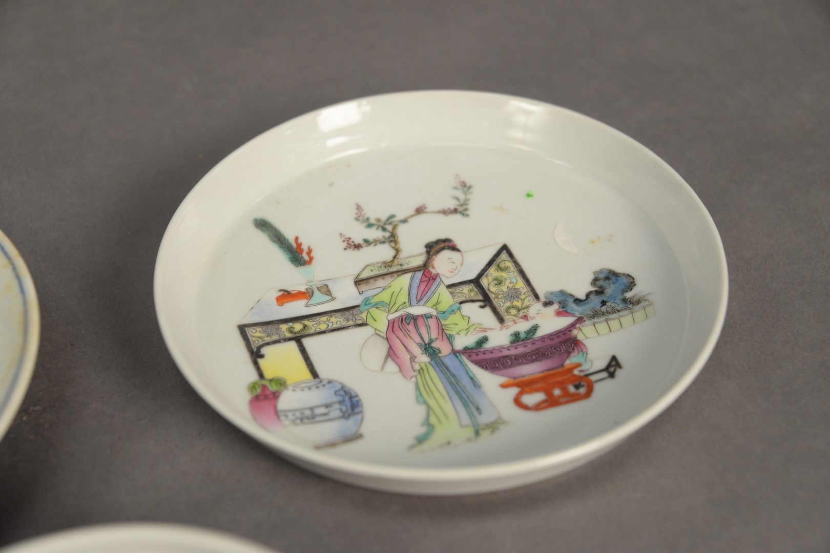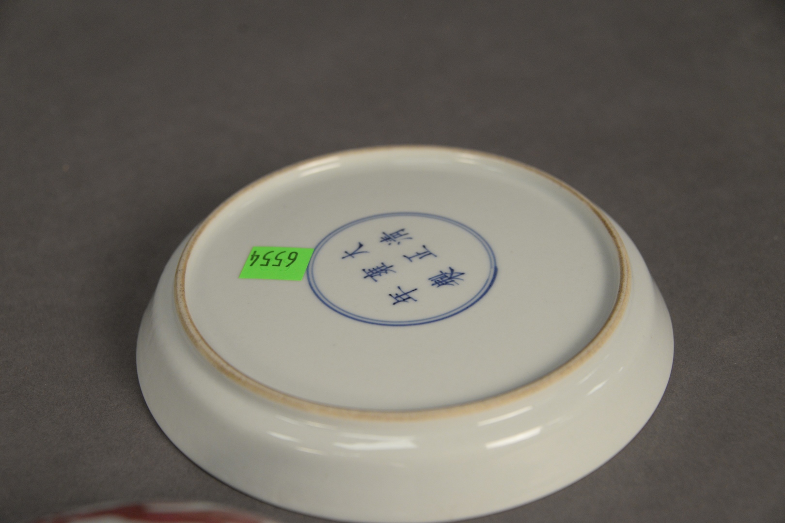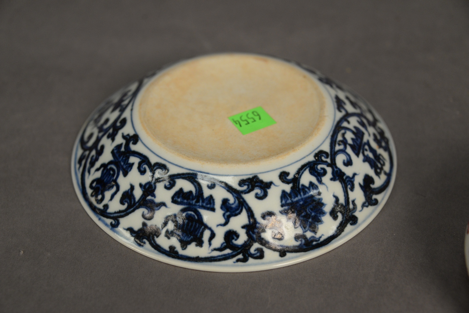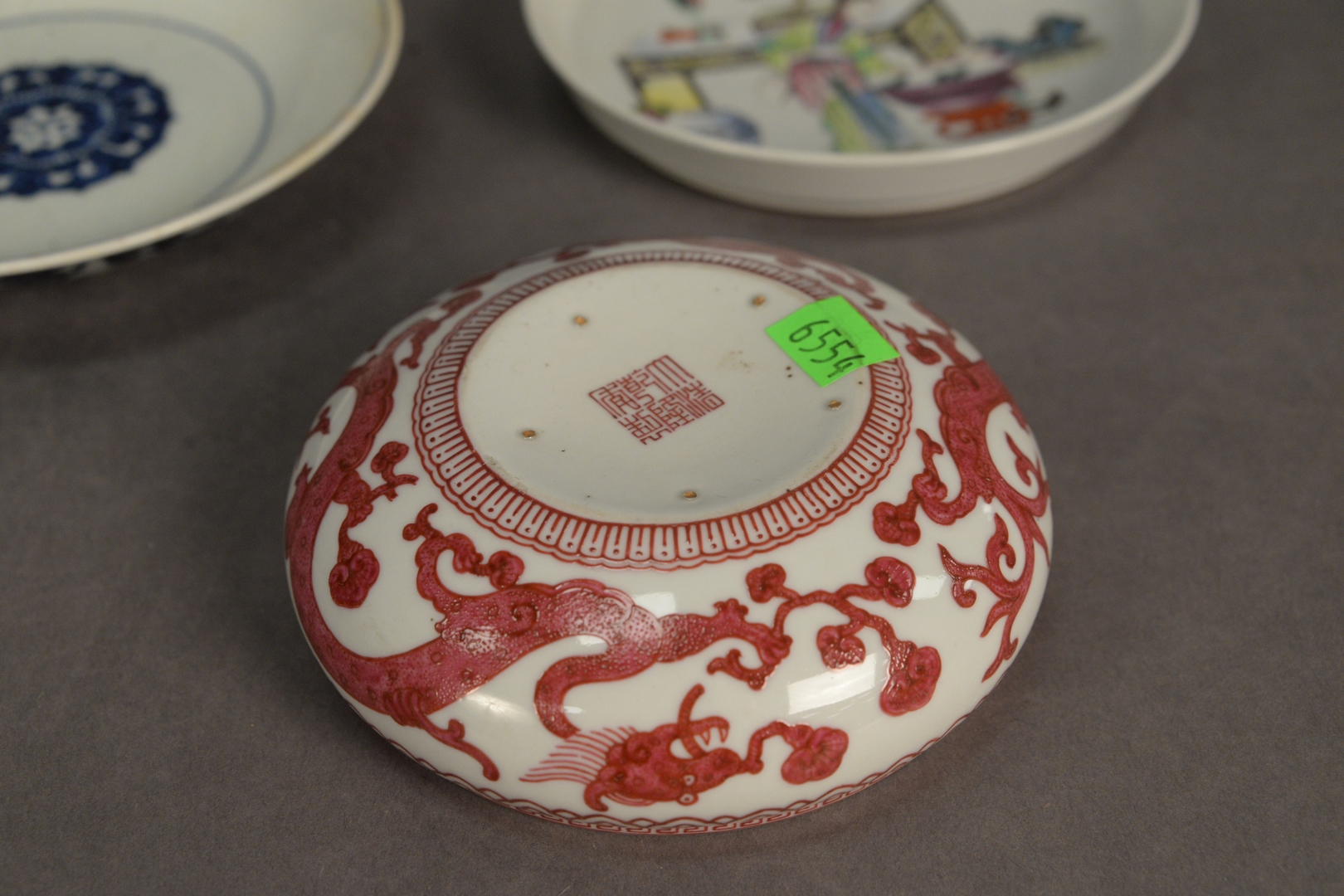 Lot 565: Group of three Oriental porcelain pieces to include a blue and white bowl dia. 7in., Famille rose plate with Guanyin figure having Yongzheng mark, and dragon bowl with Qianlong mark on bottom.