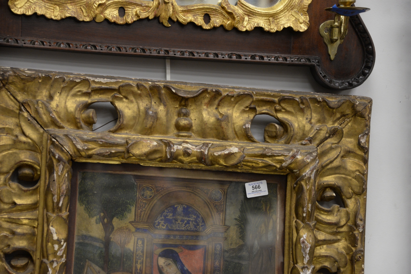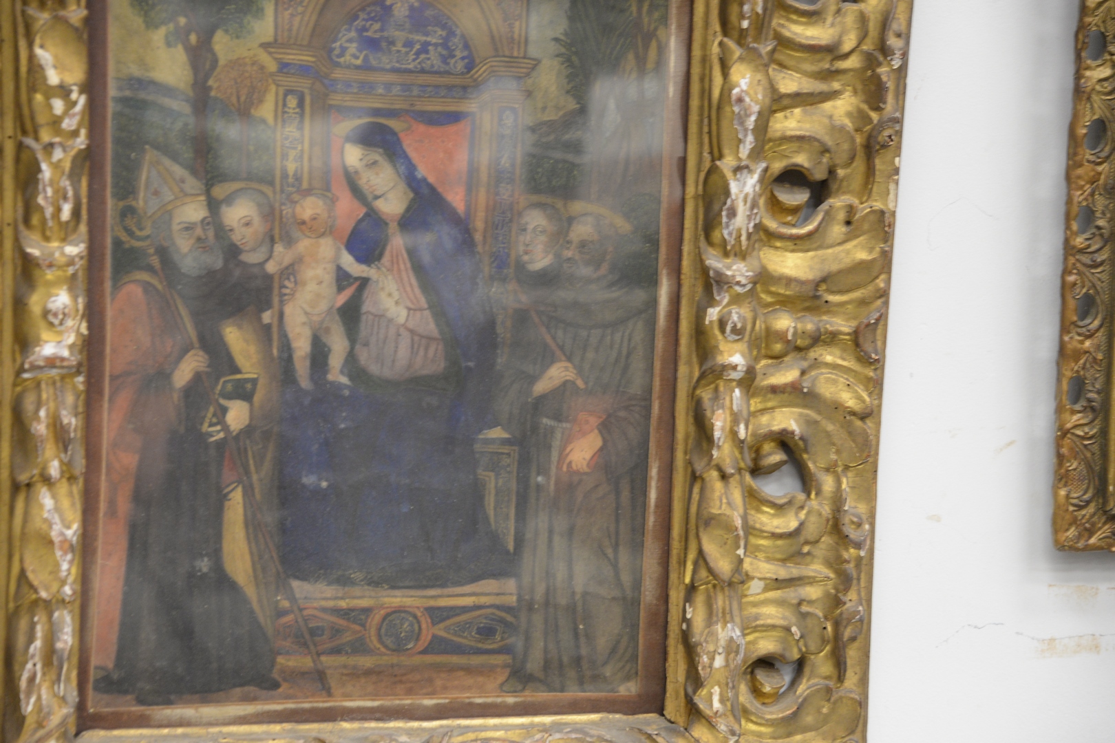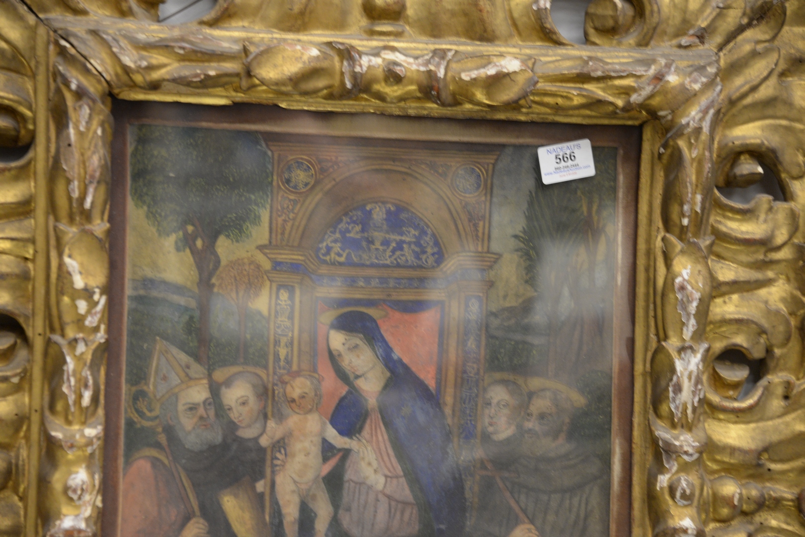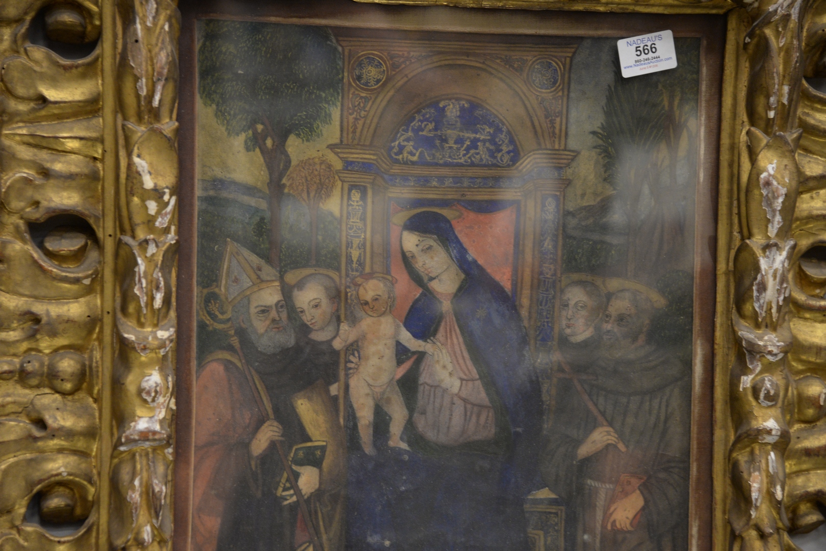 Lot 566: 17th or 18th century or later Religious Scene, showing the baby Jesus and Mary, gouache on paper, in ornate frame, 18 1/2 x 13.