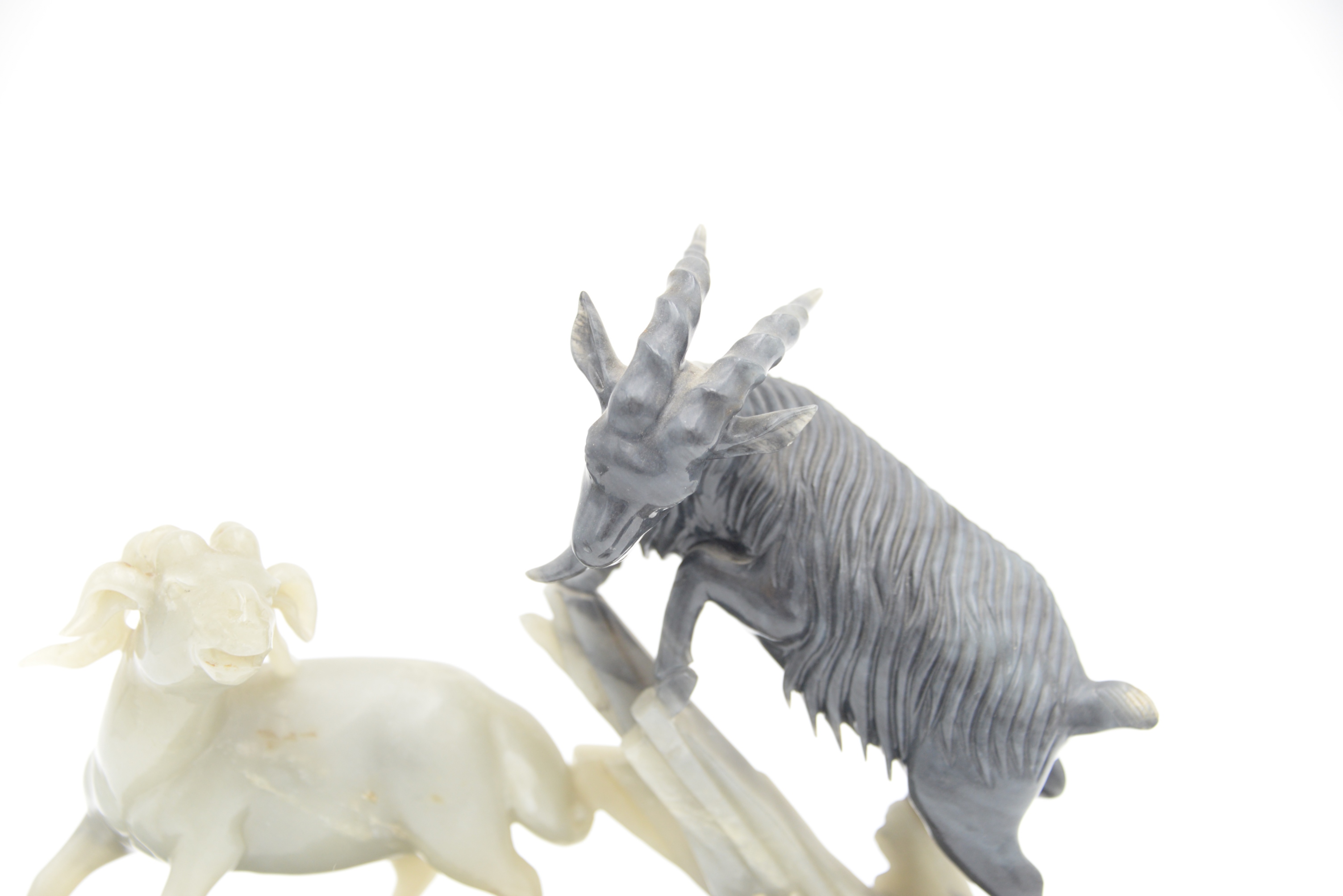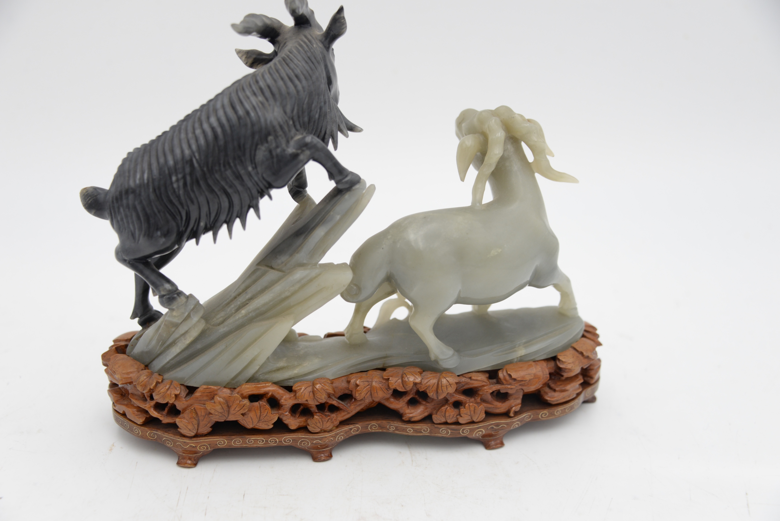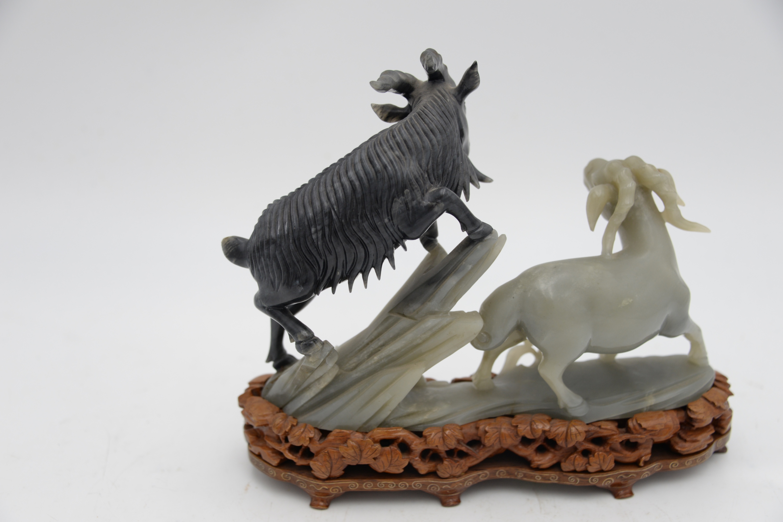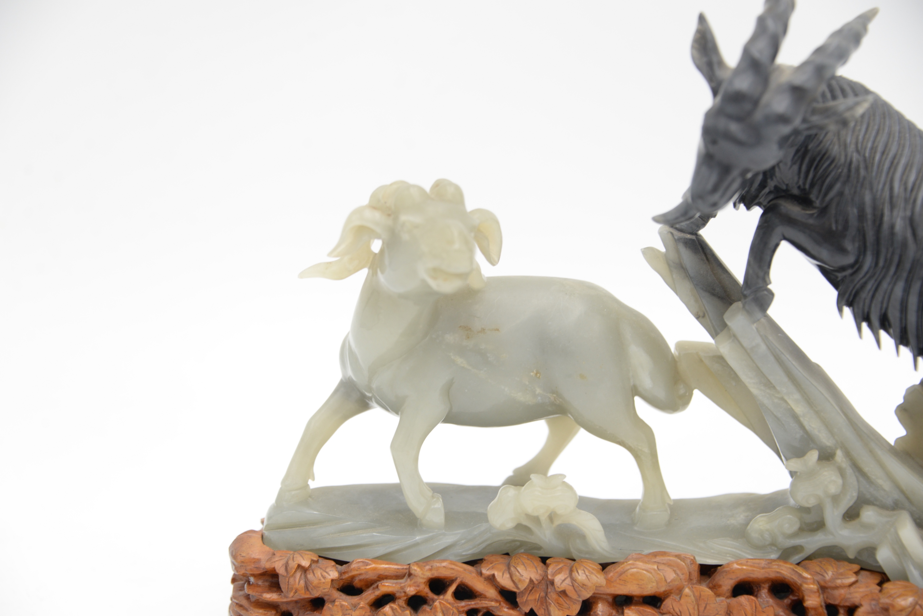 Chinese Gray Jade Ram, carved from two-toned nephrite, depicting a pair of rams and rockwork, on a fitted wooden base, height 6 inches, width 8 3/4 inches. Provenance: Julius H Jacobson II a Fifth Avenue Estate.