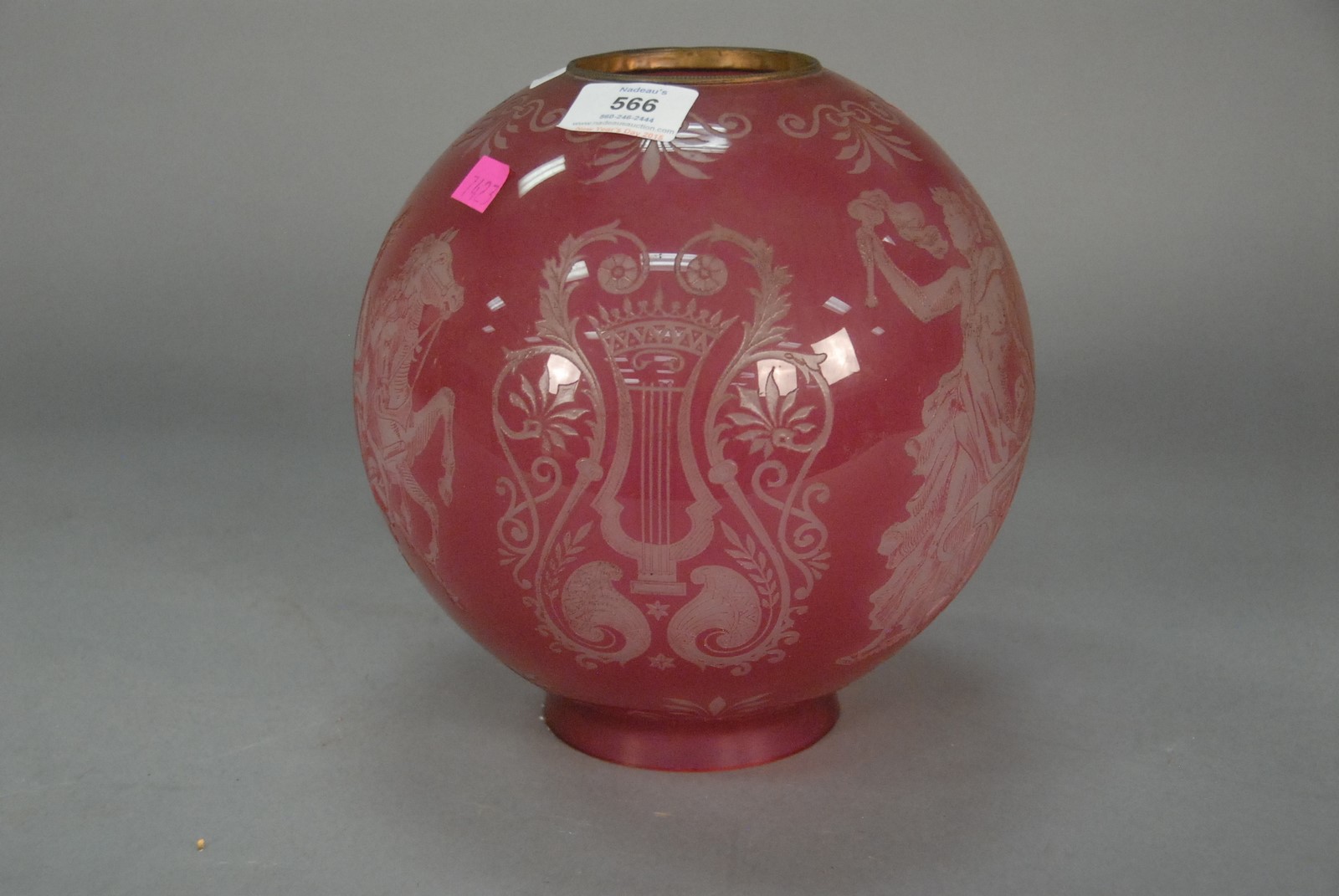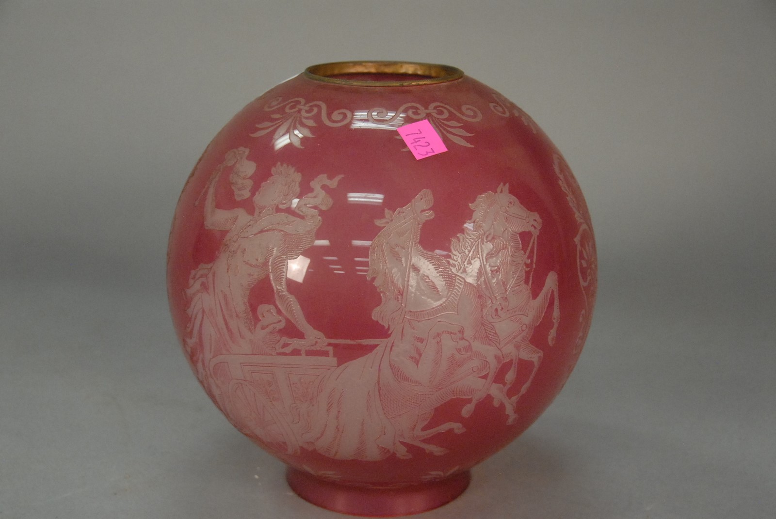 Lot 566: Lamp globe, ruby red with acid etched design of classical horse drawn chariots with torch bearer. ht. 9 in. dia. 8 in.