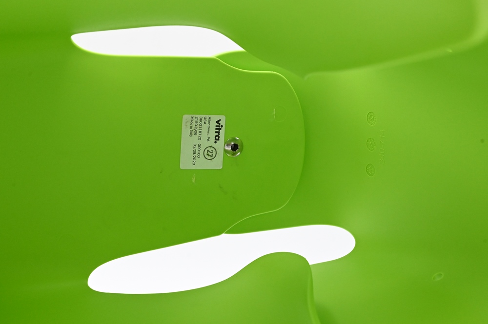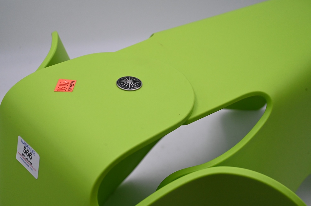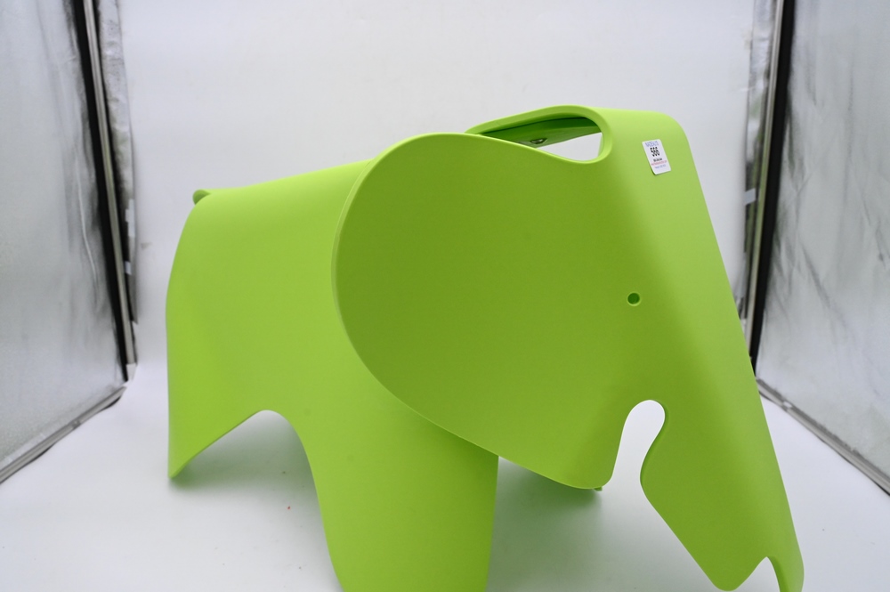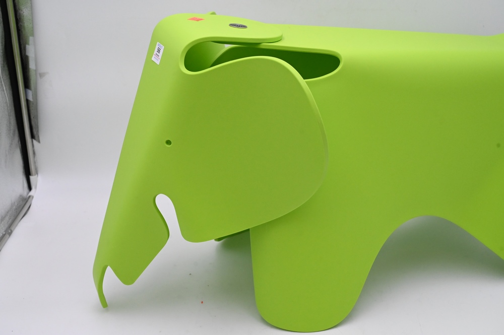 Lot 566: Large Charles and Ray Eames Elephant Stool, Manufactured by Vitre in lime green, height 16 inches, length 28 inches.