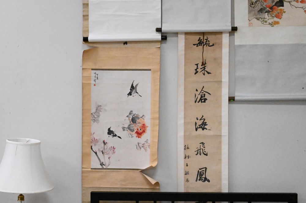 Lot 566: Six Chinese Scrolls, to include one of nude woman, three with birds, one of characters and one with laughing man, largest image size 48″ x 22″.