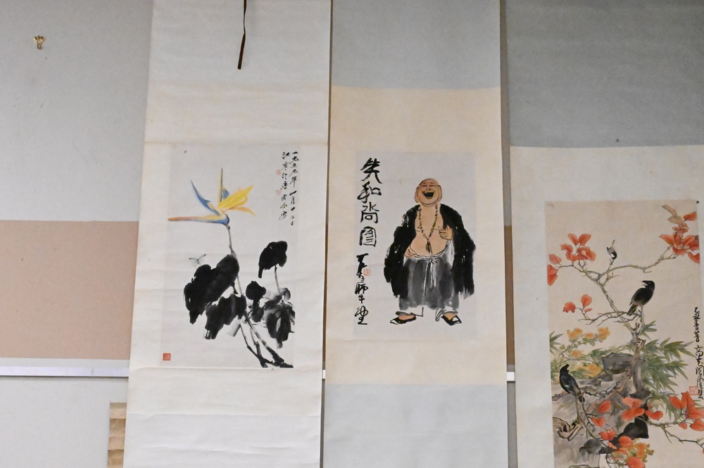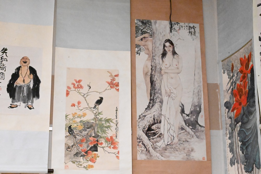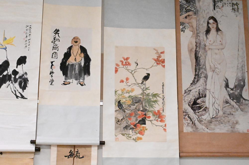 Six Chinese Scrolls, to include one of nude woman, three with birds, one of characters and one with laughing man, largest image size 48″ x 22″.