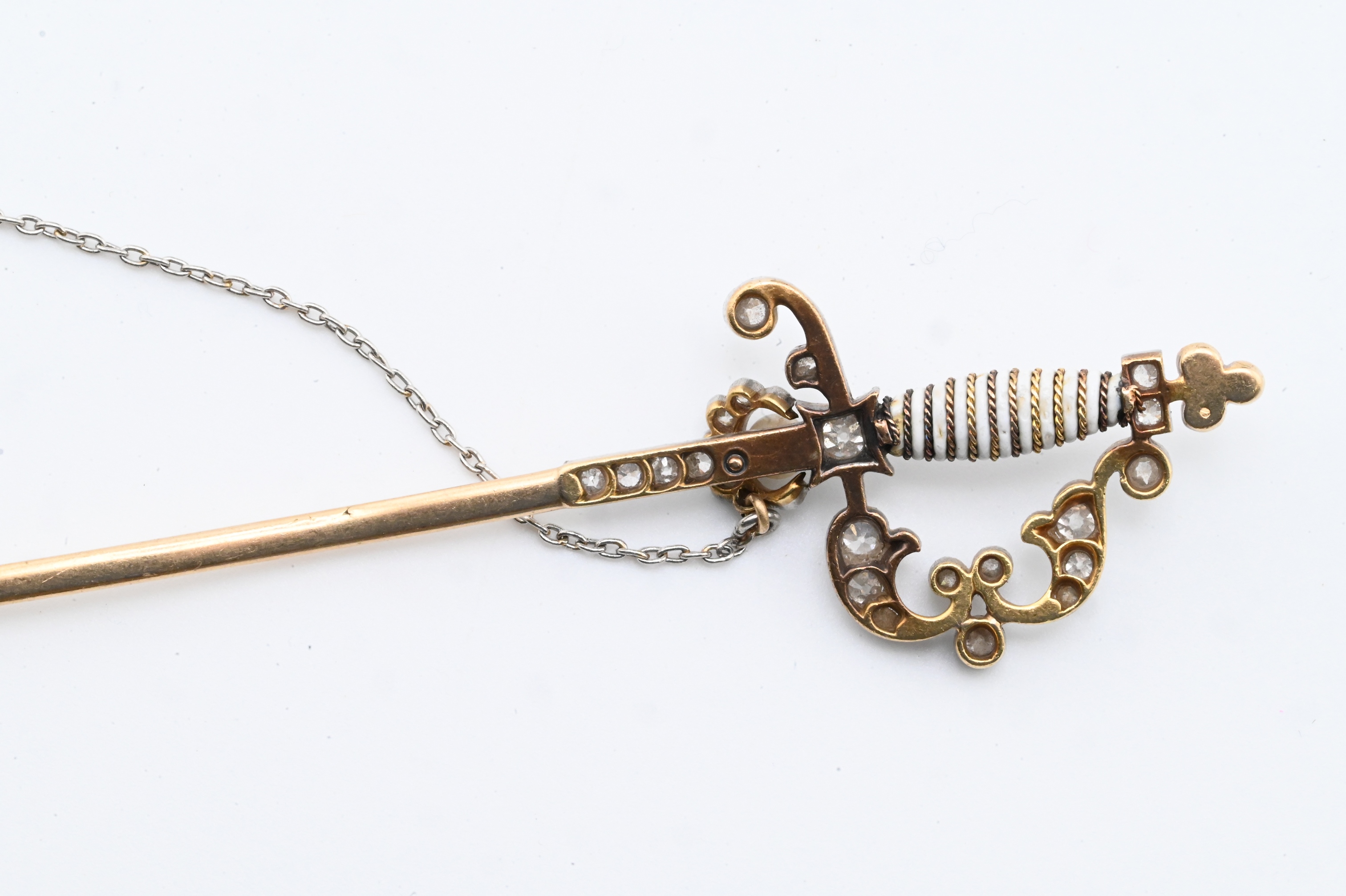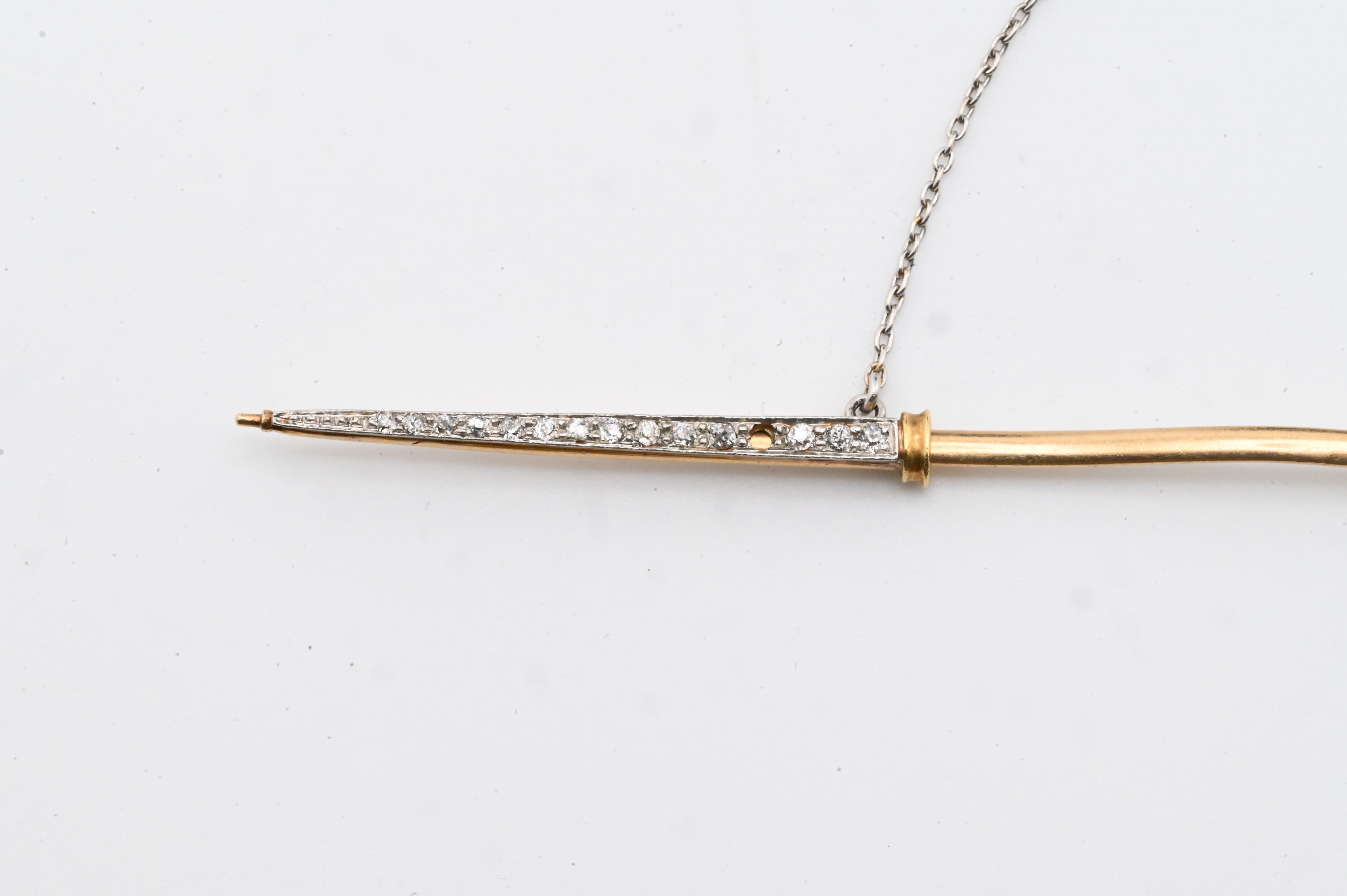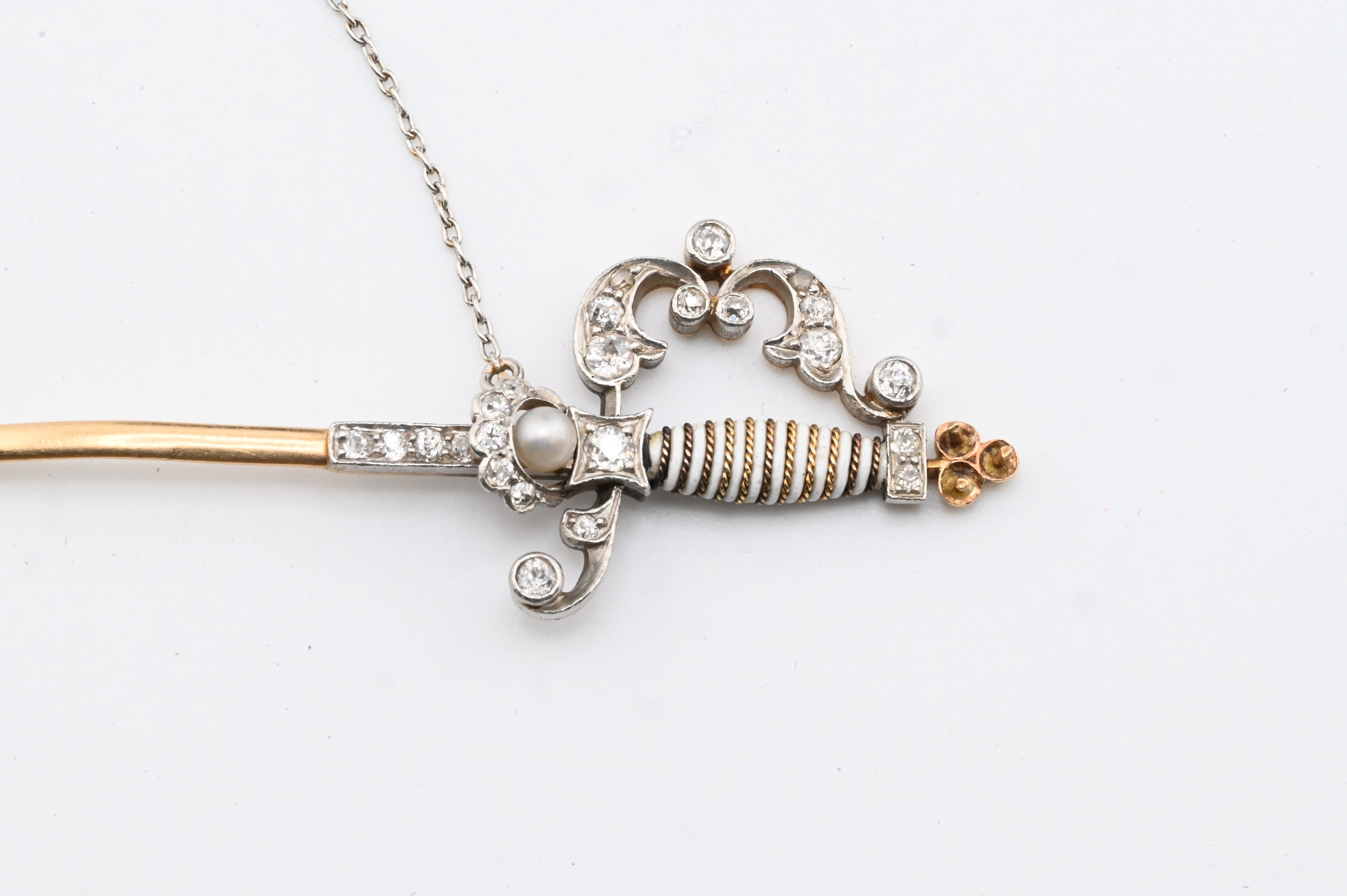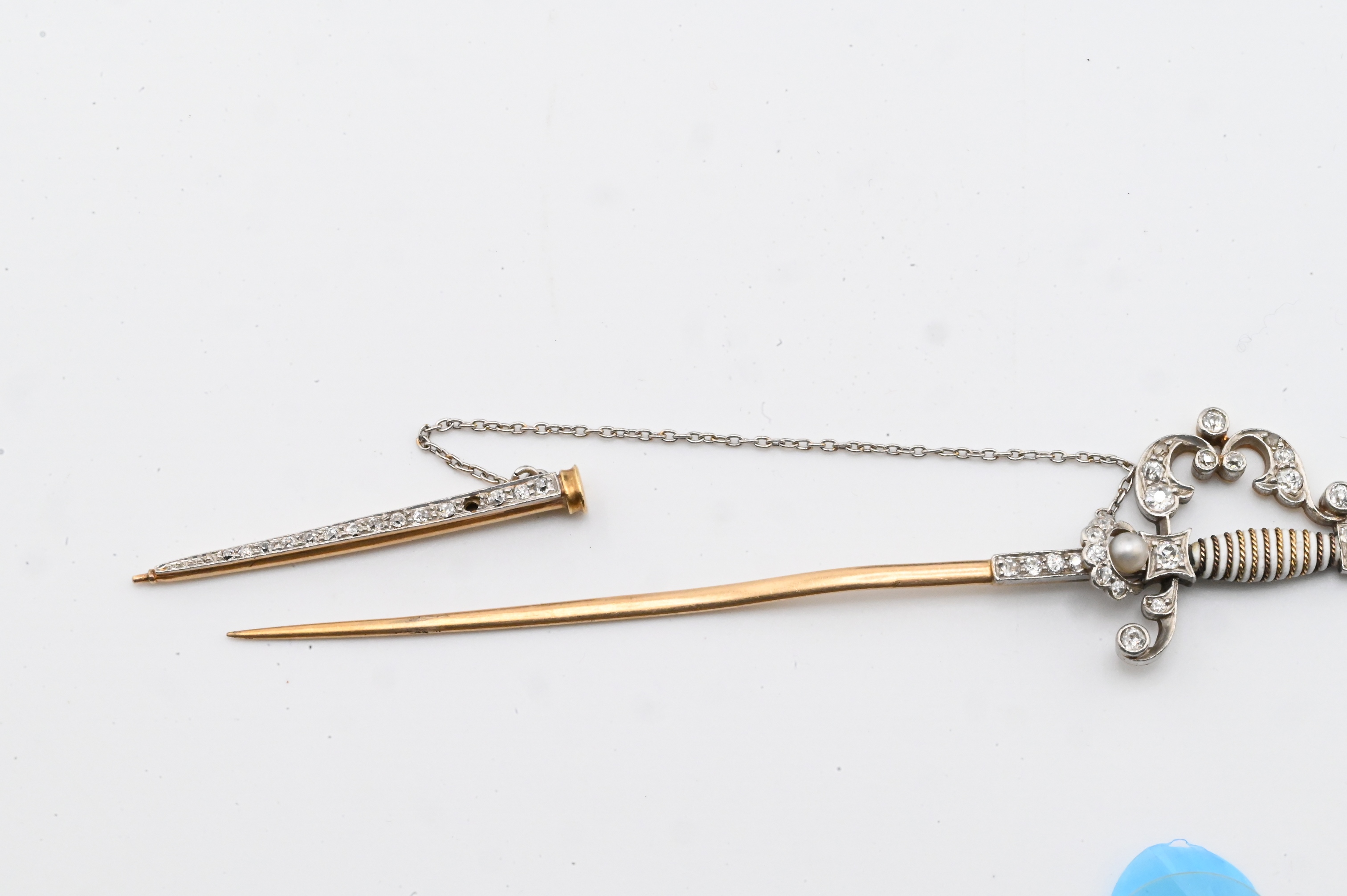 the finely crafted hilt and guard mounted with old mine- and rose-cut diamonds in silver-topped settings, accented by scrolling foliate motifs and a single small pearl mounted at the center of the crossguard, the grip detailed with ribbed gold and white enamel wirework, surmounted by a small crown-form pommel, the blade tapers to a point and is further accented with a line of graduated old-cut diamonds (one missing), the reverse fitted with a gold pin stem, a fine safety chain is attached at the guard
