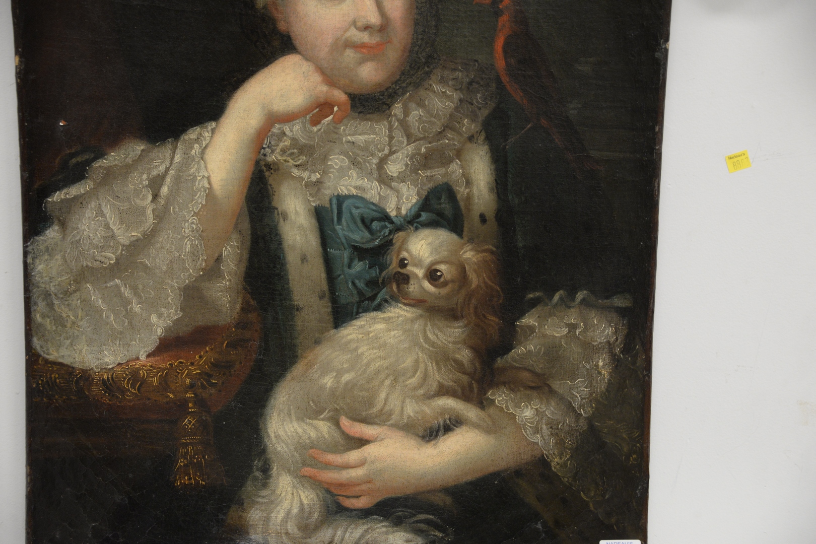 Lot 567: British School 18th/19th century, portrait of a lady with a Spaniel and a red bird, oil on canvas, unsigned, 29 1/4 x 22 1/2.