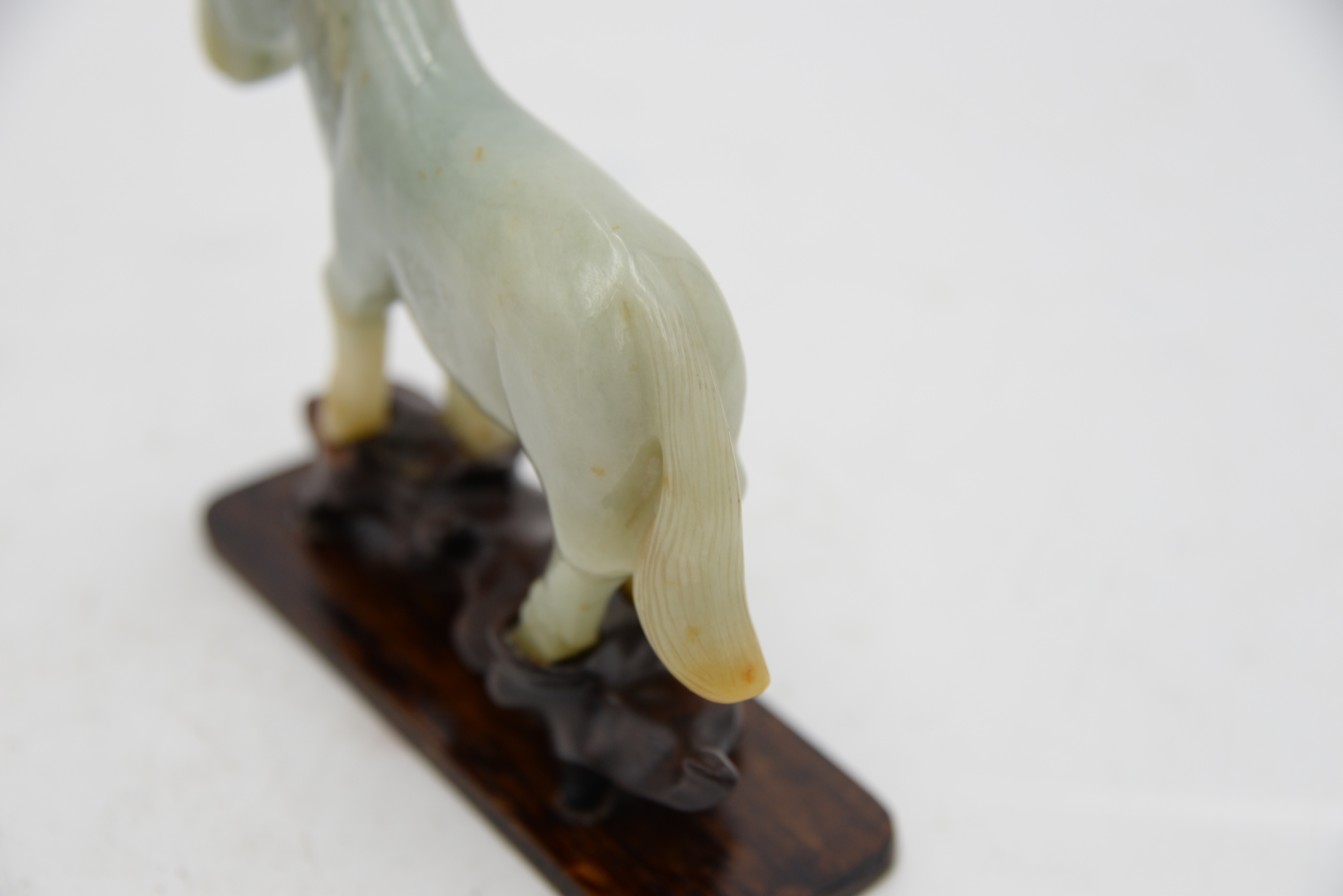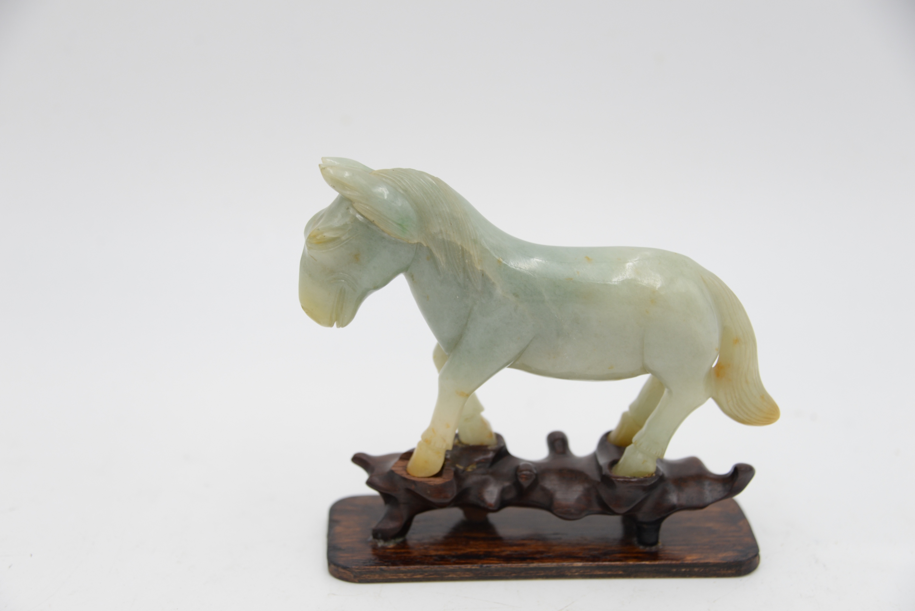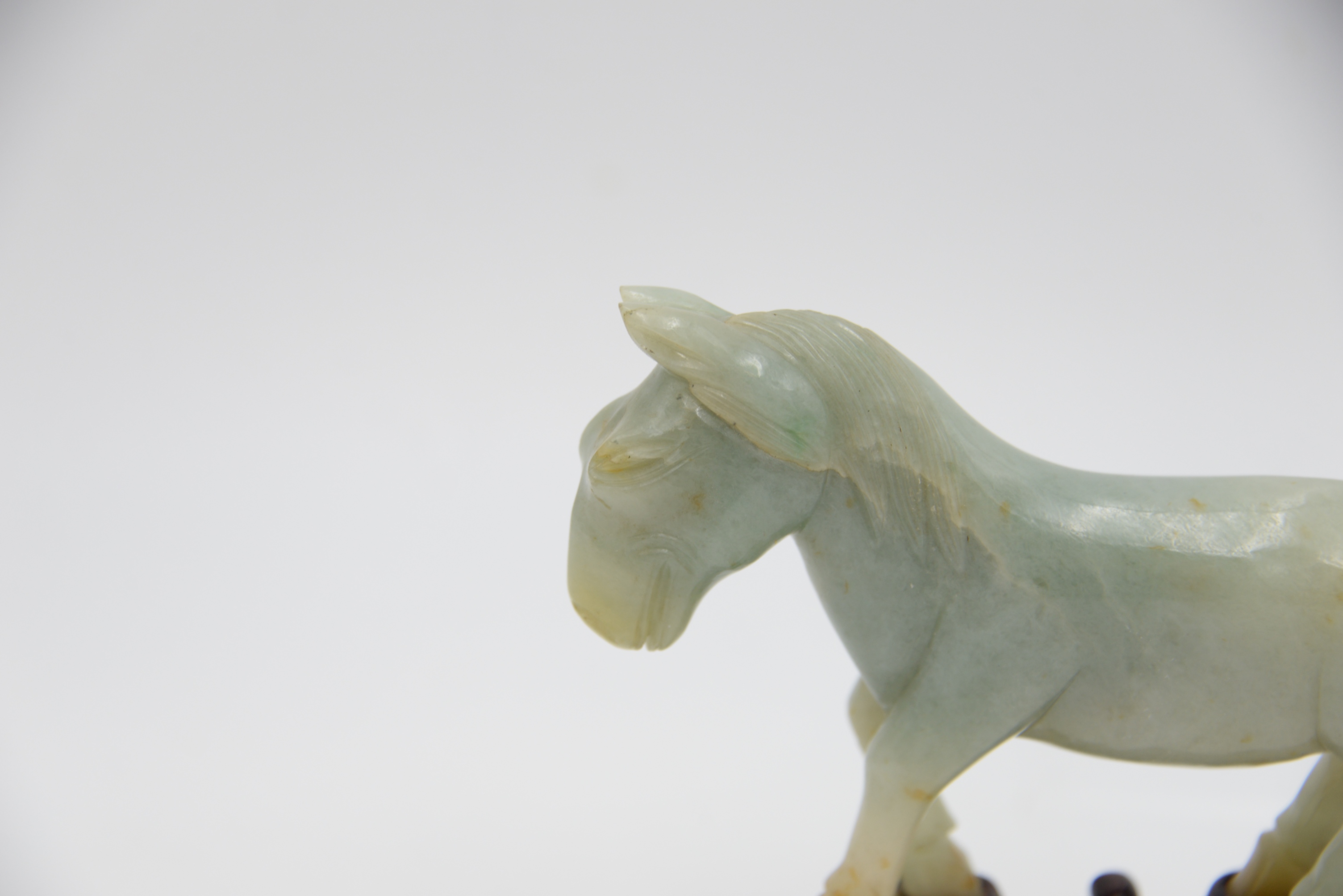 Chinese Celadon and Russet Jade Horse, carved in a walking forward position on carved stand, height 5 1/2 inches, length 5 inches.