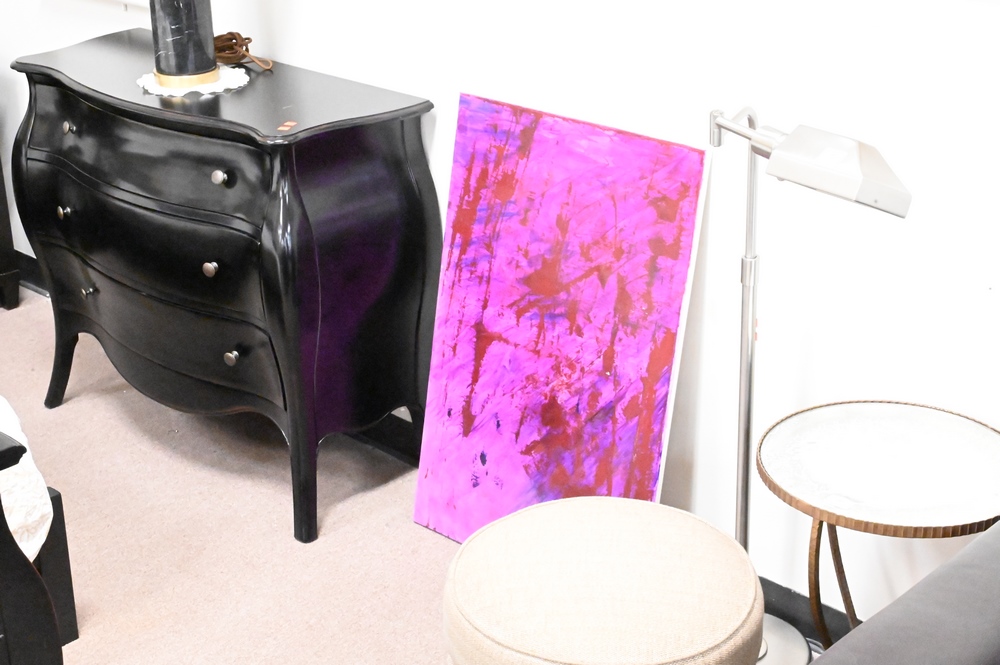 Lot 567: Eight Piece Framed Lot, to include Felicia Andrus mixed media; a lithograph signed indistinctly lower right and titled “Menage a trois” on verso; David Garcia oil on canvas signed lower right, titled “Le Palais du Louvre”; oil on canvas with symbols, signed lower right ____ Albert; abstract oil on canvas signed lower right “Bahil ____”; a Saptchoedojo mixed media, on allegorical oil on canvas; two unsigned abstract oils on canvas; along with a metal framed abstract piece, signed indistinctly on verso.