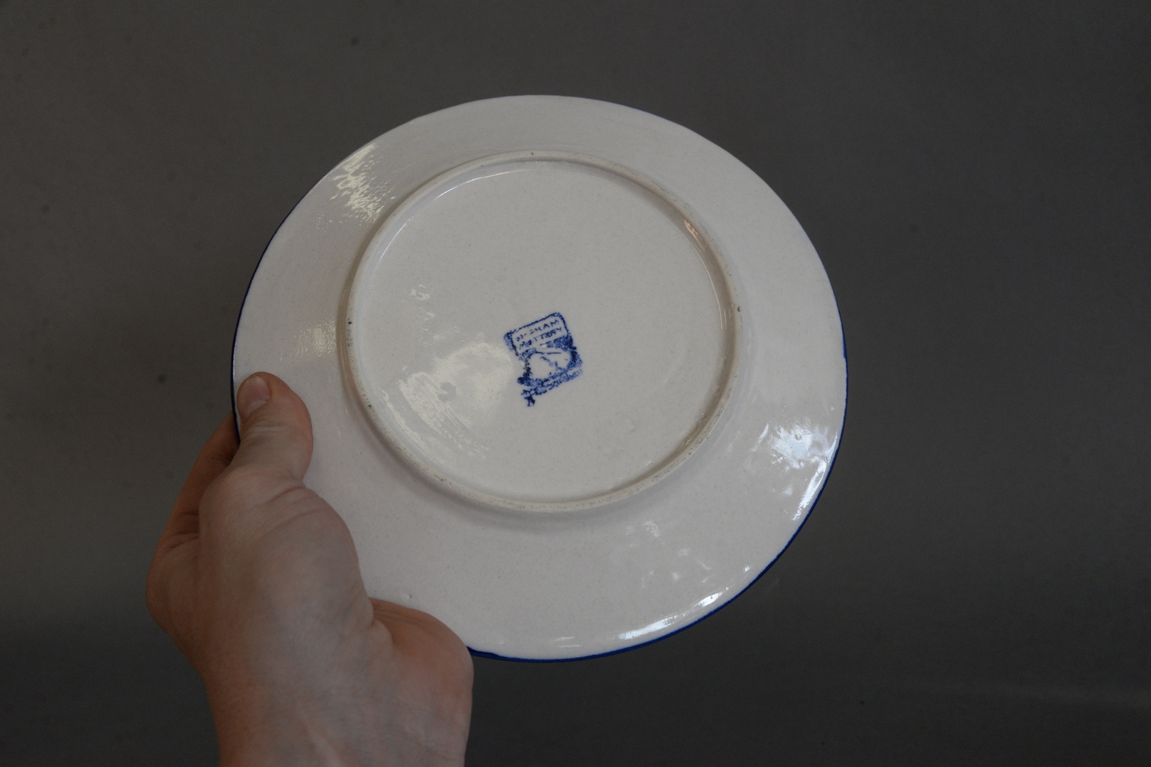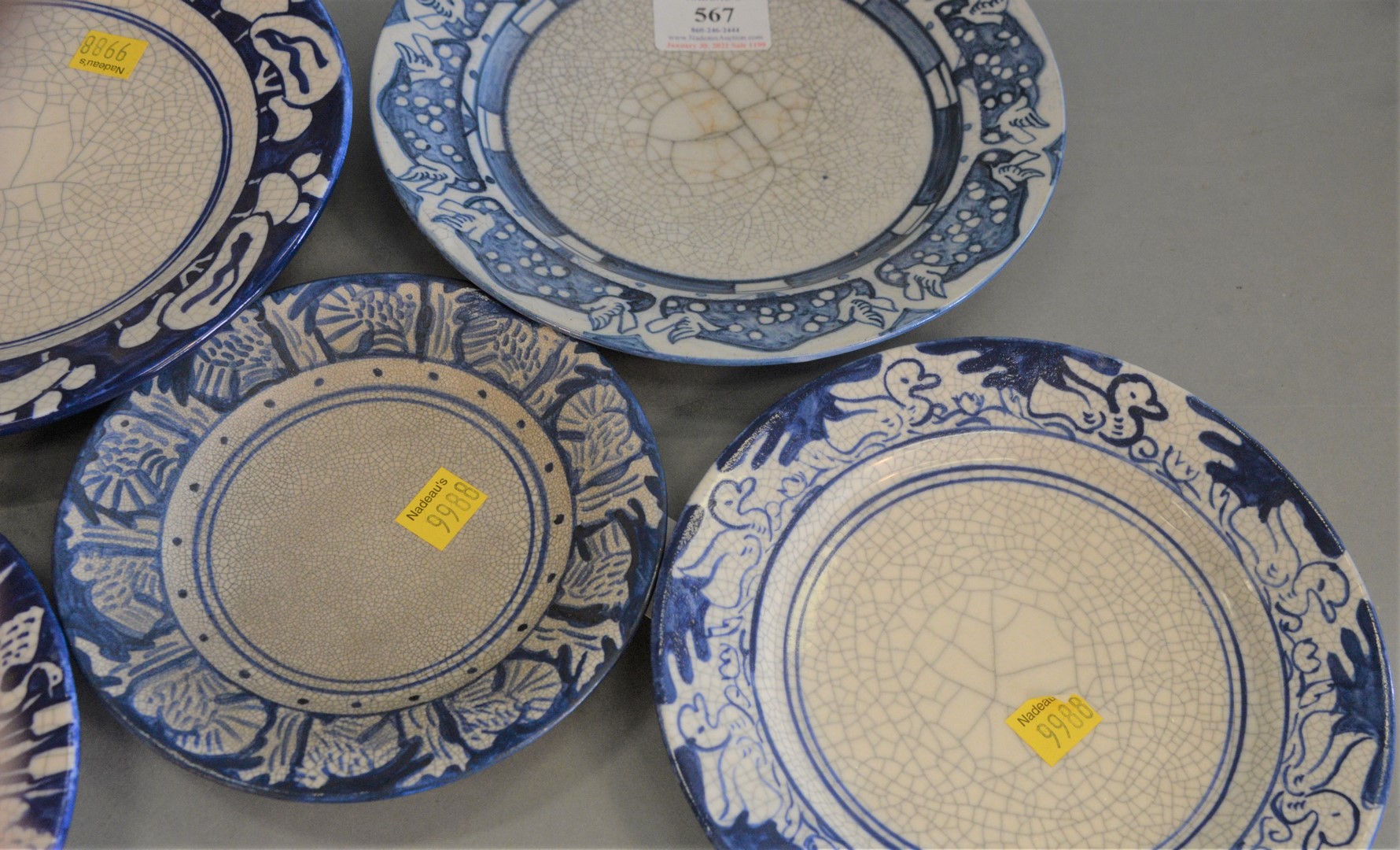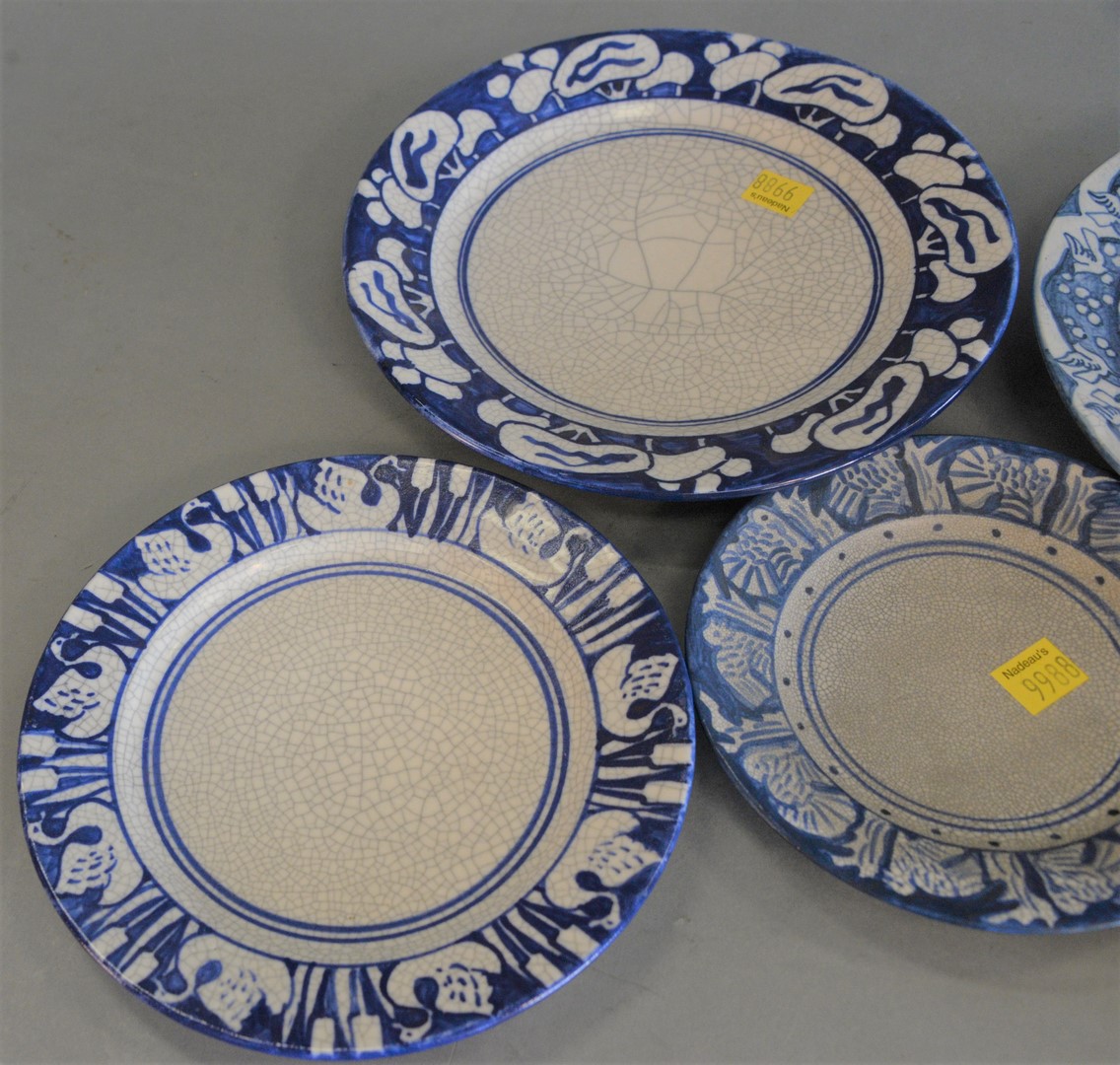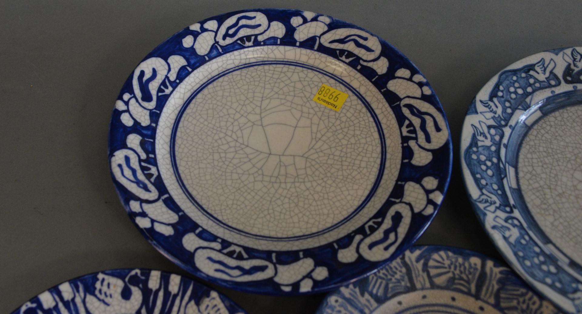 Lot 567: Group of Five Dedham Pottery Plates to include orange tree plate, snow tree plate, swan and cat-o-nine tails plate, small Thanksgivi…