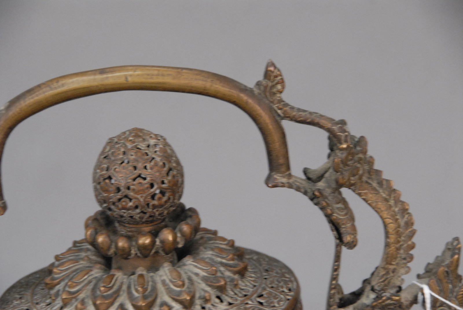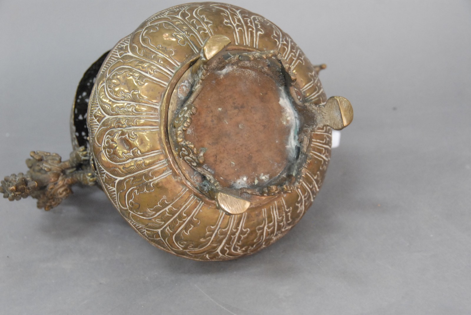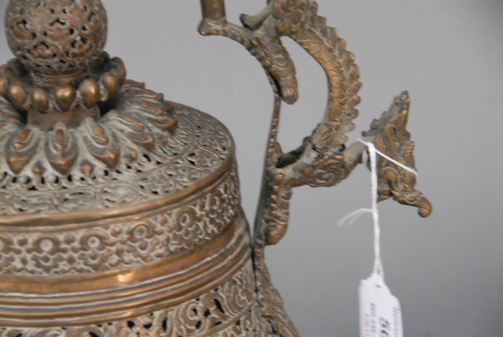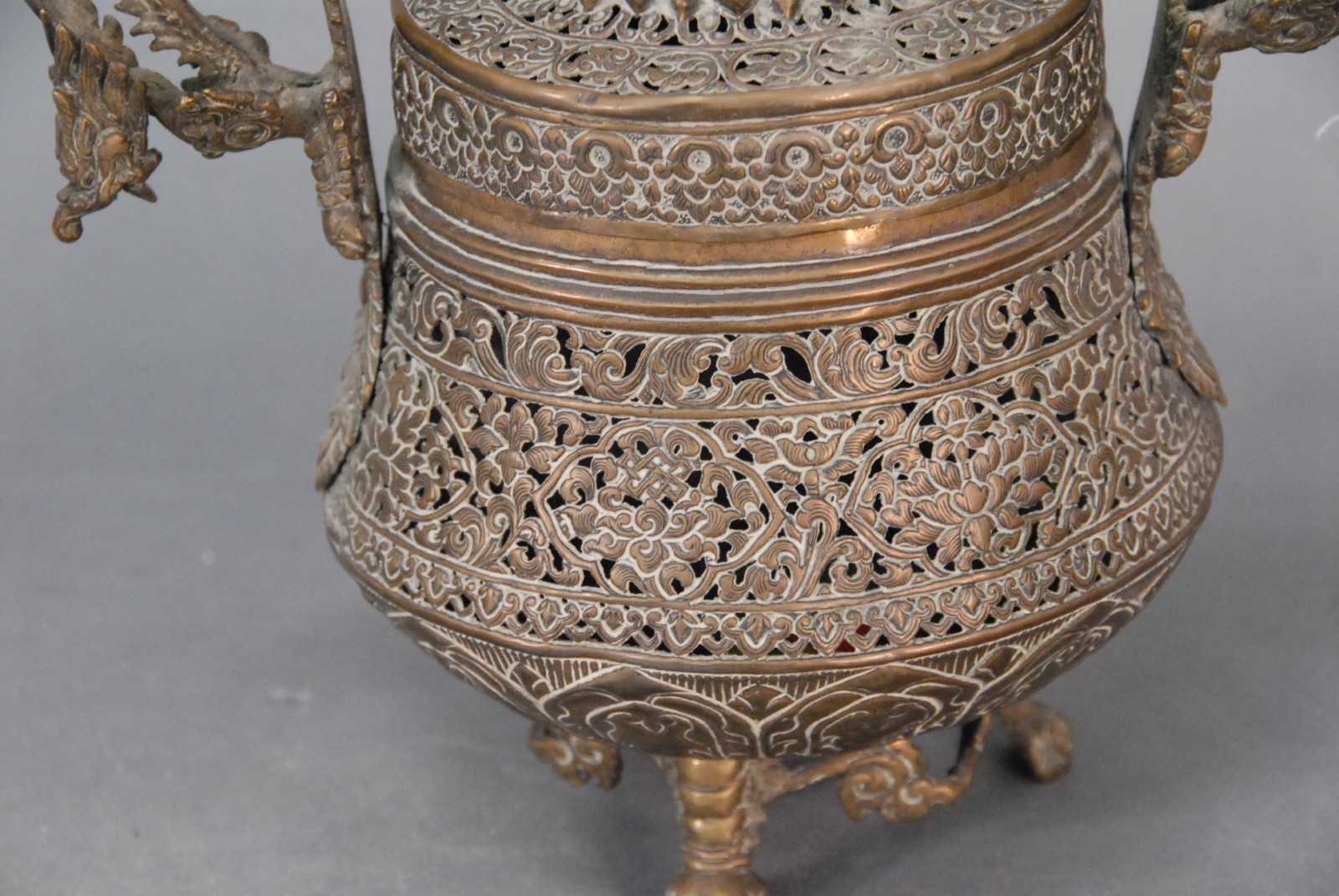Southeast Asian Thai reticulated copper standing tripod censer with pail handle.
