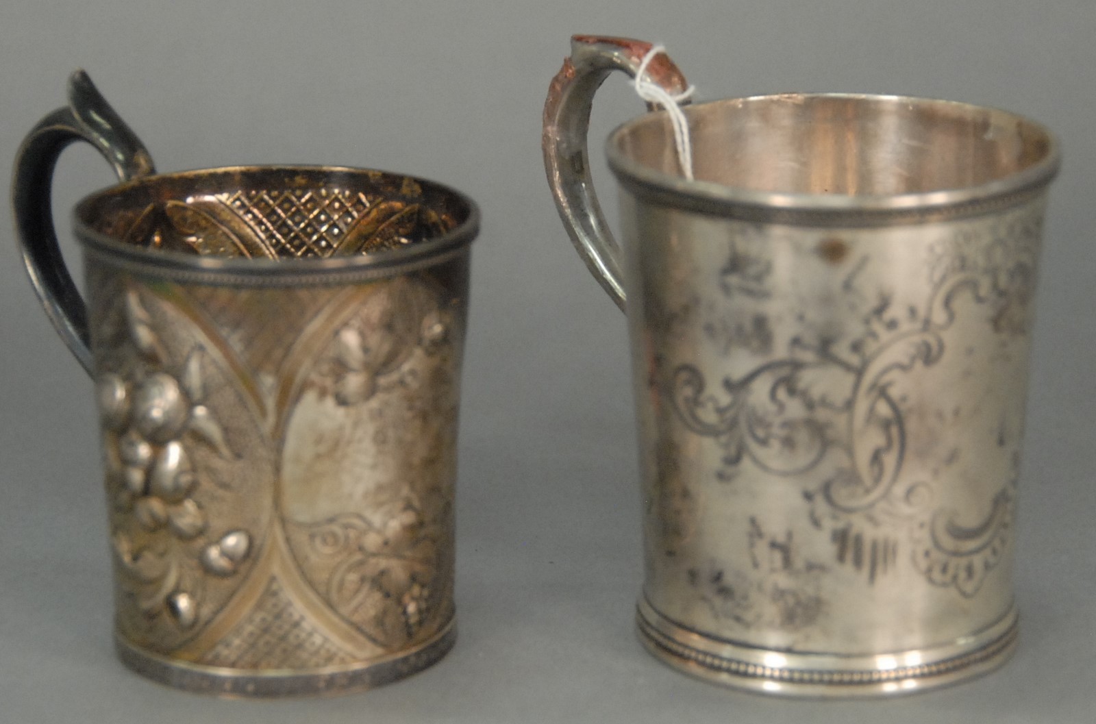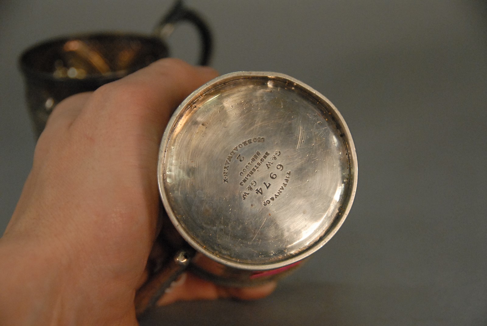 Lot 567: Two silver cups with handles, one marked Tiffany & Co 6974 G&W eng Sterling 925-1000 2 550 Broadway, NY and the other Gorham coin silver. 7.89 t oz.