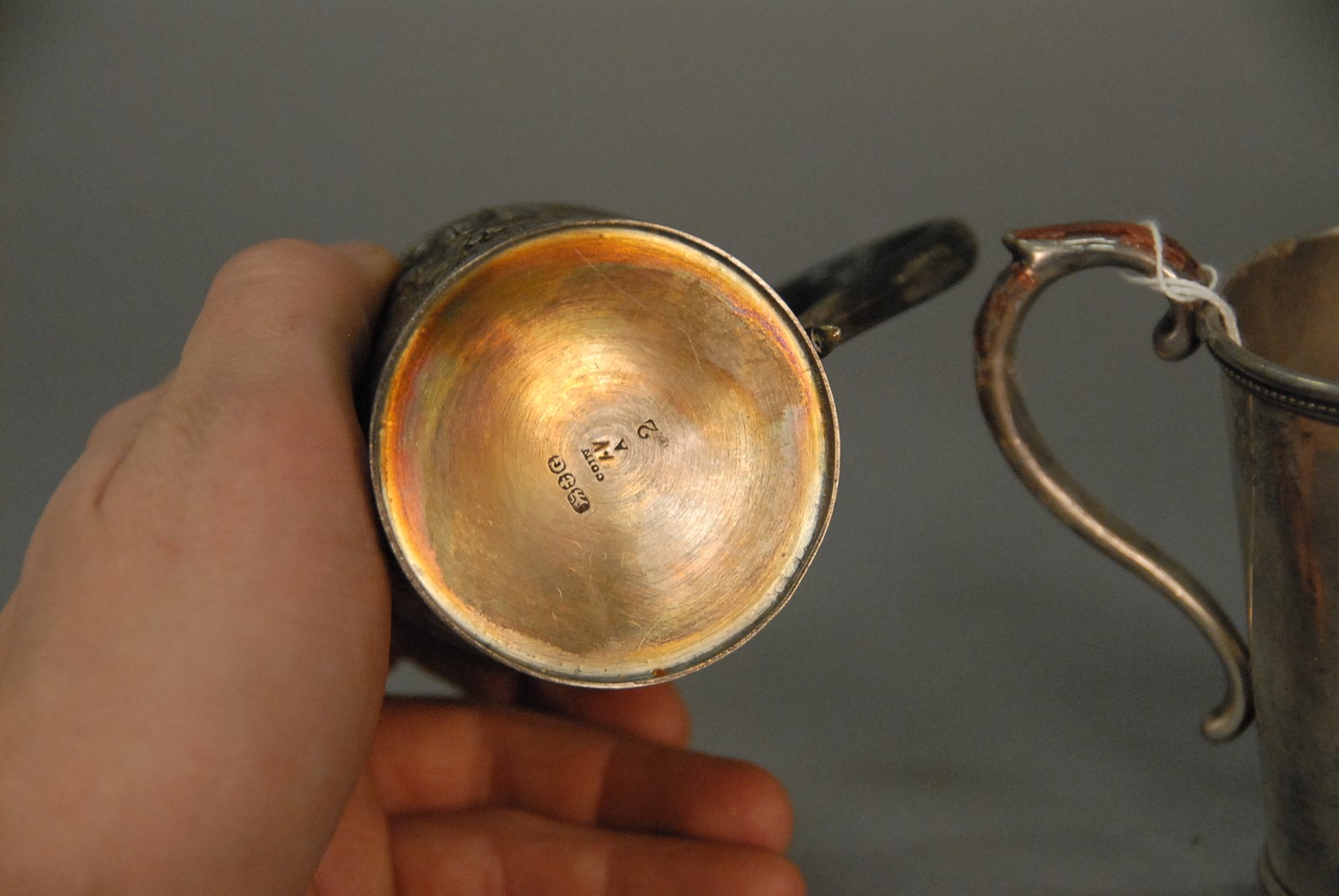 Two silver cups with handles, one marked Tiffany & Co 6974 G&W eng Sterling 925-1000 2 550 Broadway, NY and the other Gorham coin silver. 7.89 t oz.