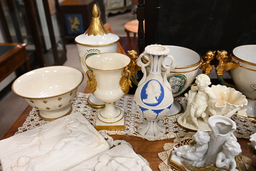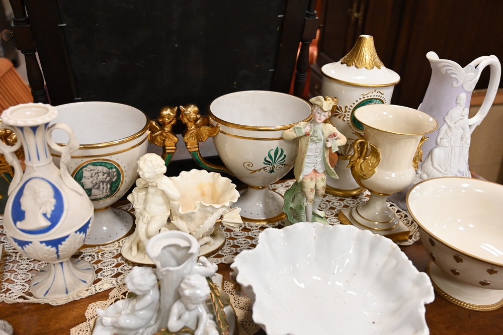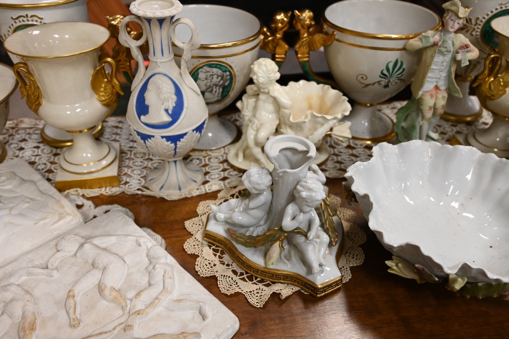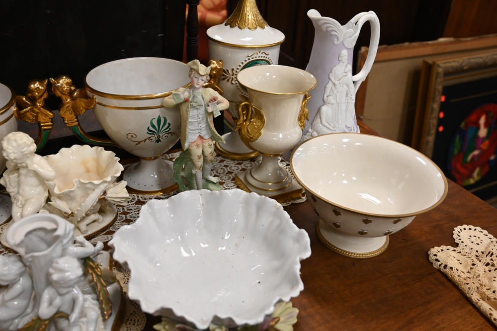 Lot 568: Assorted Group of Porcelain, to include a pair of Lenox compotes; two pairs of Italian urns; Moore porcelain figural compote; small flower vase with figure; Naomi & Her Daughter-In-Law pitcher, etc.