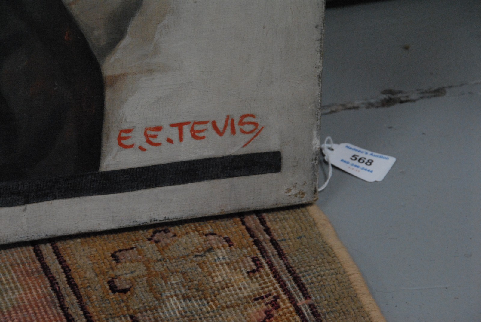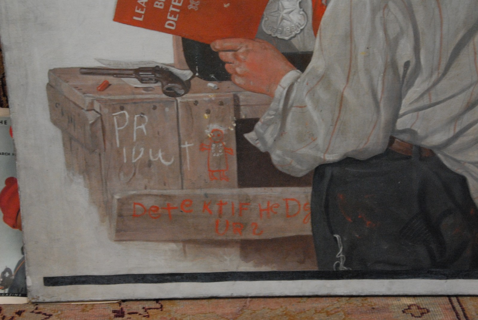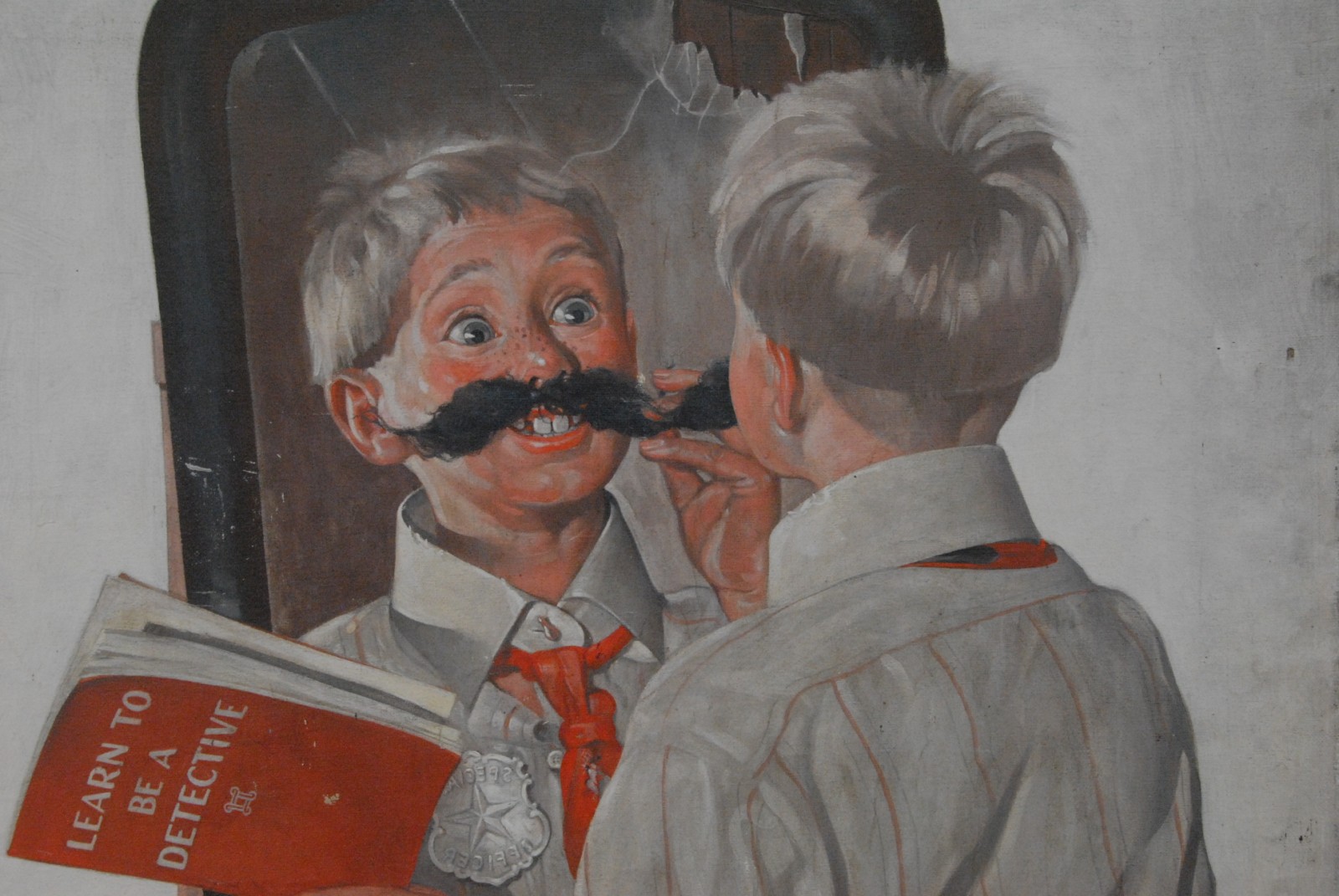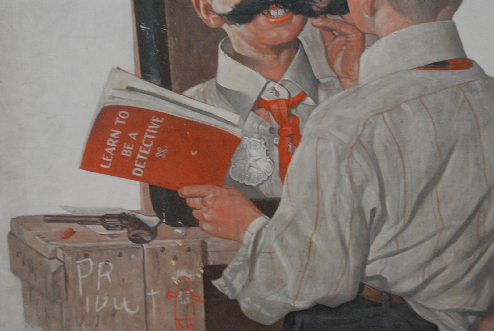 Edward E. Tevis BOY IN MIRROR READING BOOK, LEARN TO BE DETECTIVE illustrator art oil on canvas signed E.E. Tevis. Edward E. Tevis was associated with Auslew Gallery Norfolk VA. He was an illustrator and portraiture. He did magazine covers and illustrations for Saturday Evening post The Metropolitan The Telephone Bulletin Christian Herald Colliers and The Country Home 1930 – 1940’s.
