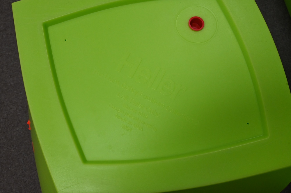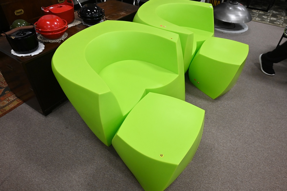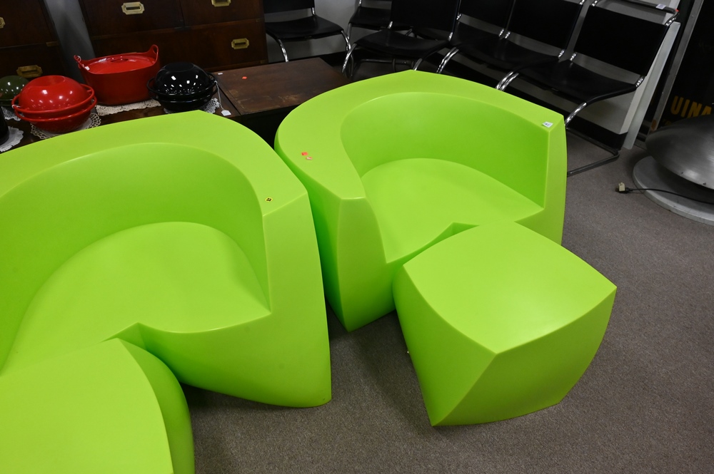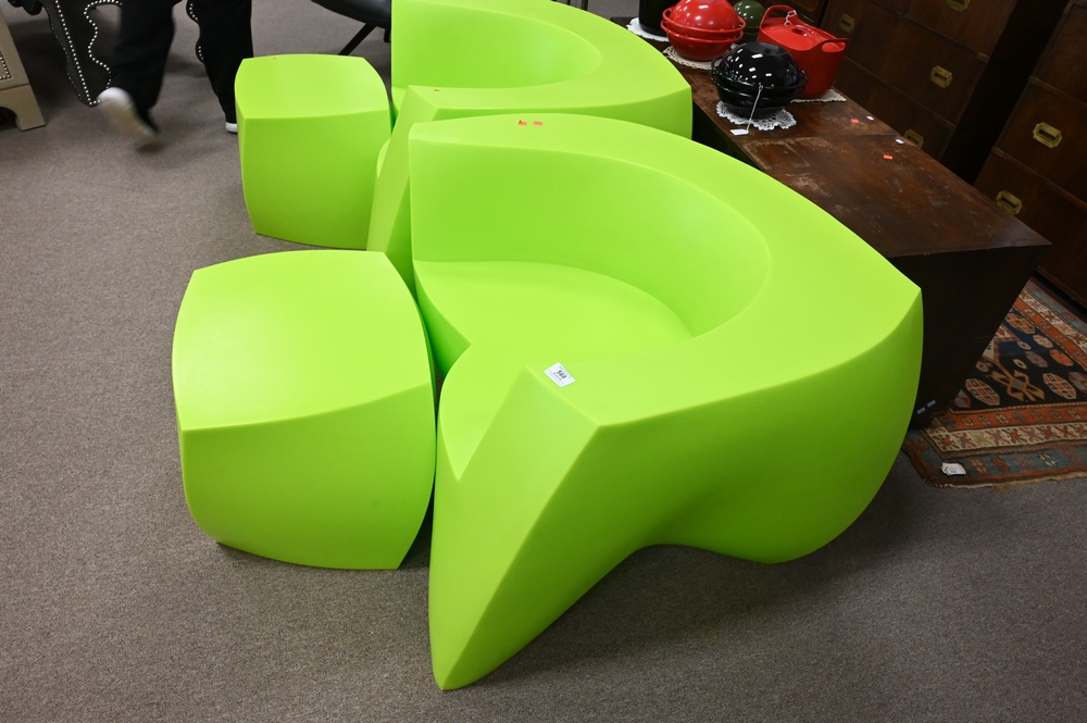Lot 568: Four Piece Set of Heller The Frank Gehry Furniture Collection, model 1020, with matching ottomans, height 25 inches, width 37 inches.