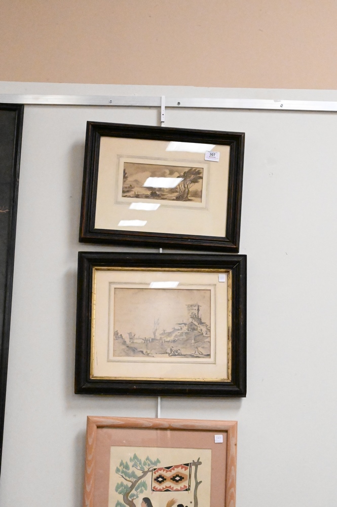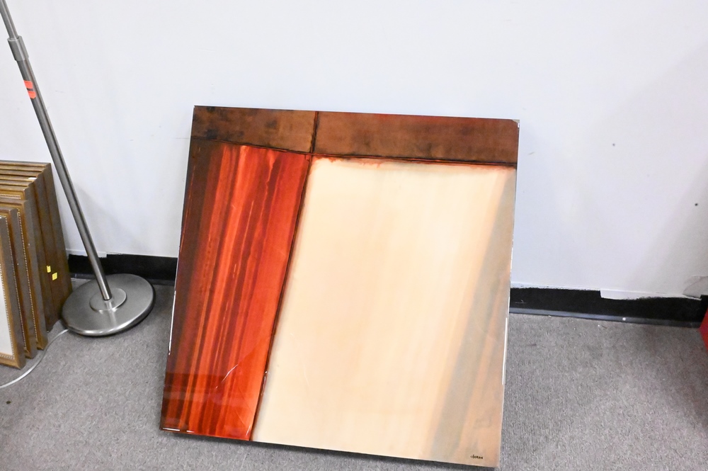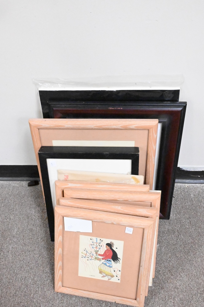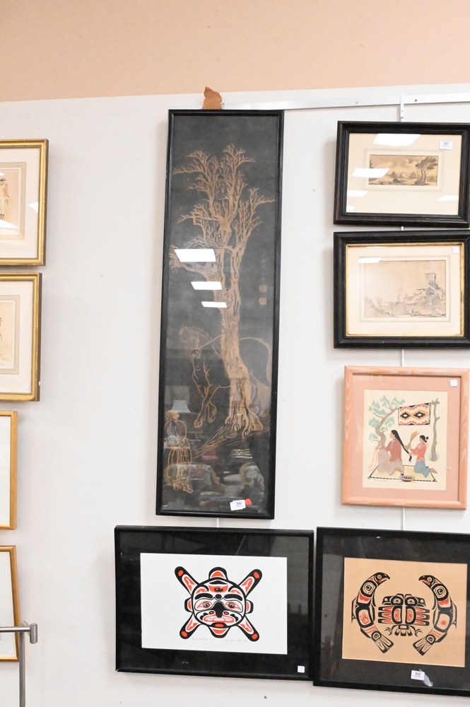 Lot 568: Large Framed Lot to include, large Japanese woodblock, depicting sage with magical horse, 13 1/4″ x 49″; assorted group of South American prints and lithographs, to include Danny Dennis, Salmon; Begay; Robert Chee; Kwa-Guilthsun John Nelson; King, eagle and salmon; largest 12″ x 19″; two early watercolors of landscapes, to include one of a castle with figures, 7″ x 9 1/2″; a wooded landscape, 3 3/4″ x 8 1/4″; unsigned, 18th or 19th century; along with Robert Charon (born 1958), acrylic on board, signed lower right, unframed, (chip to top right), 30″ x 30″