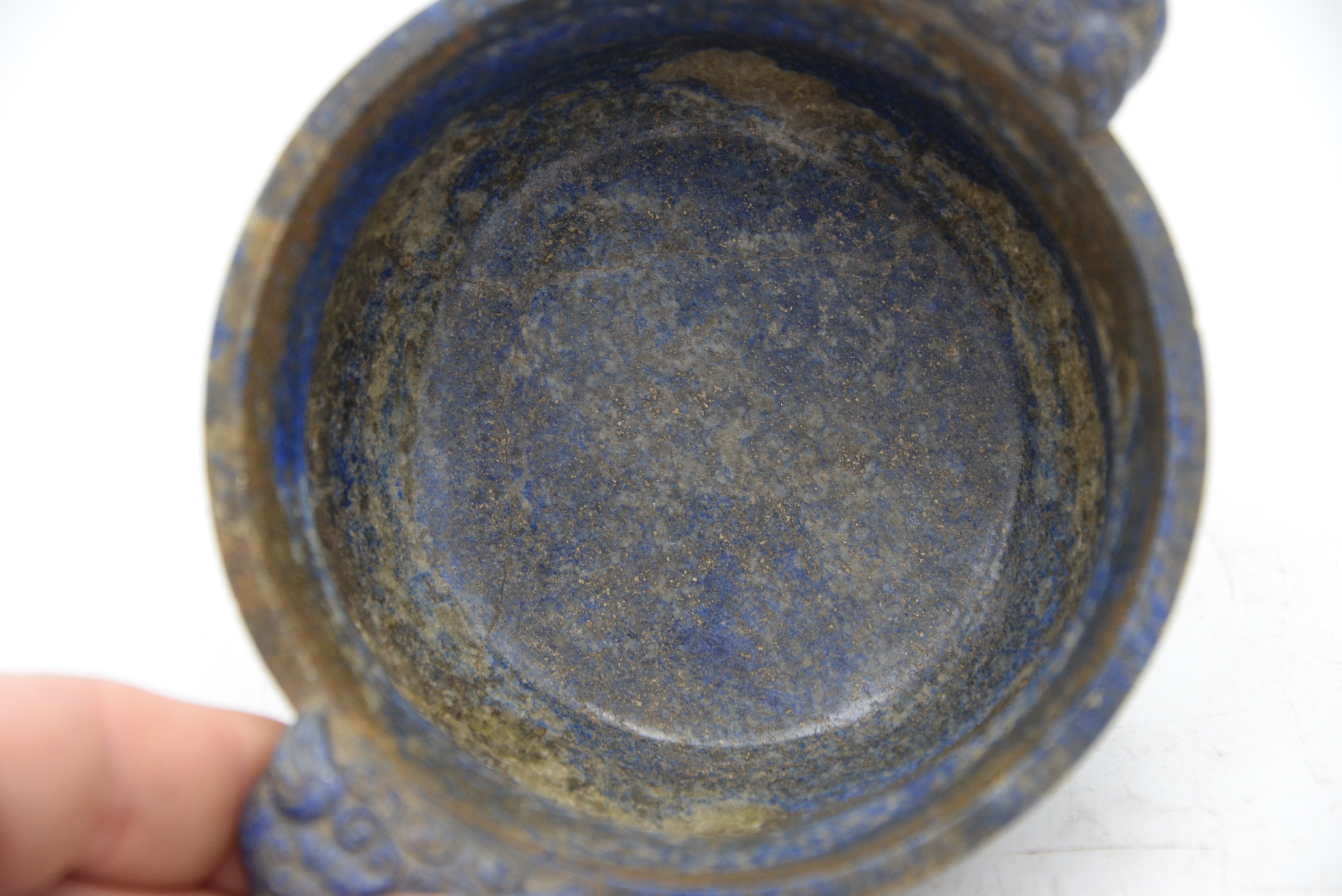 Chinese Lapis Lazuli Tripod Incense Burner, Ding, 18th century, compressed body supported by three stylized paw feet, rectangular openwork handles with carved foo lion terminals, arved with low relief band of paris of confronted scrolling Gui dragons, height 2 3/4 inches, diameter 5 inches.