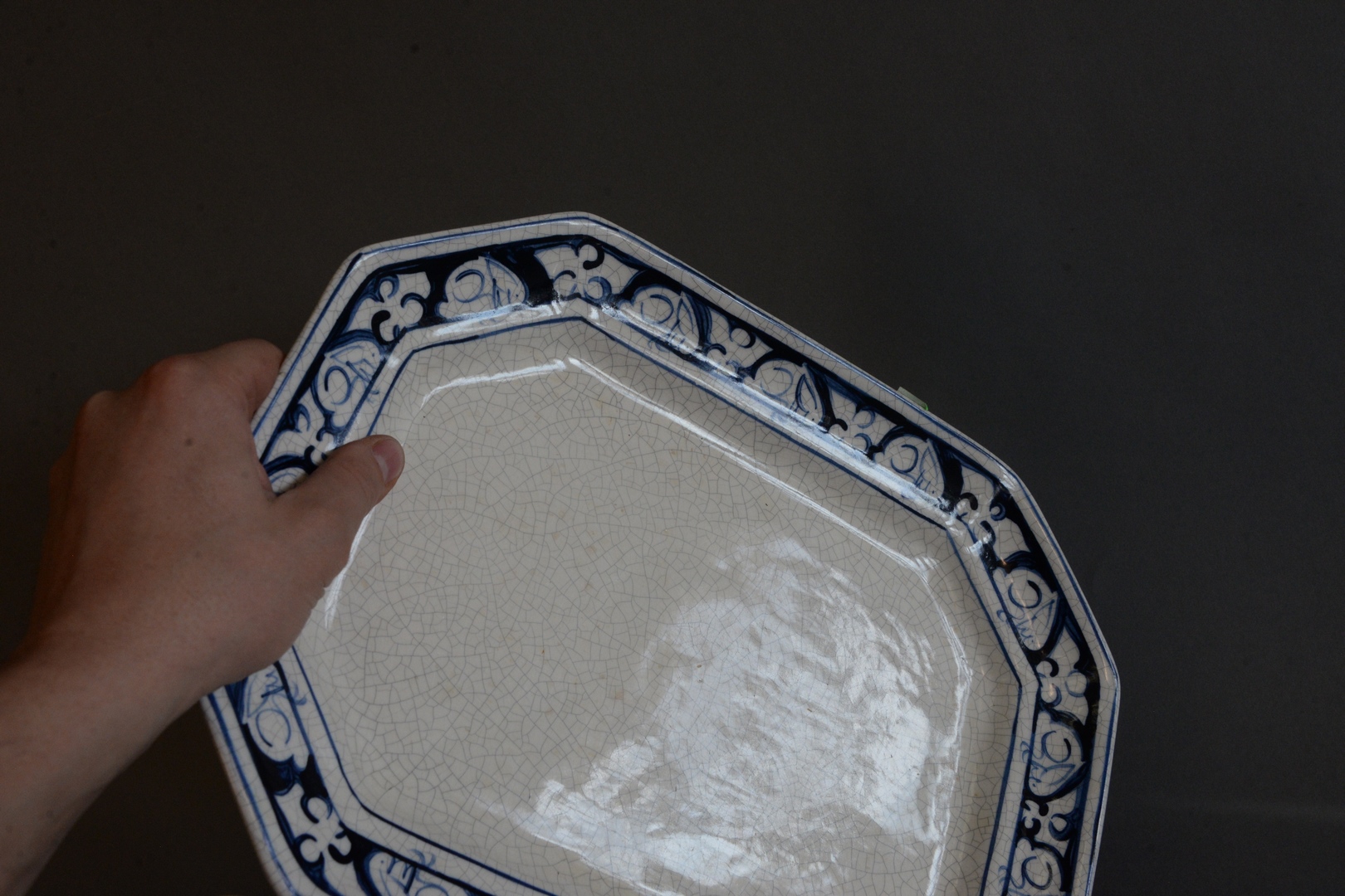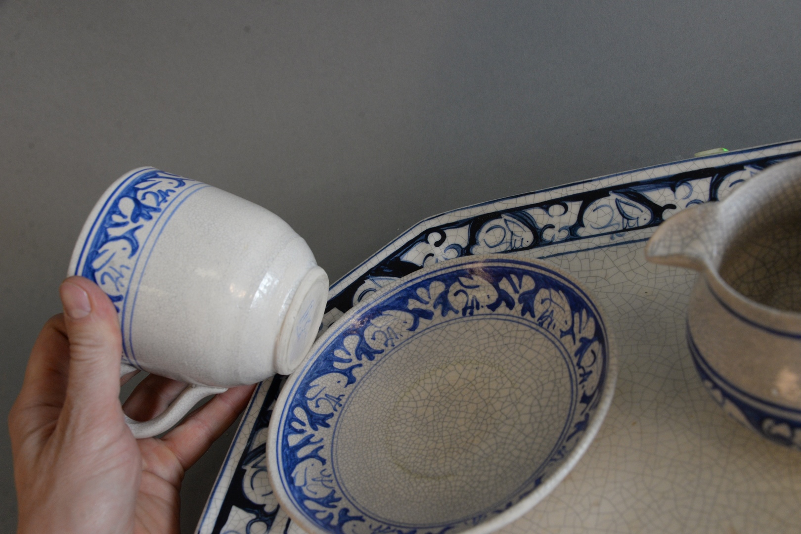 Lot 569: Dedham Pottery Four Piece Lot to include one serving platter, one small dish, one gravy and one mug all with a crackle glaze, each m…