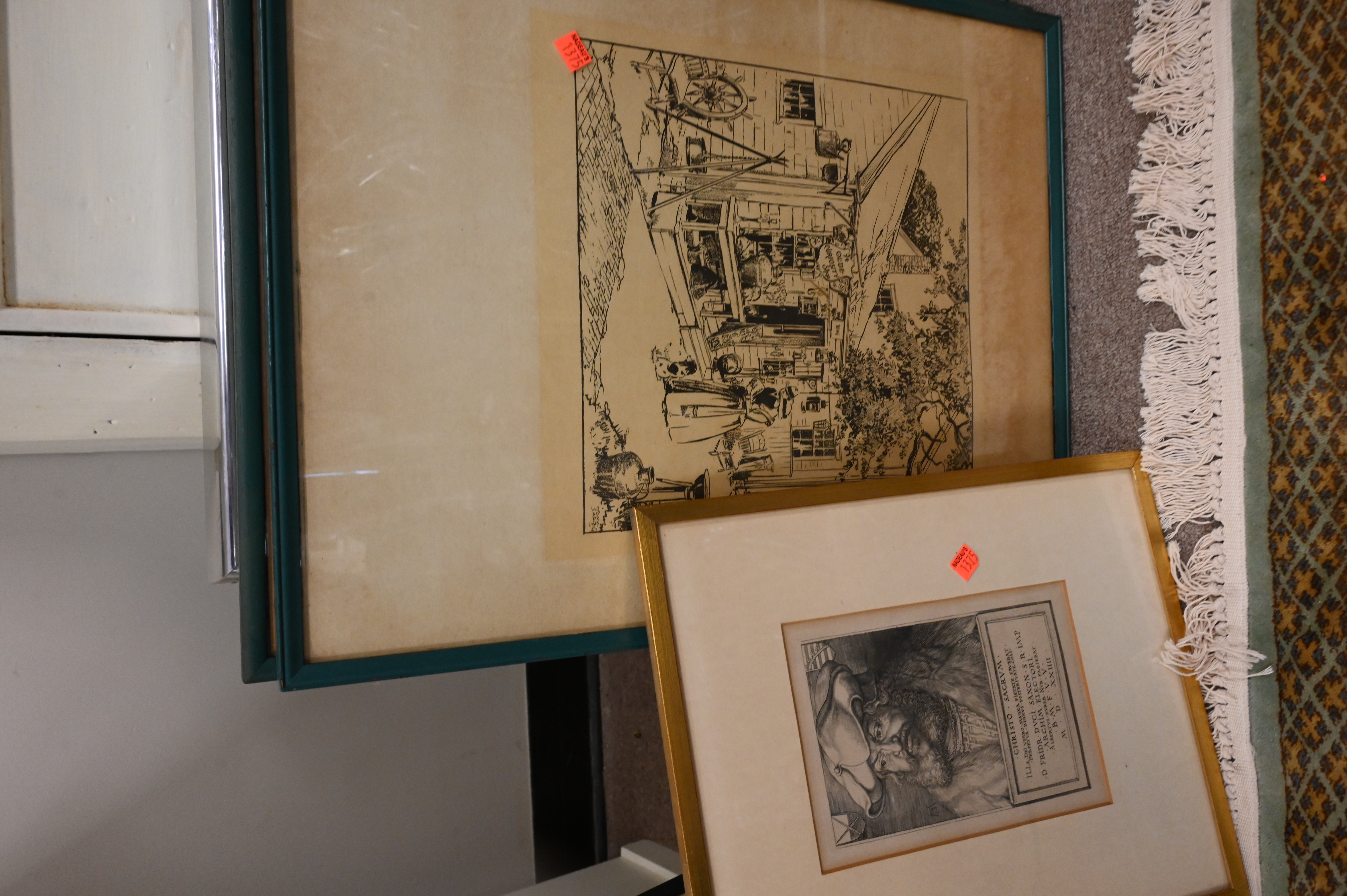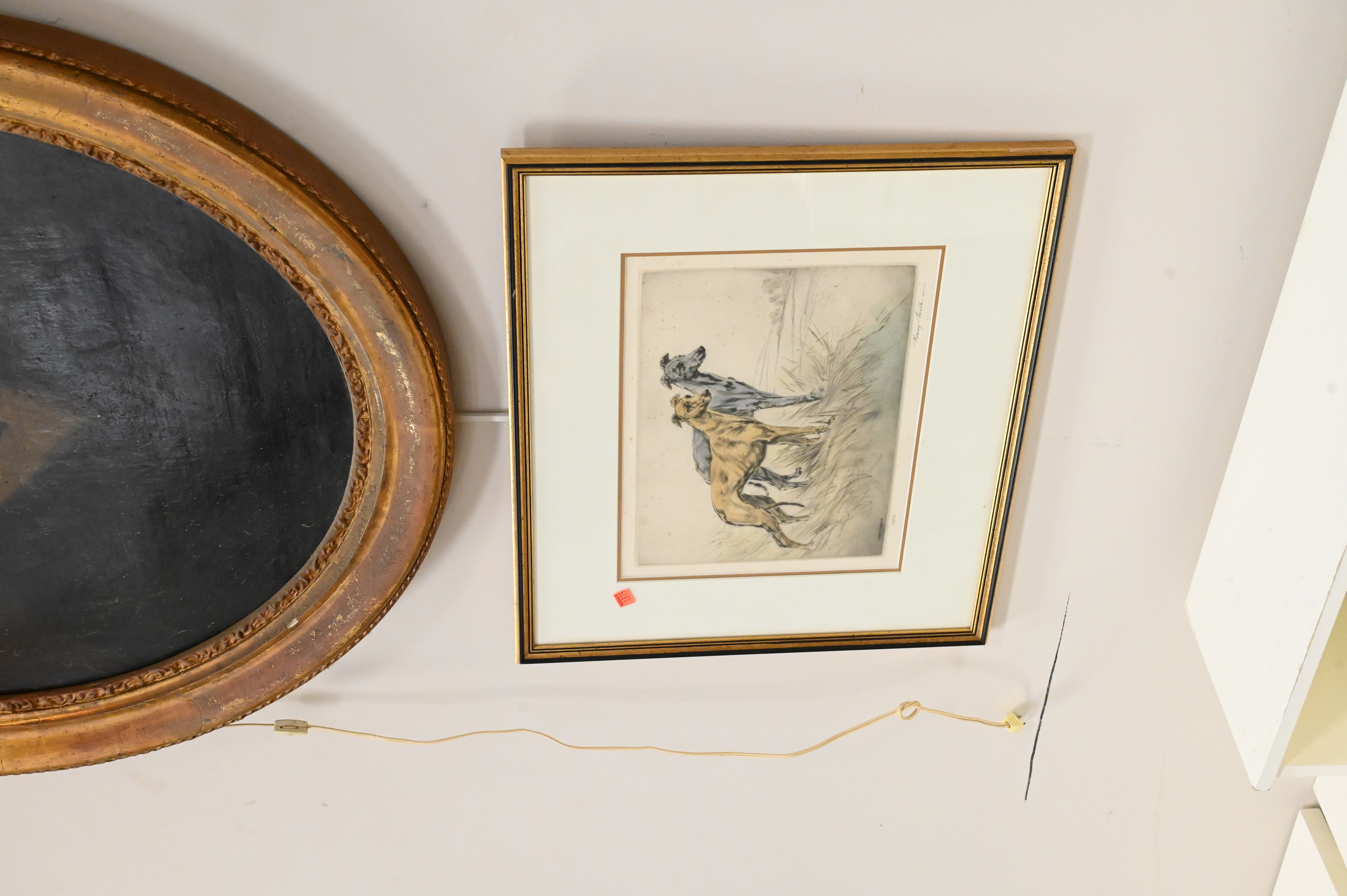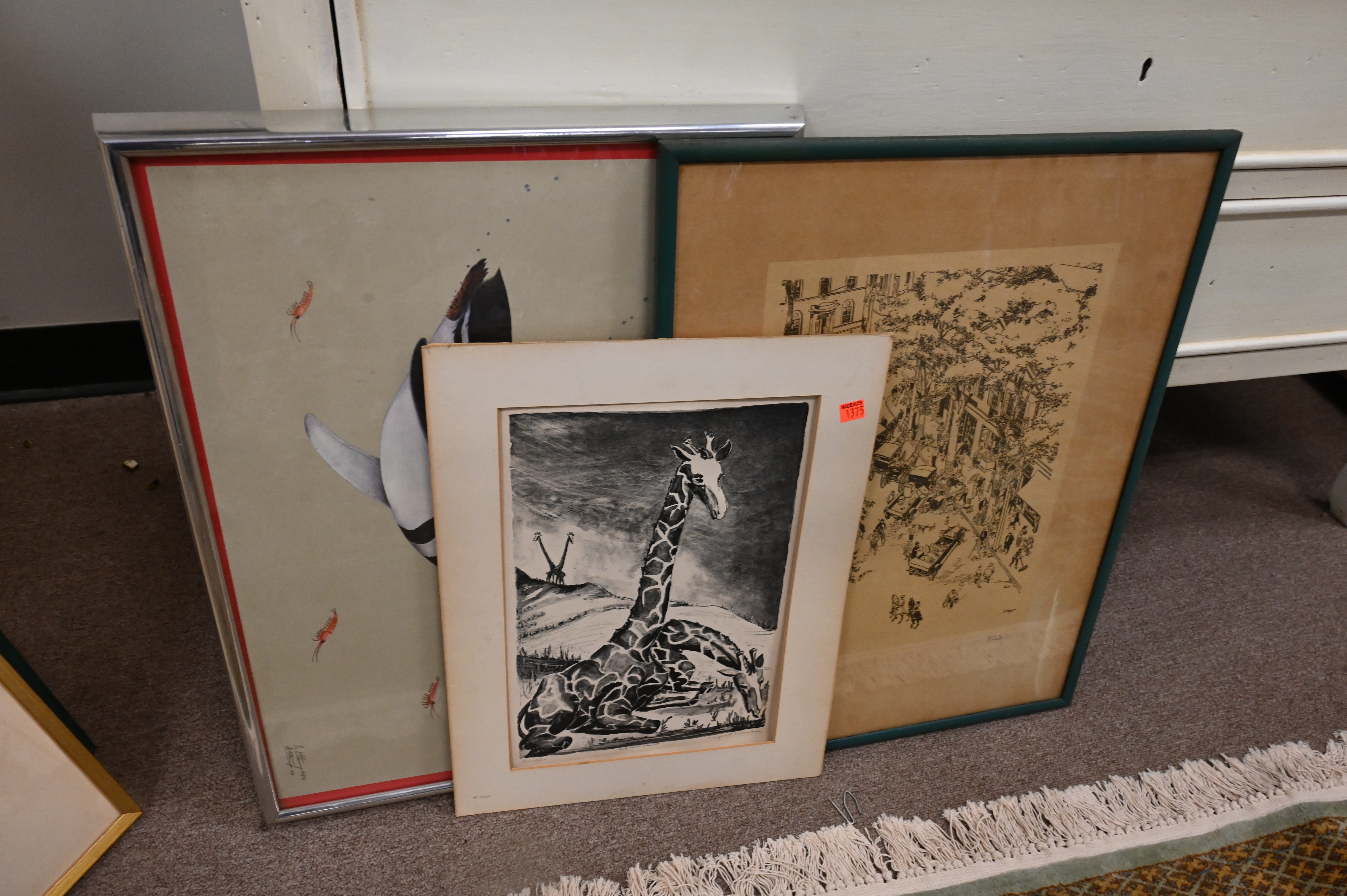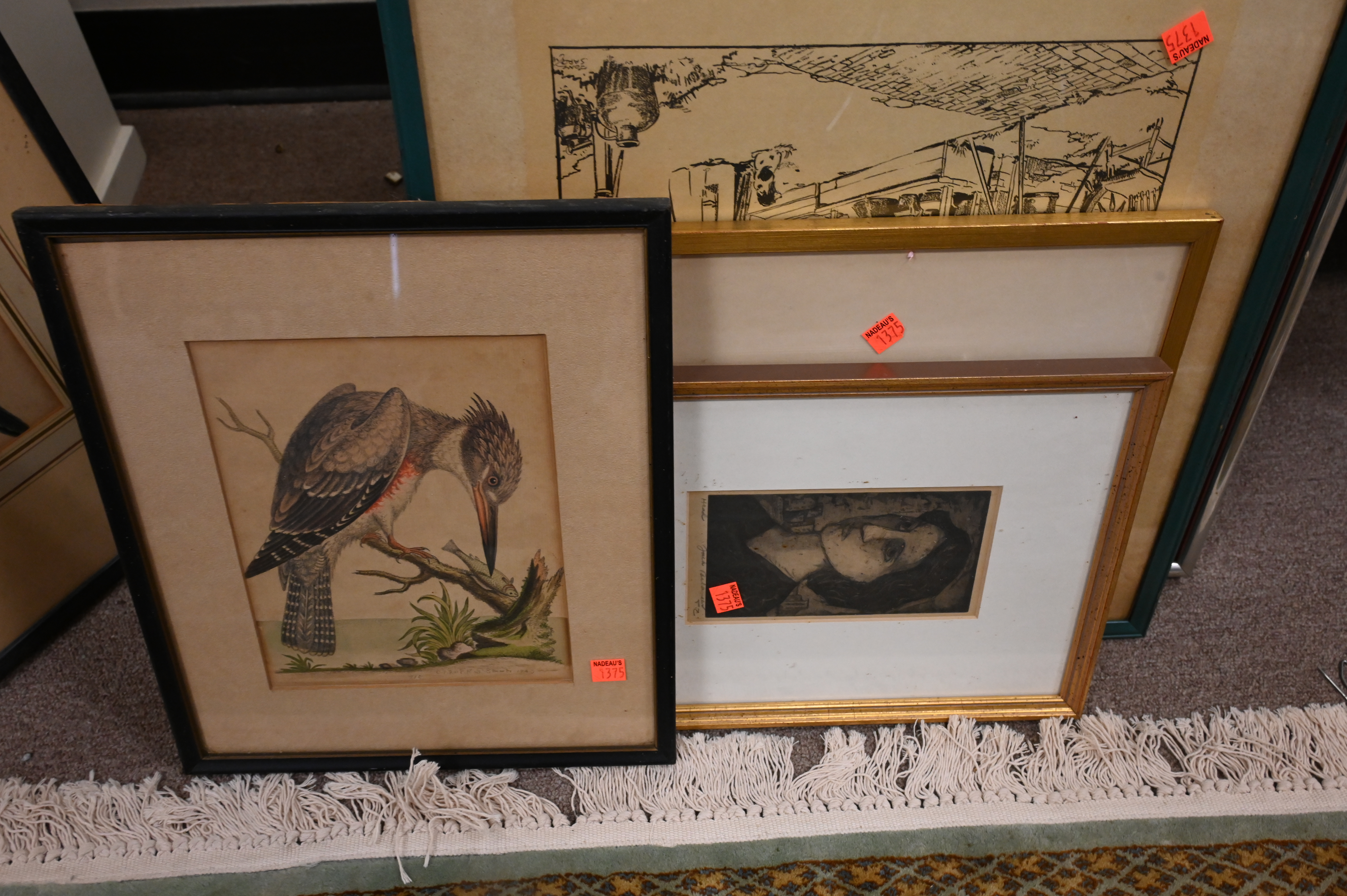 Group of 16 Framed Pieces, Margaret Sussman giraffe print, two mont sarg prints, head etching by Josh ___, Durand engraving, Upupidae Walton bird lithograph, Edwards bird lithograph, fish fossil, Henry Wilkinson aquatint, print of a seal, two colored pencil drawings signed illegibly, catch of the day, rabbit and squirrel, two small 19th century portraits of a young man and girl, Provenance: Estate of Cyril H. Moore Jr, Kent, Connecticut.