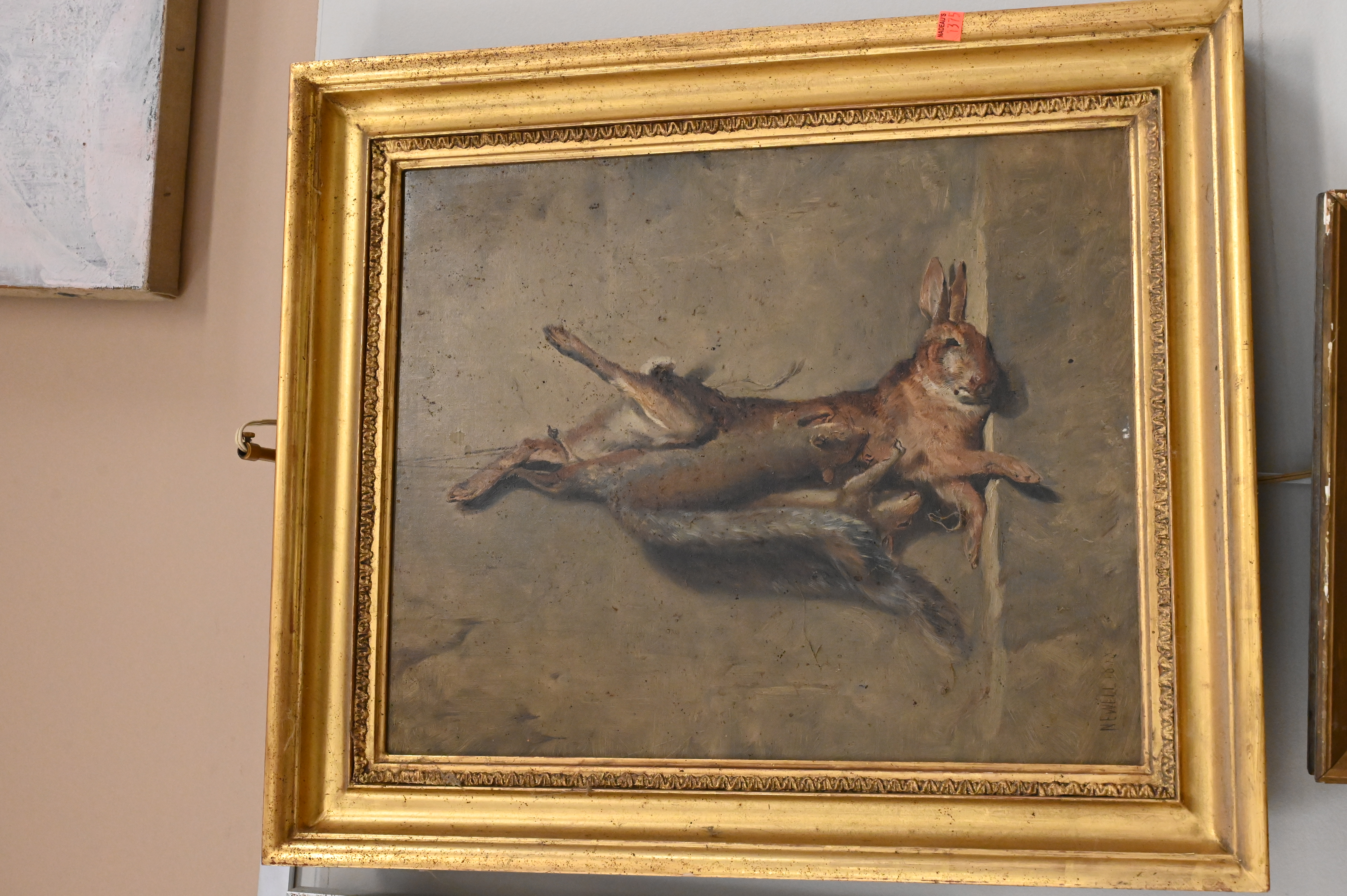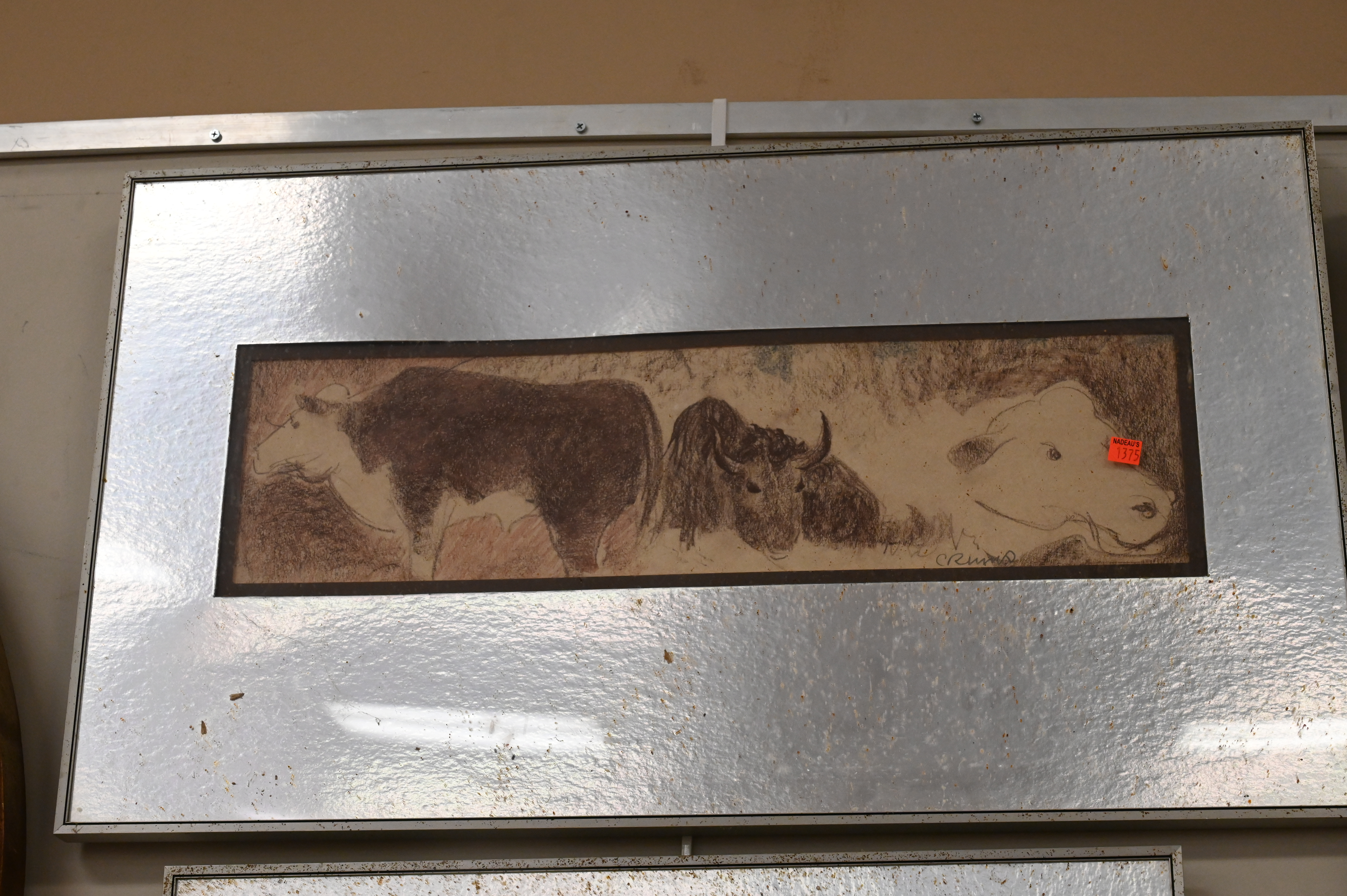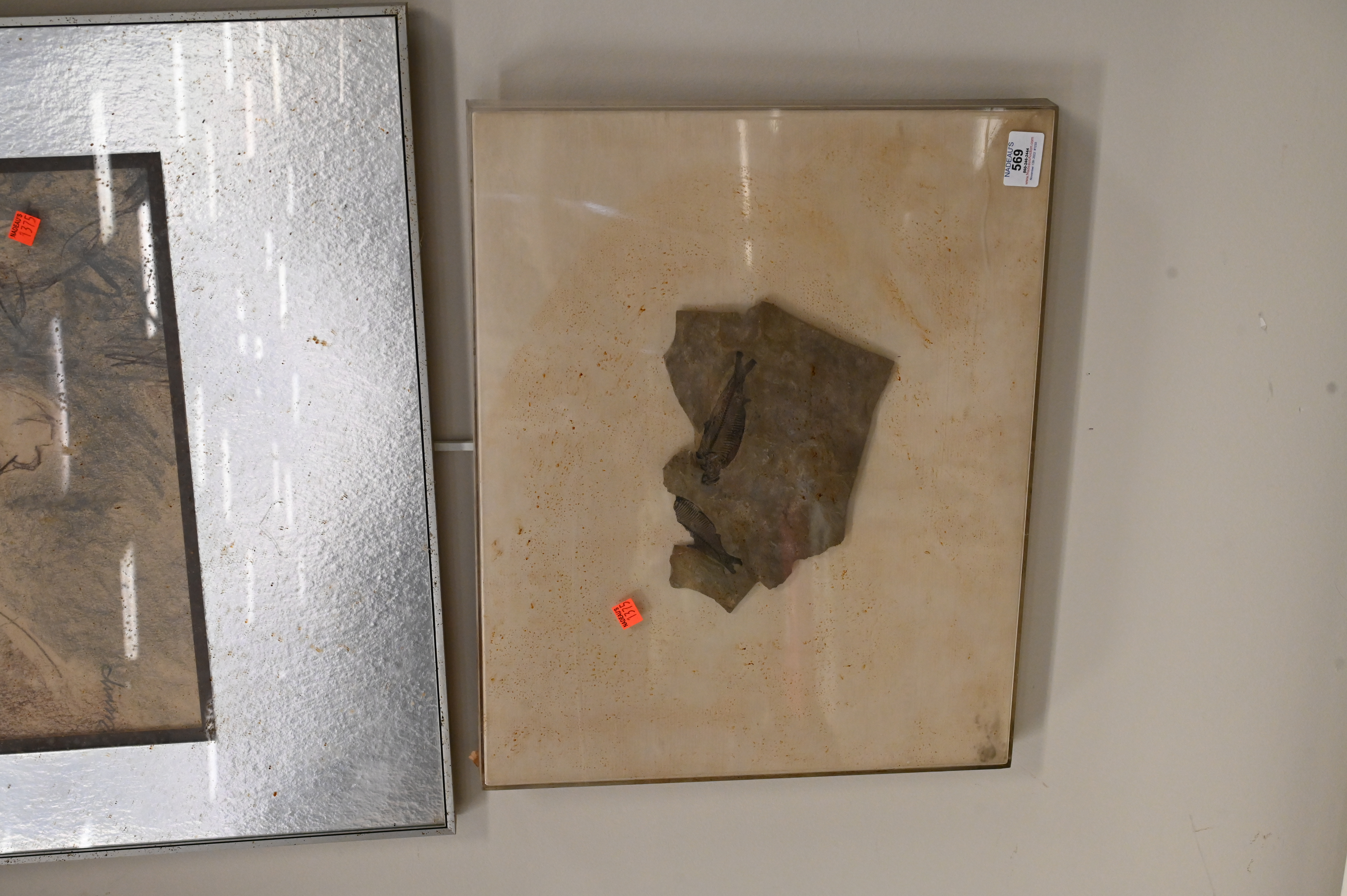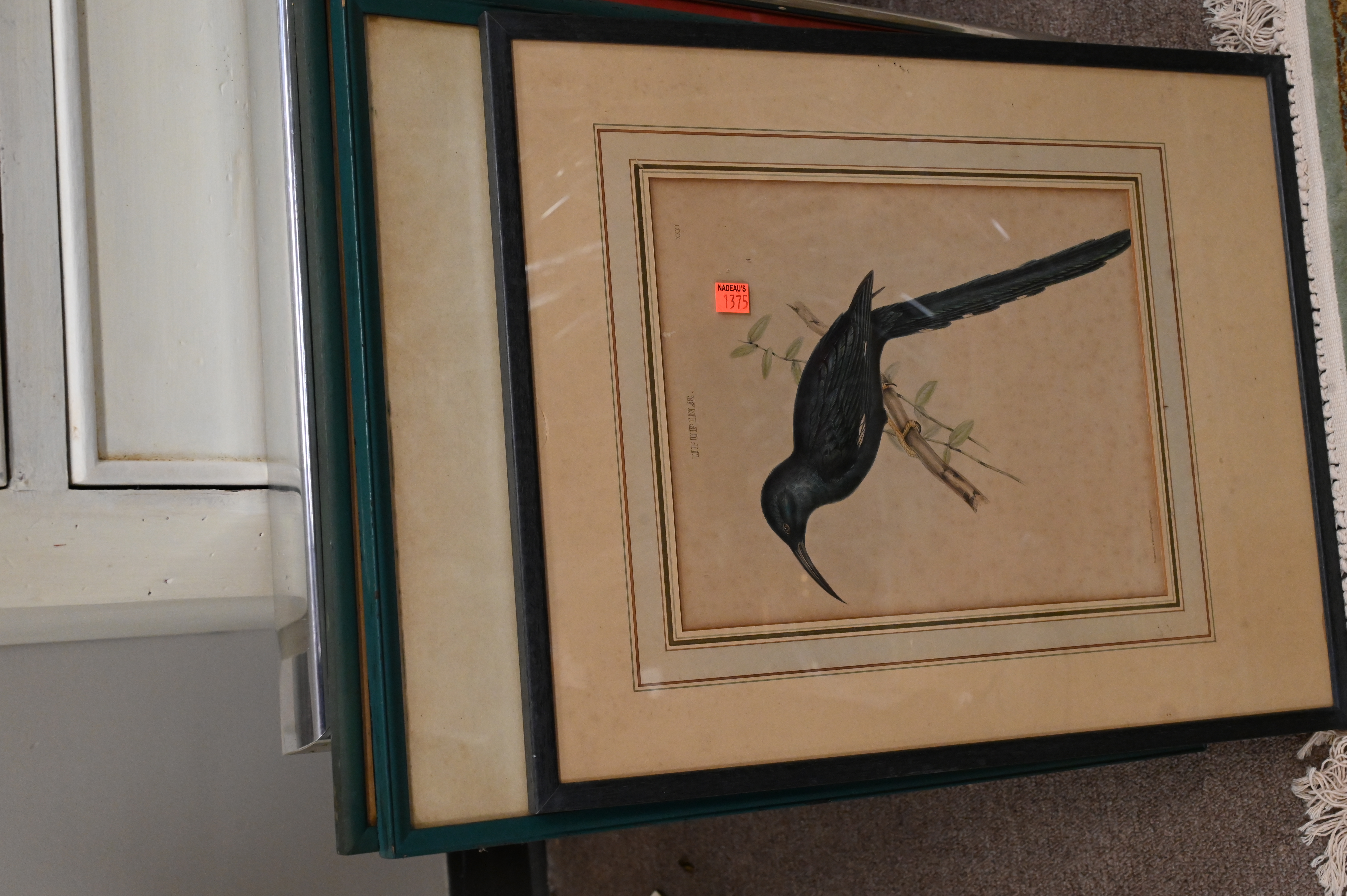 Group of 16 Framed Pieces, Margaret Sussman giraffe print, two mont sarg prints, head etching by Josh ___, Durand engraving, Upupidae Walton bird lithograph, Edwards bird lithograph, fish fossil, Henry Wilkinson aquatint, print of a seal, two colored pencil drawings signed illegibly, catch of the day, rabbit and squirrel, two small 19th century portraits of a young man and girl, Provenance: Estate of Cyril H. Moore Jr, Kent, Connecticut.