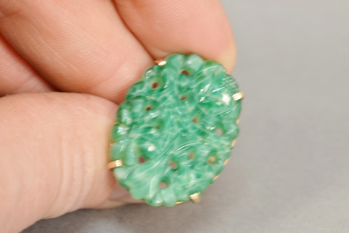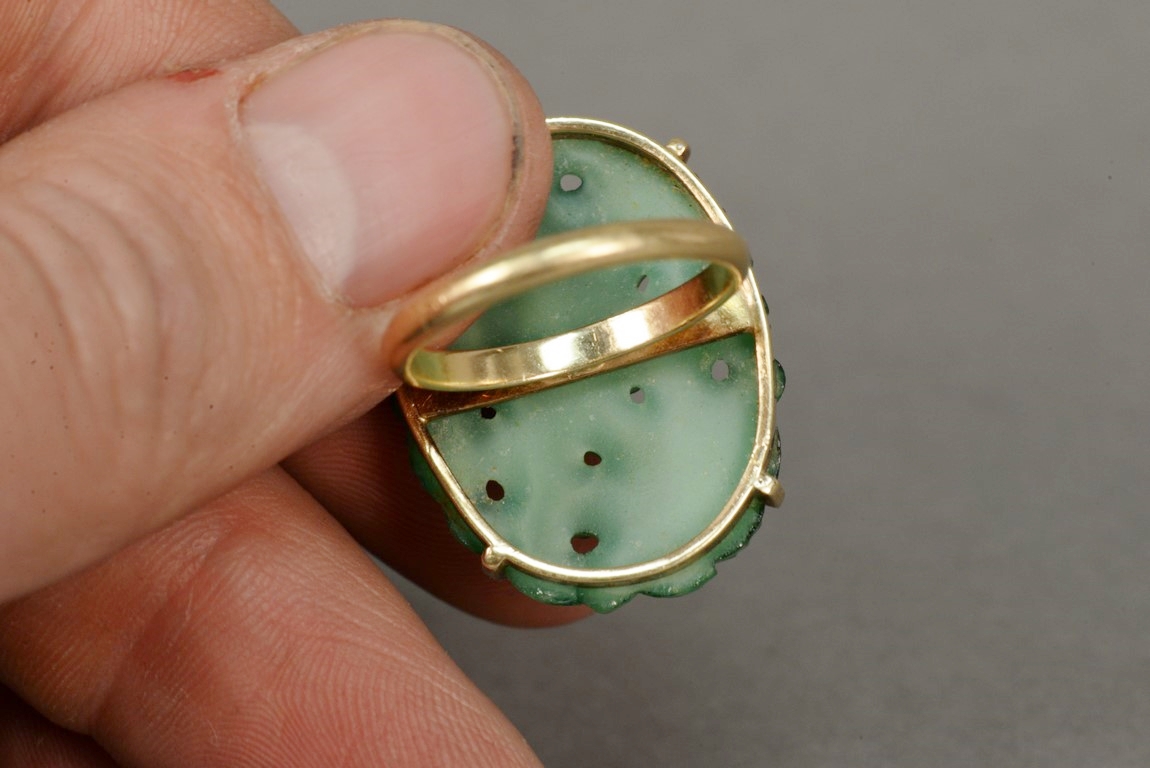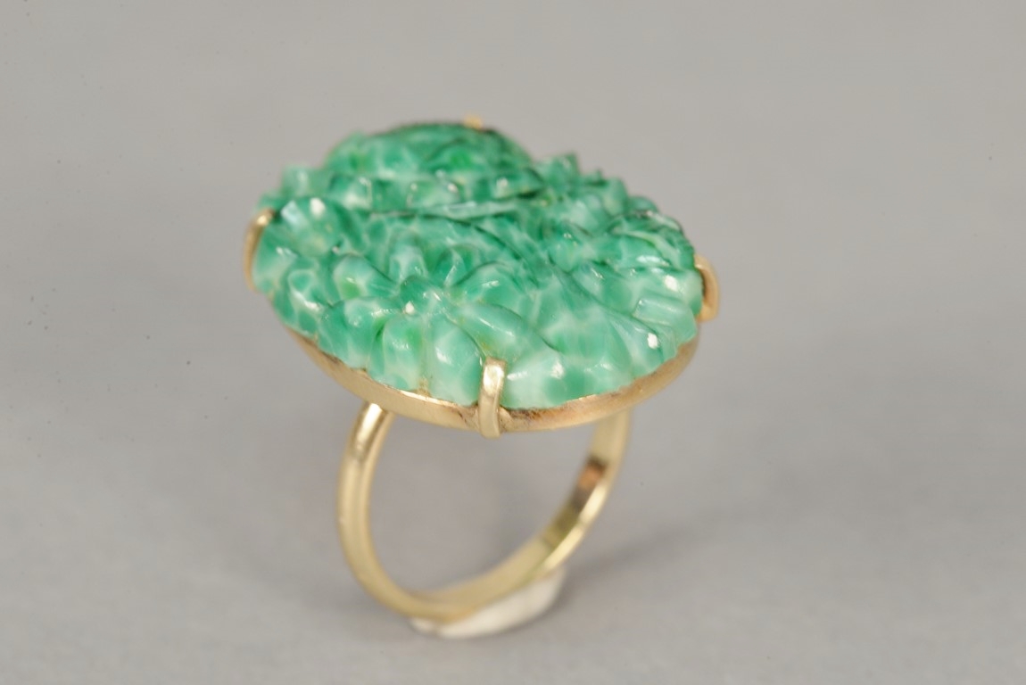 Lot 57: 14K gold ring set with oval pierced carved floral stone. 7/8 x 1 1/8
