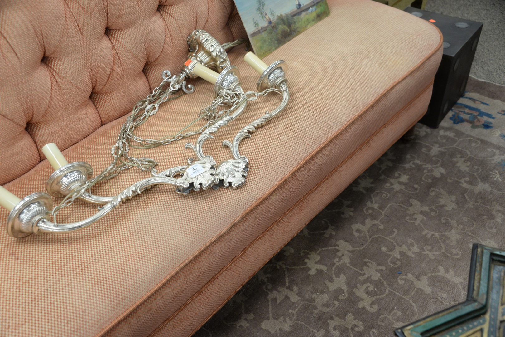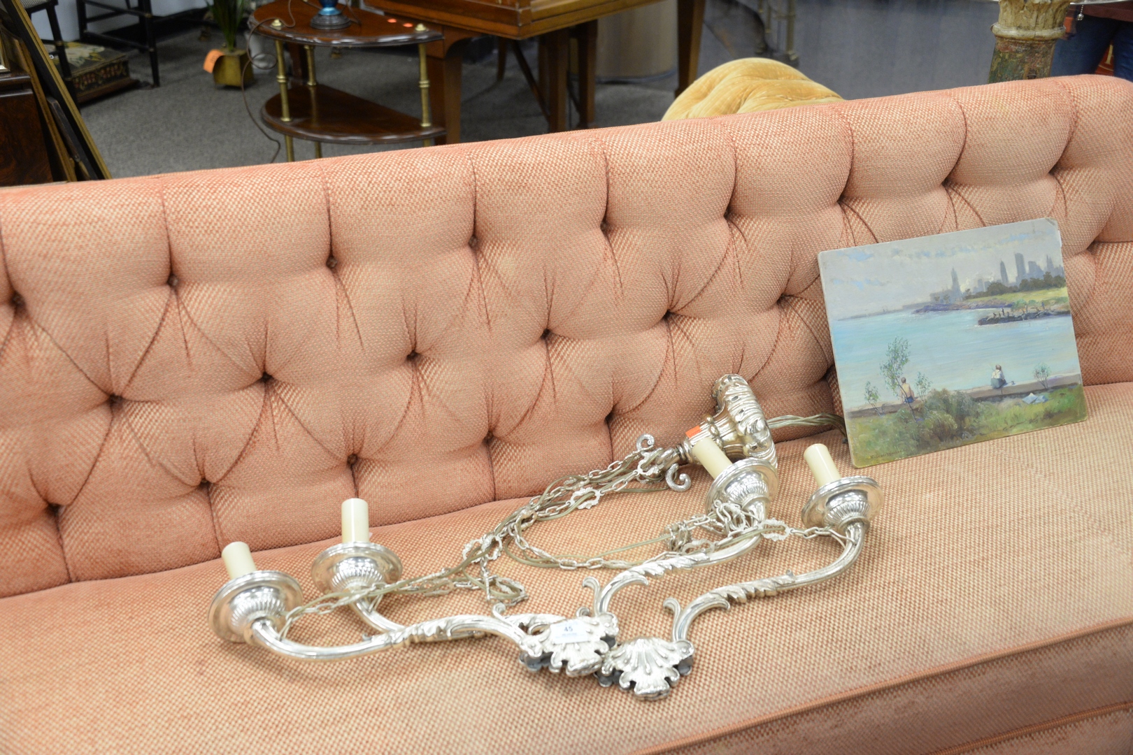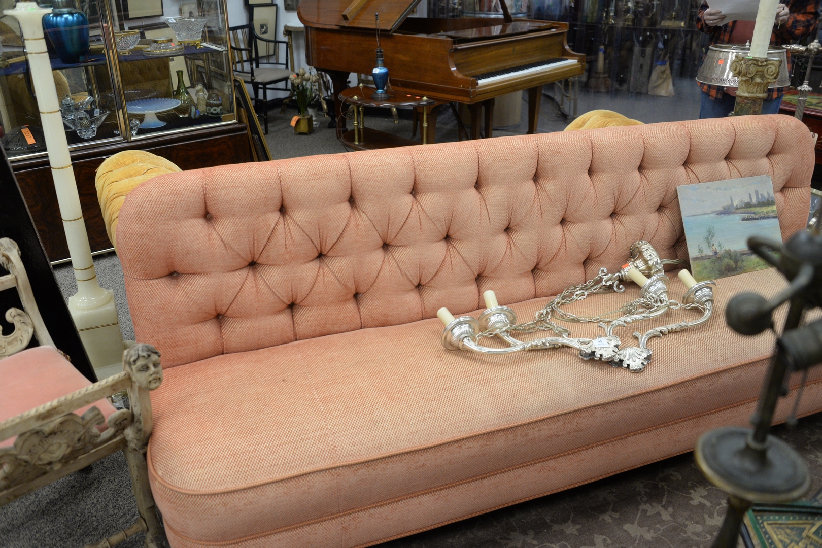 Armless Custom Upholstered Sofa, having tufted back, length 88 inches, height 36 inches.