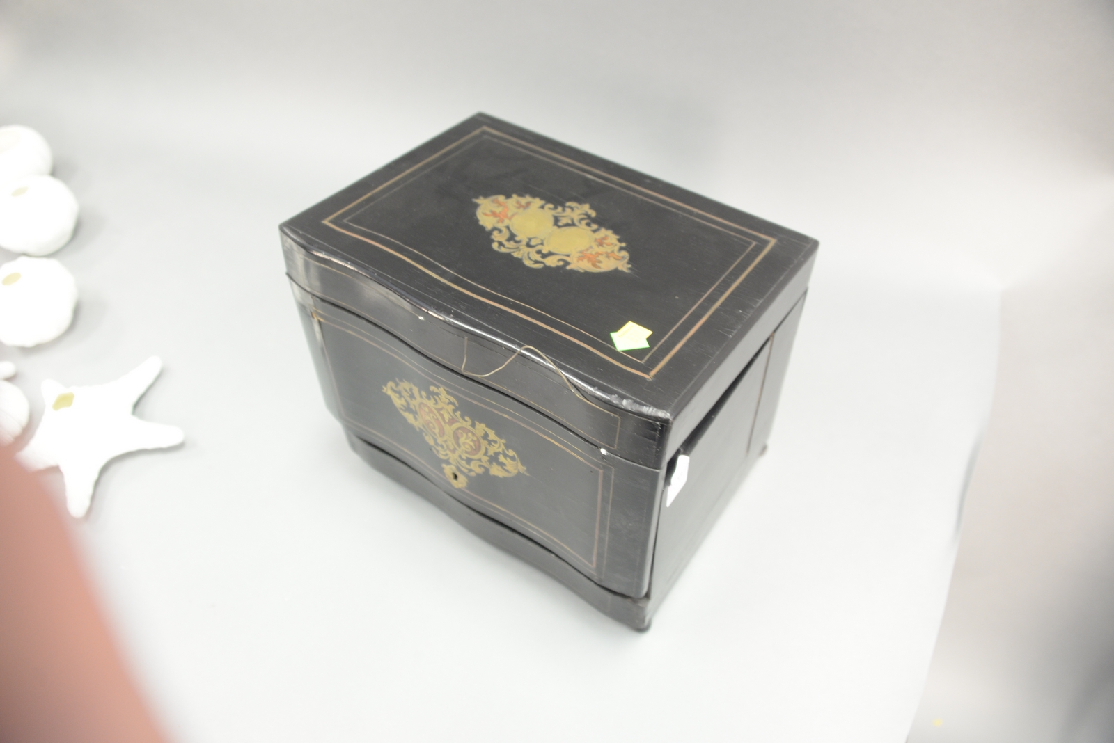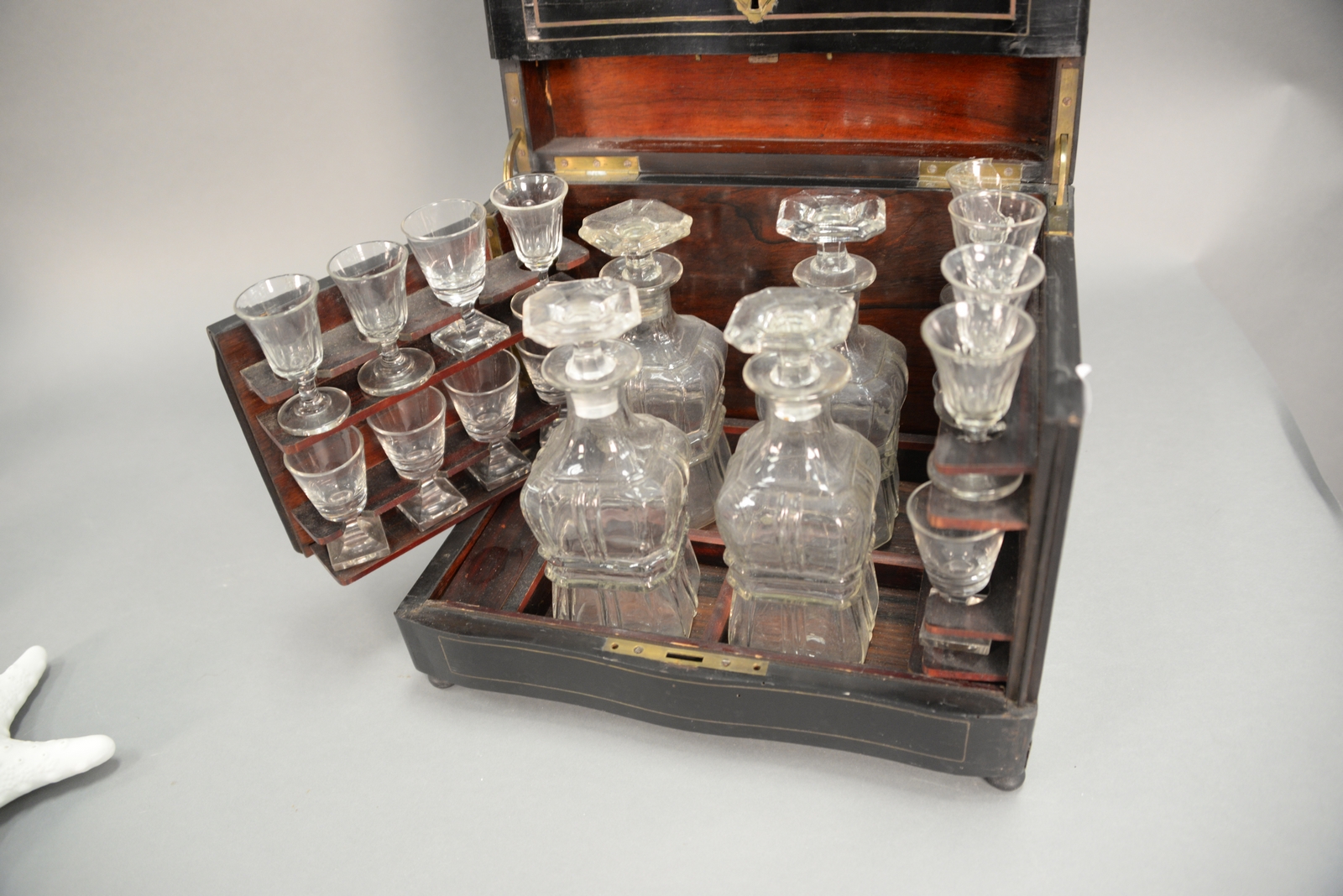 Brass inlaid ebony and rosewood tantalus set with four decanters and 16 stemmed glasses.