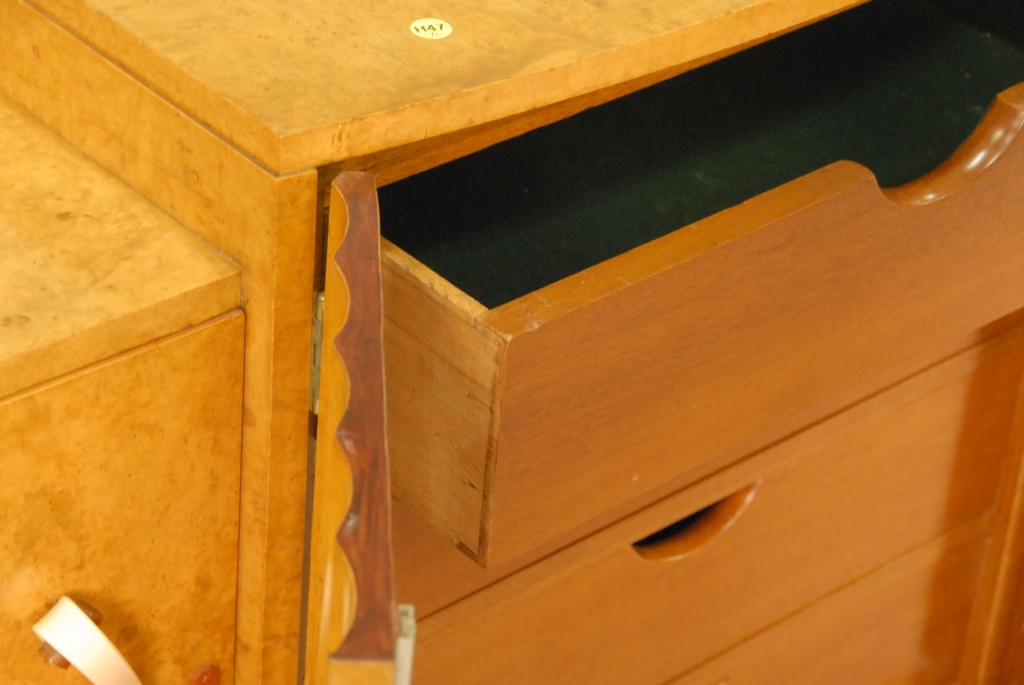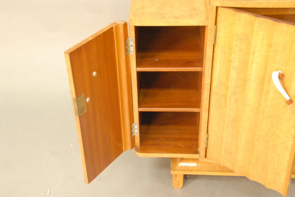 Lot 57: Burlwood modern server, center with two doors with fitted felt lined drawers inside, all with original scroll hardware 2 handles as…