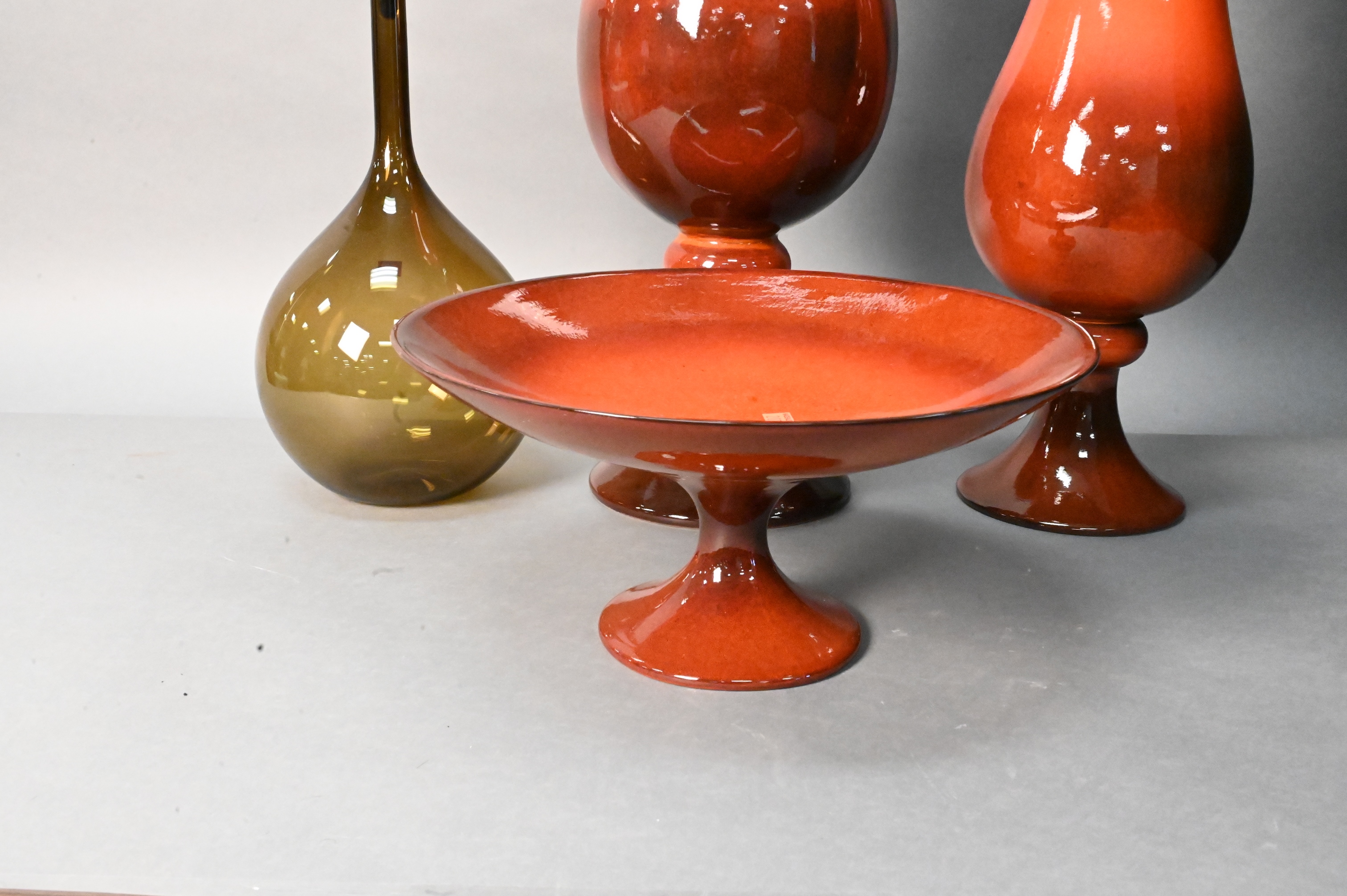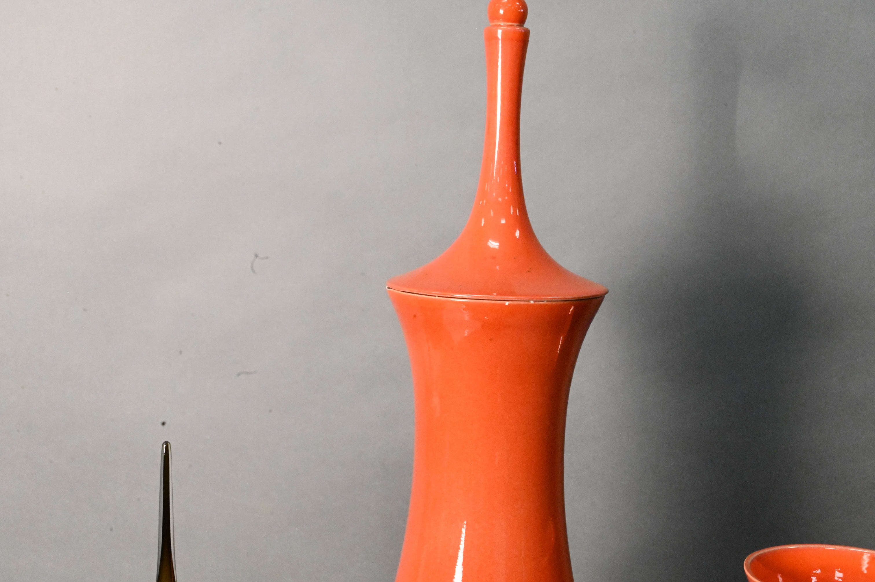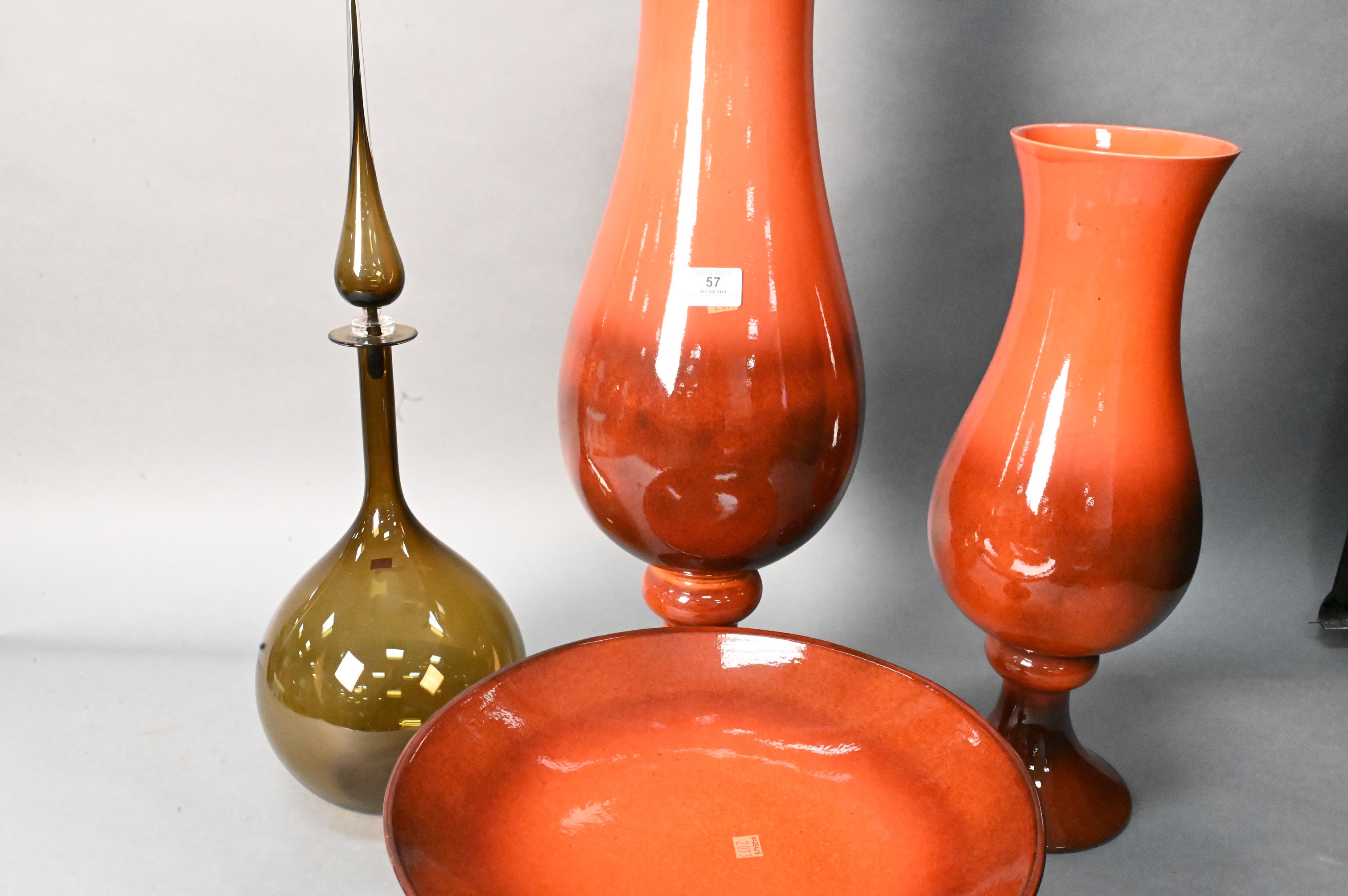 Four Piece Group, to include three Global View flambe glaze pieces, along with a glass bottle vase, tallest 40 inches.