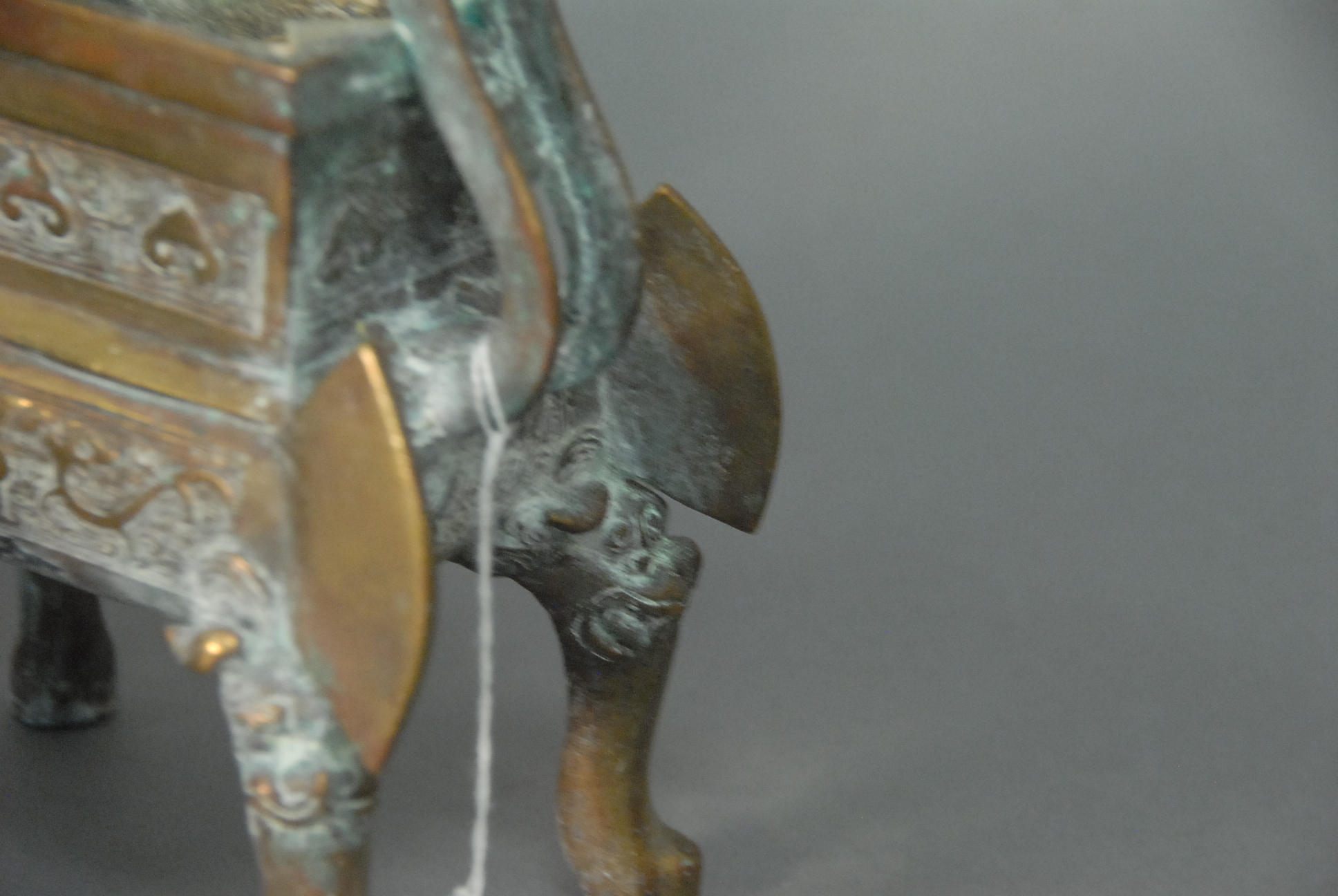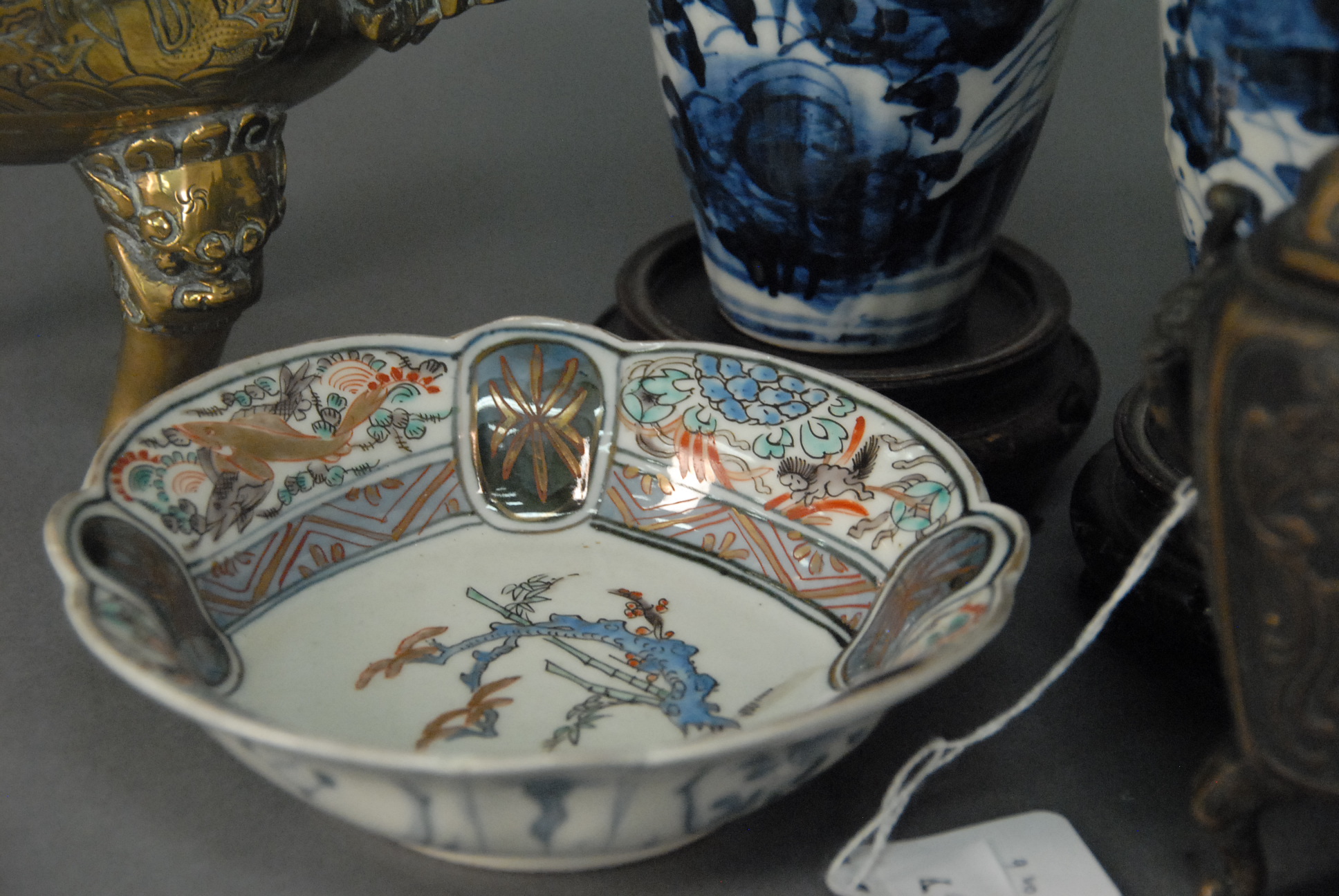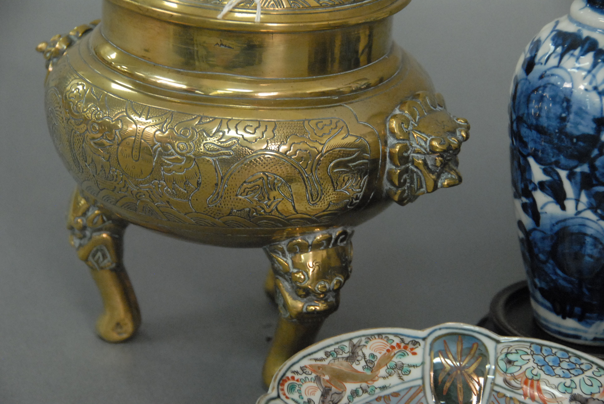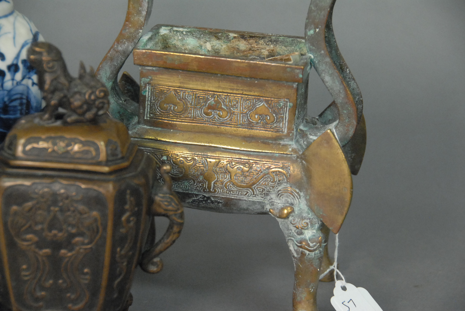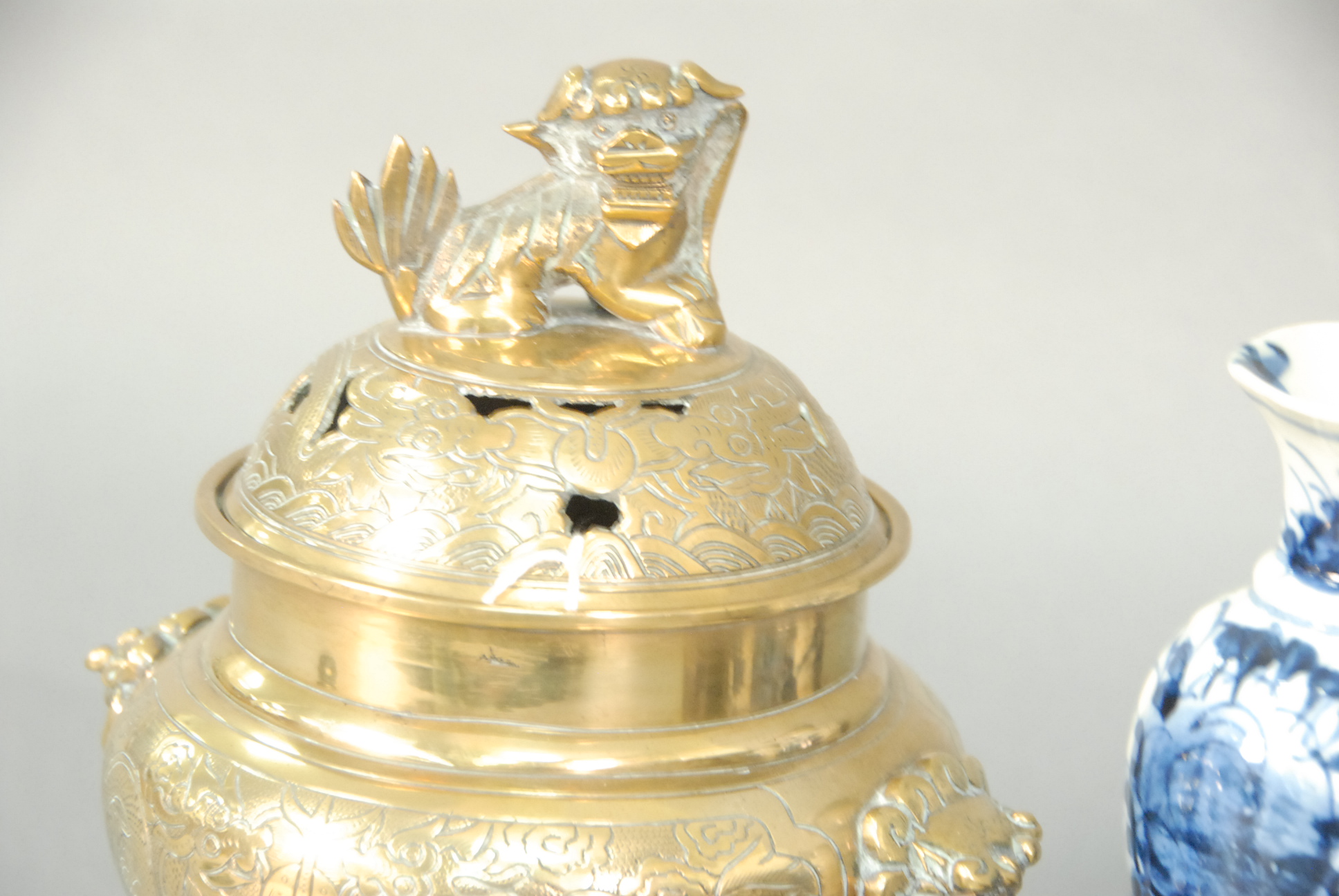 Lot 57: Group of six Oriental pieces to include a pair of blue and white vases, small porcelain dish, two brass censors, and bronze urn.