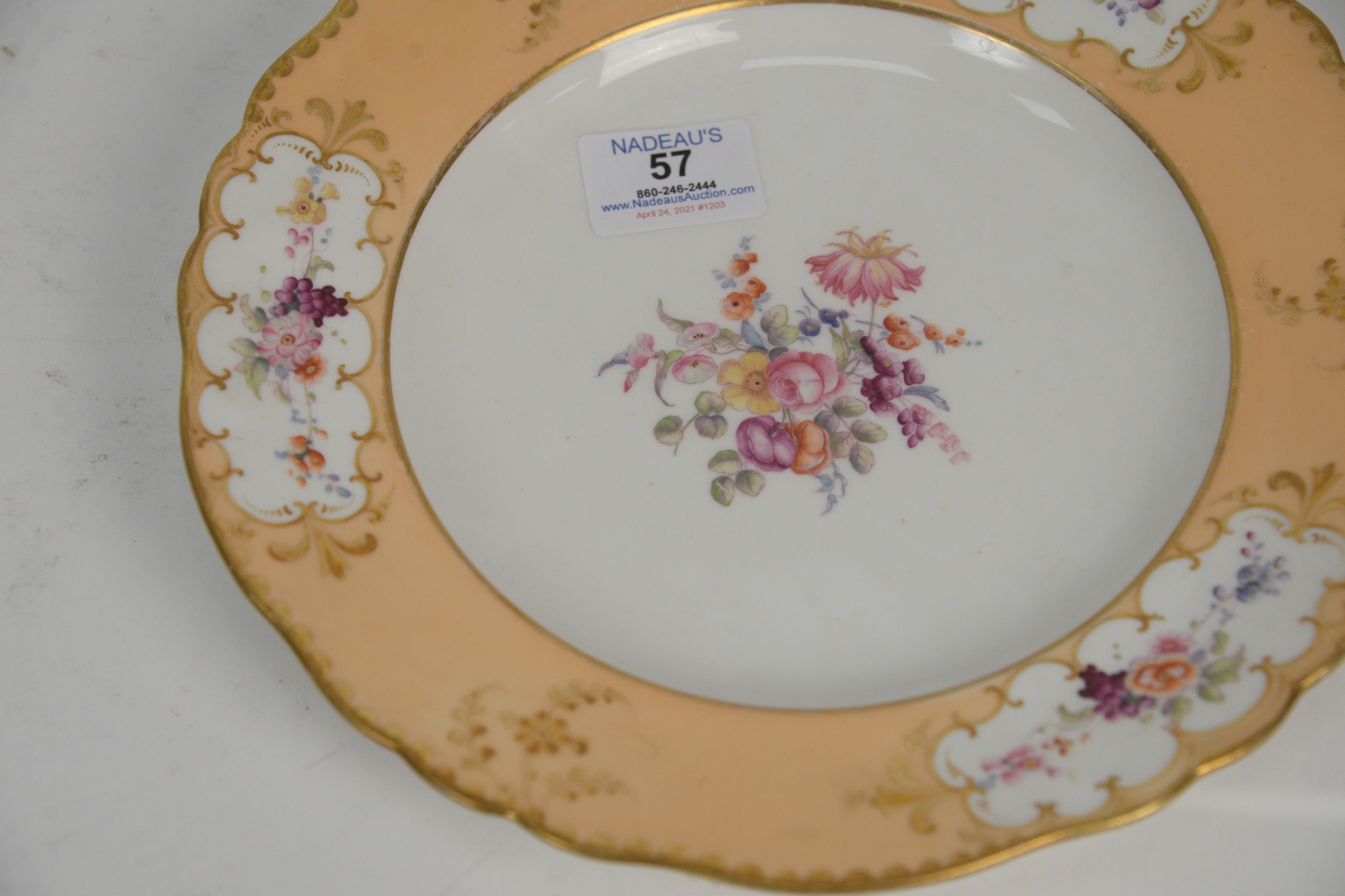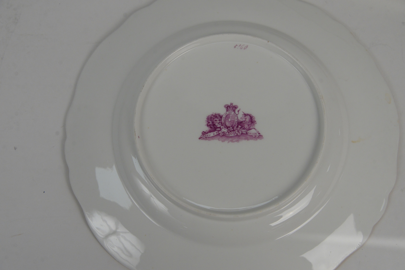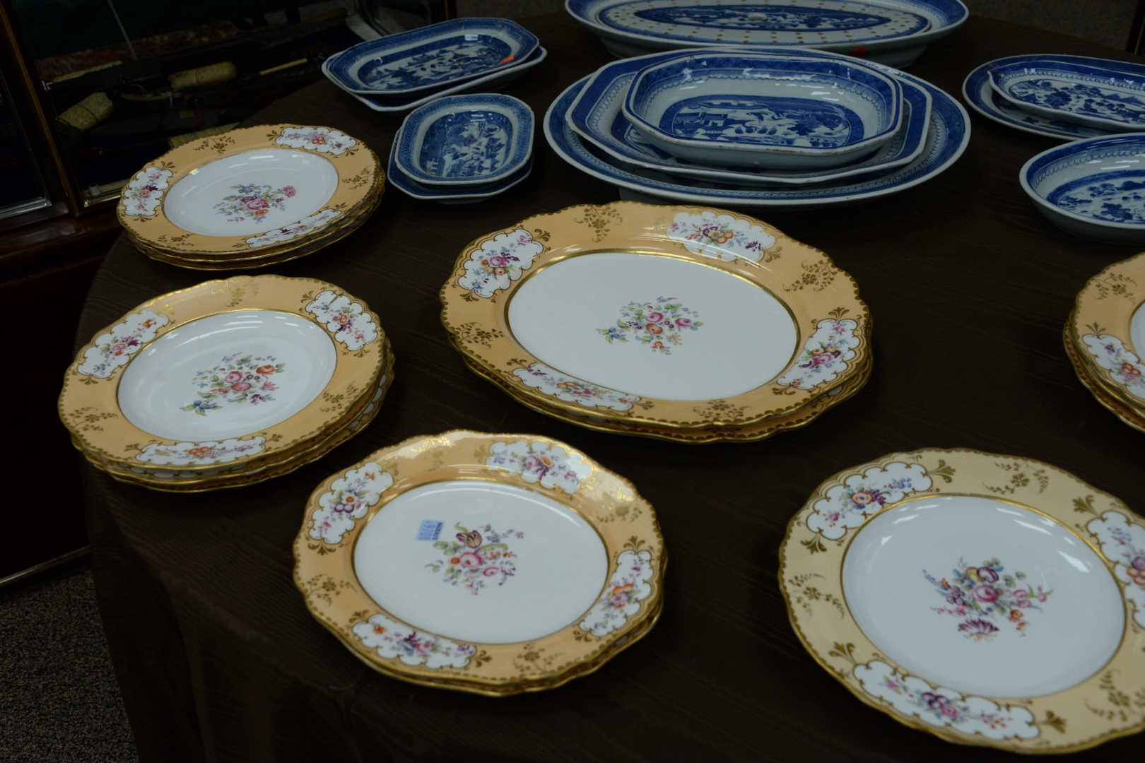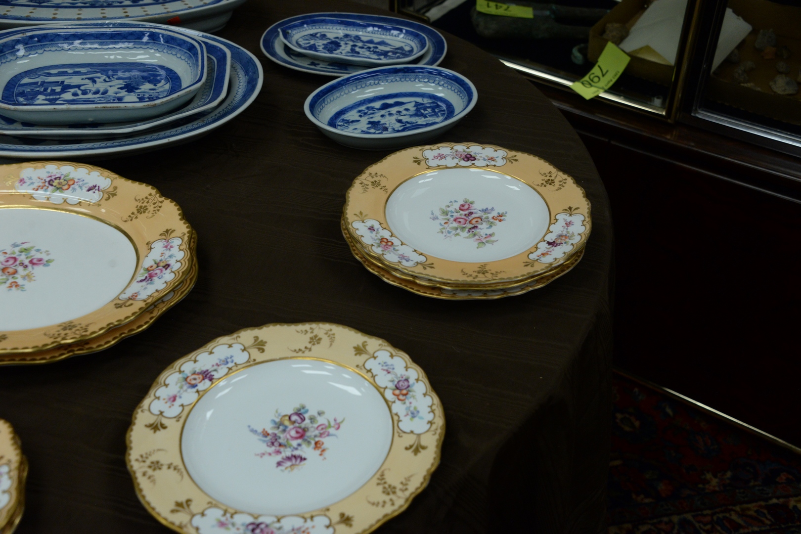 Lot 57: Group of Sixteen Scalloped Edge English China, to include twelve dinner plates along with four serving plates, each marked to the underside with Dieu et Jr Mon Droit, diameter of dinner plates 10 inches.