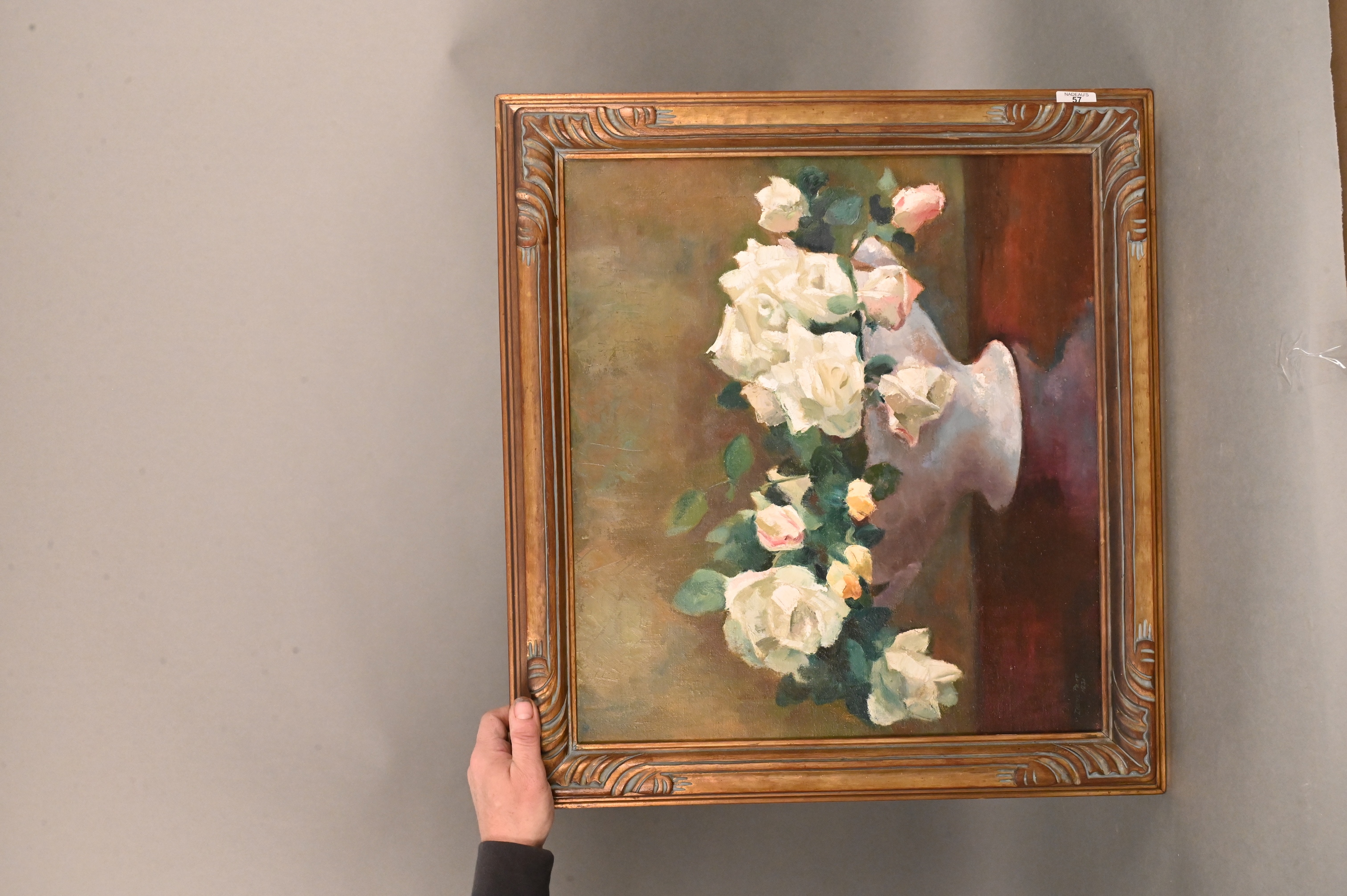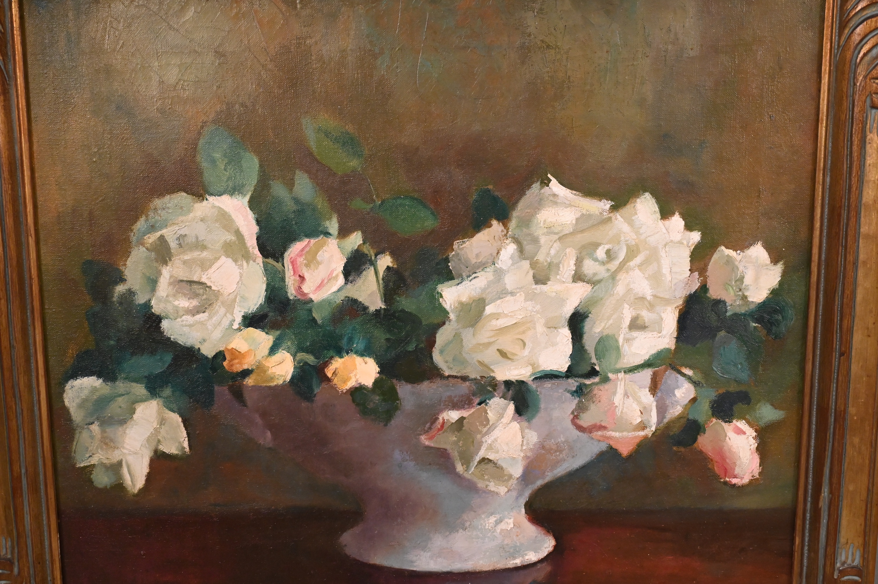 The composition depicts a bowl of white roses arranged against a subdued ground, rendered in a restrained American Impressionist palette with soft tonal transitions and confident brushwork.