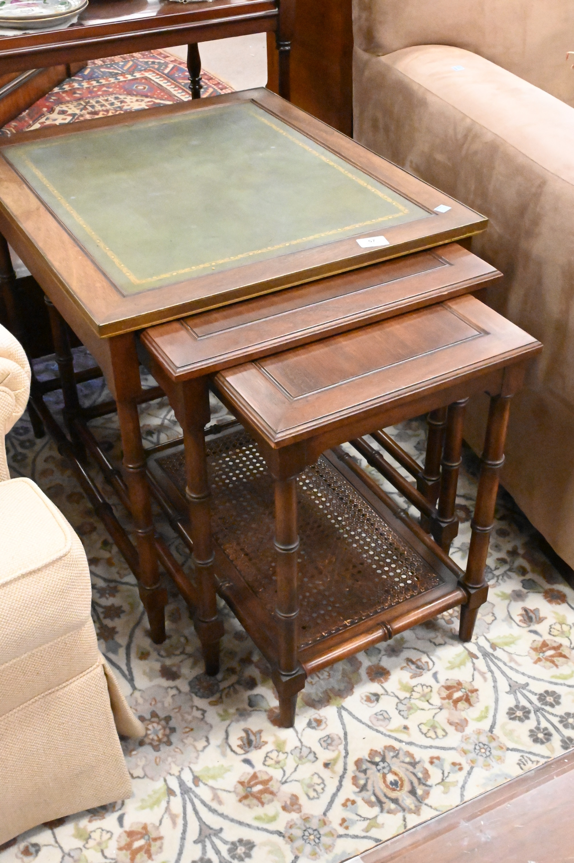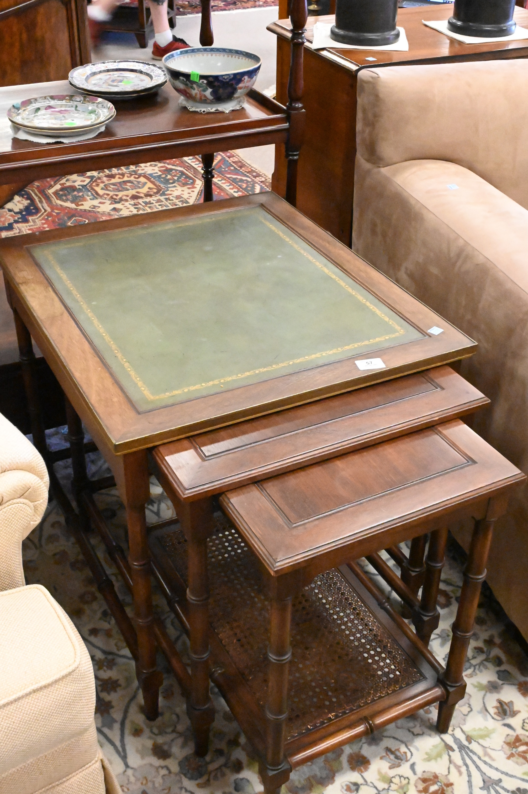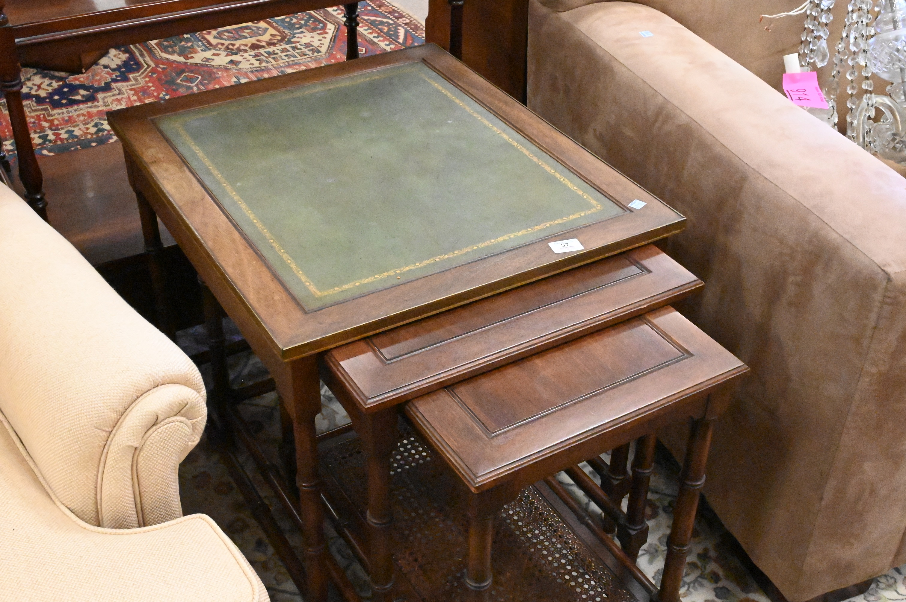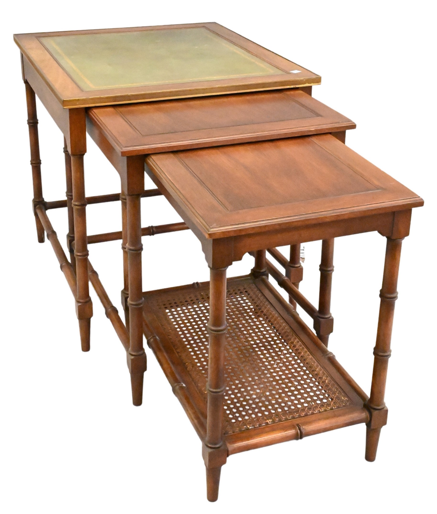 Nest of Three Tables, with largest having leather top, largest height 23 inches, top 22″ x 26″