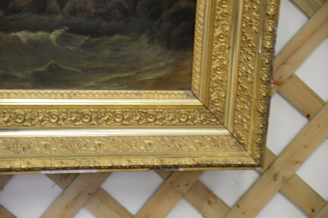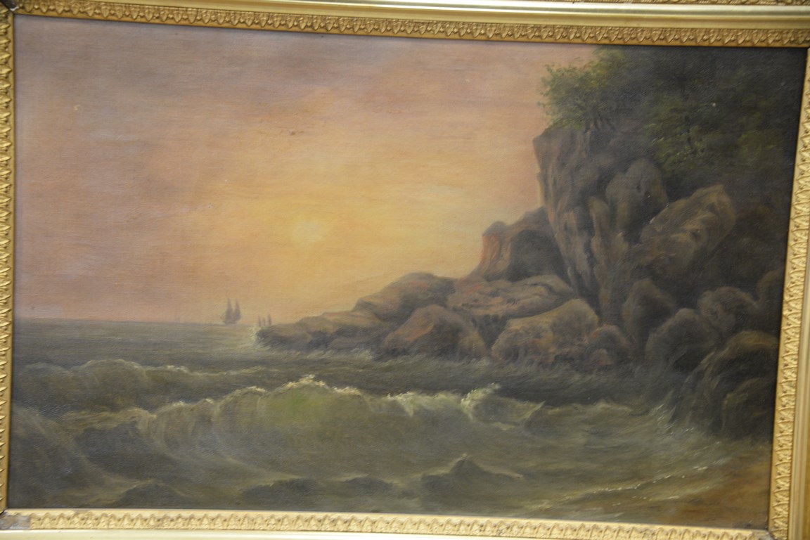 Lot 57: Oil on canvas sunset with crashing waves on rocky shore, unsigned, in Victorian gilt frame, 13 x 20.