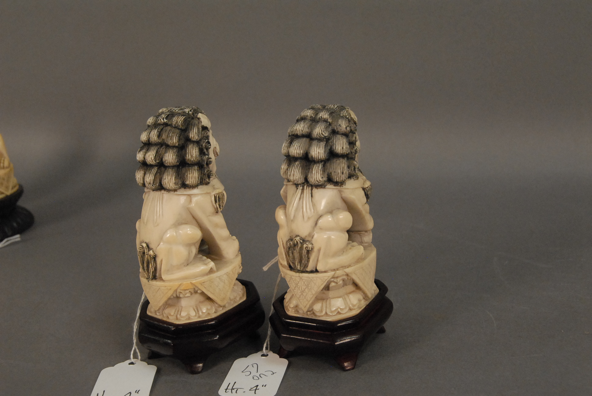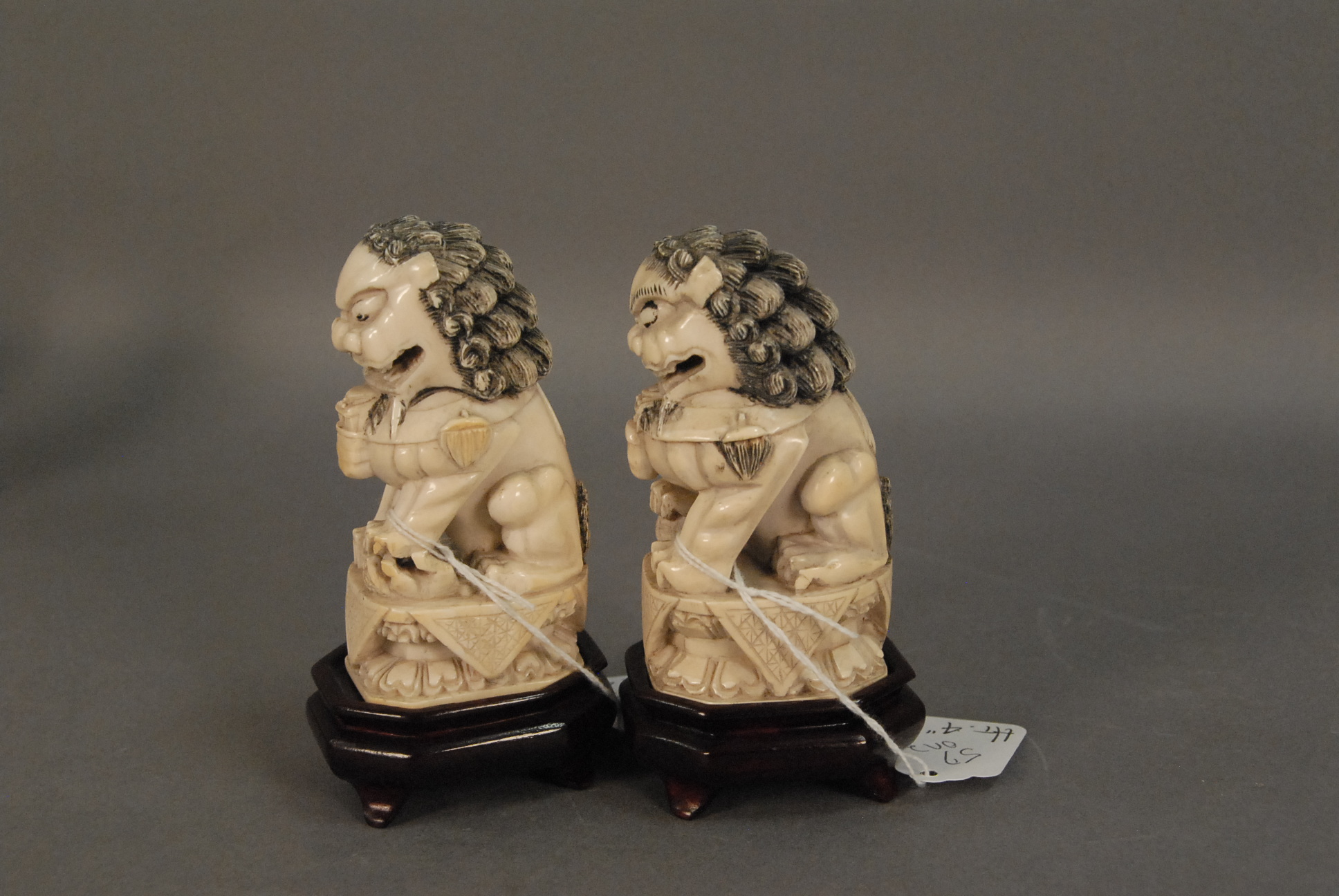 Pair of carved ivory foo dogs, on wood stands, ht. 5.