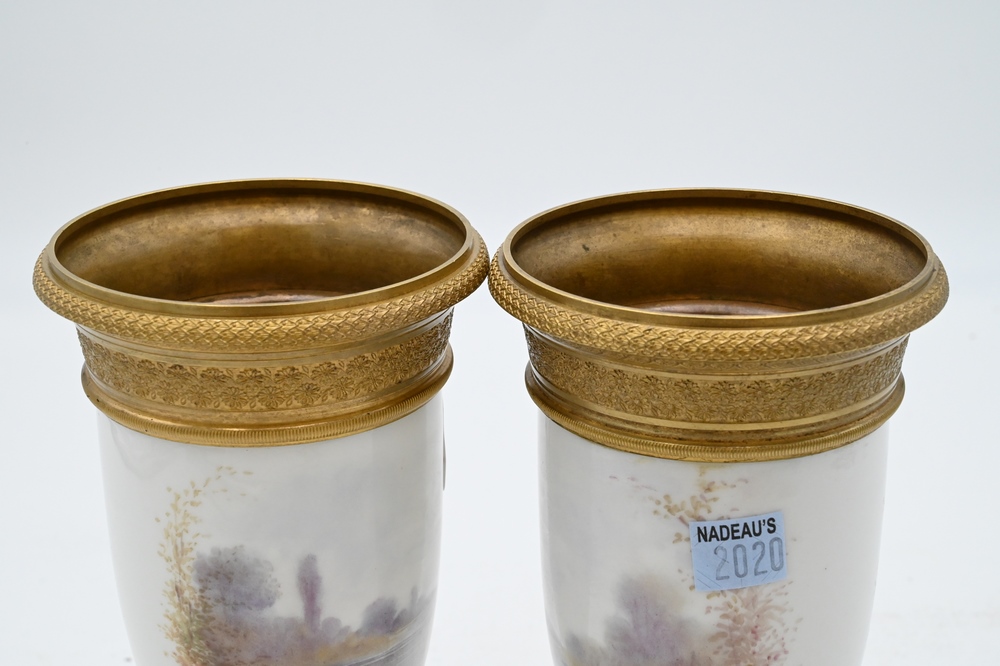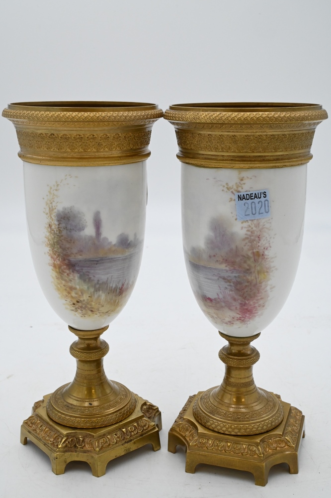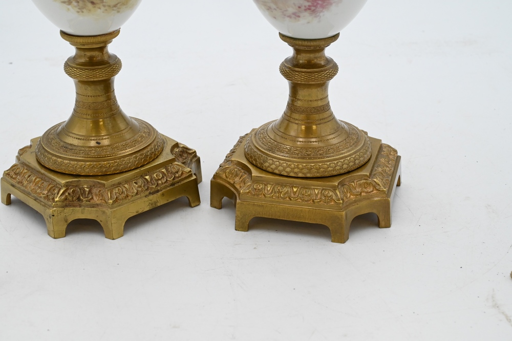 Pair of French Porcelain and Bronze Garniture Urns, each having gilt bronze top over painted scene with maiden and putti figure, on bronze base, height 9 1/4 inches.