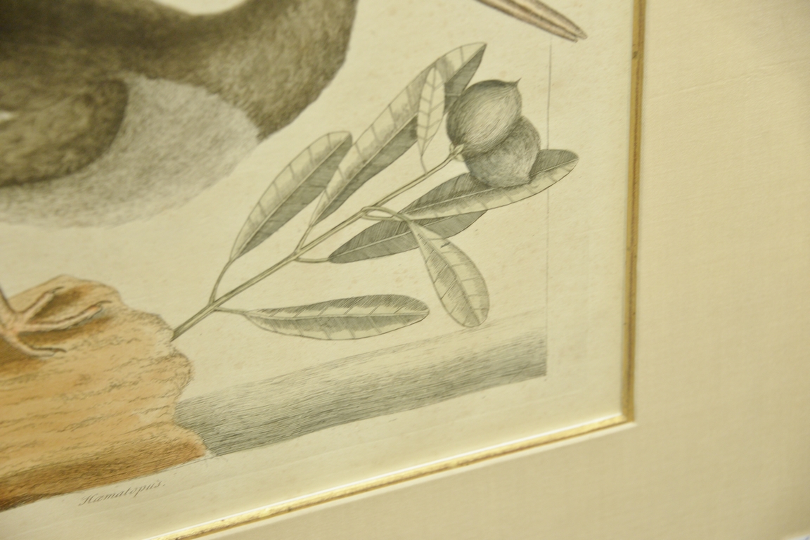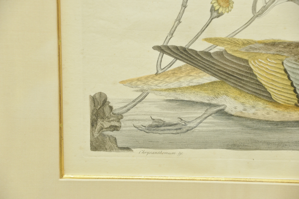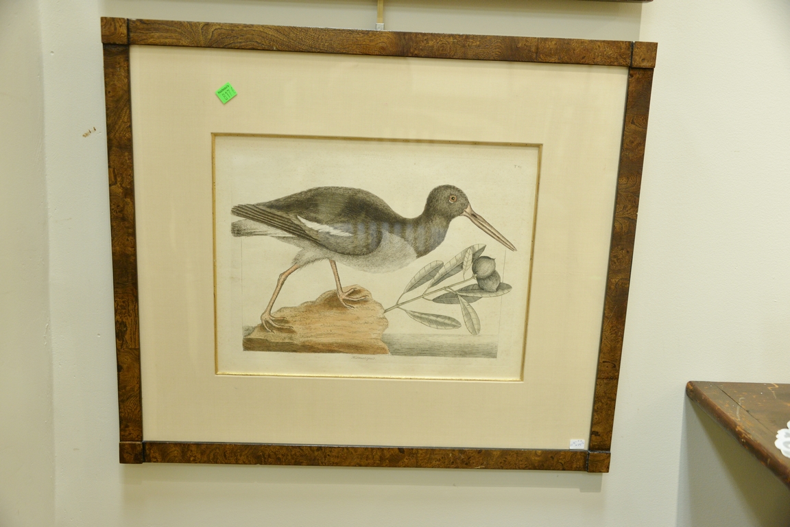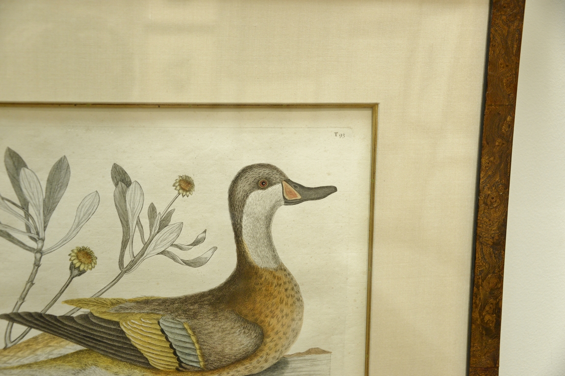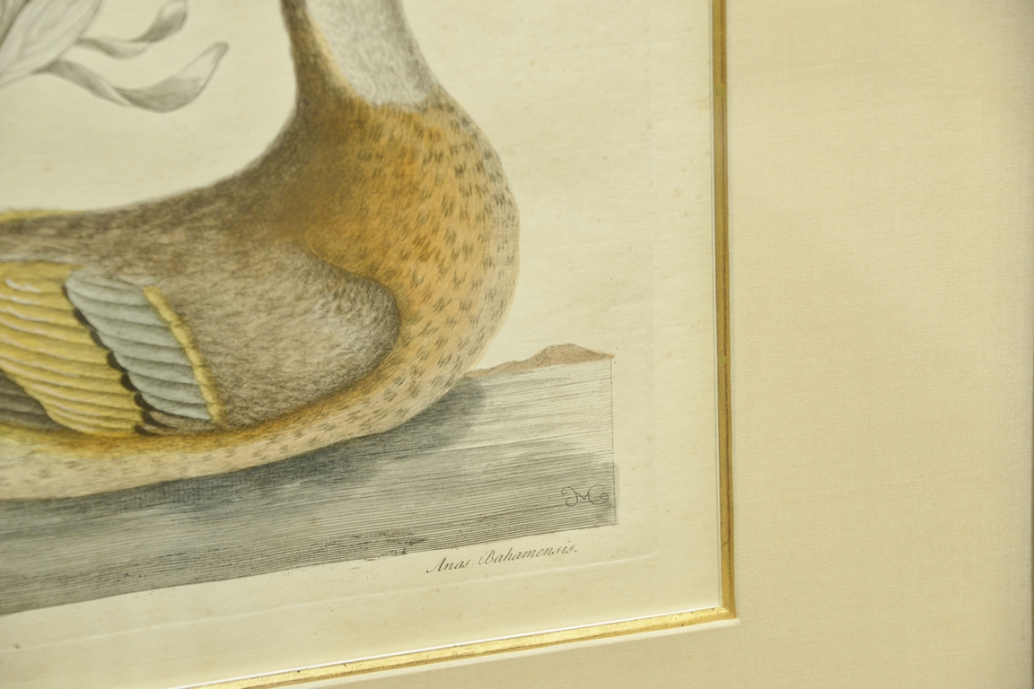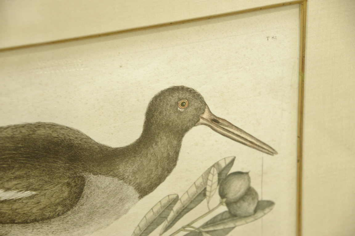 Pair of Mark Catesby hand colored engravings Chrysanthemum & C Anas Bahamensis T93 and Haematopus T85. plate size each: 10 1/4 x 13 3/4, sight size each: 11 3 /4 x 15 1/4 Provenance: Property from Credit Suisse’s Americana Collection