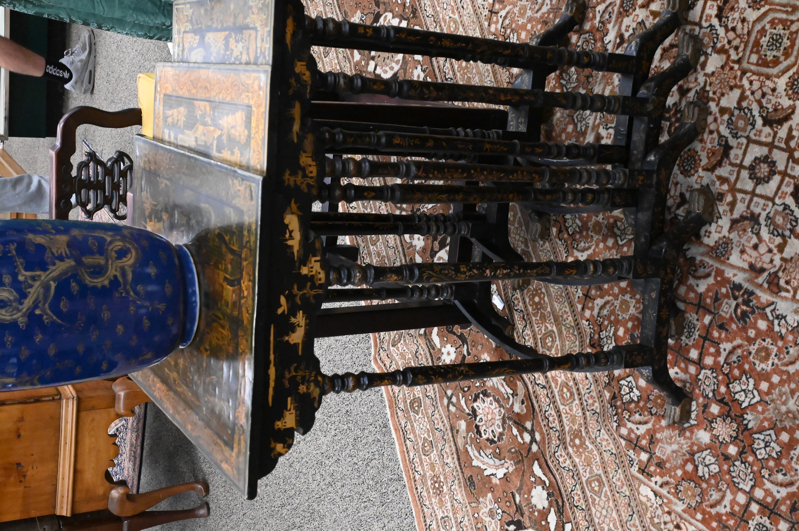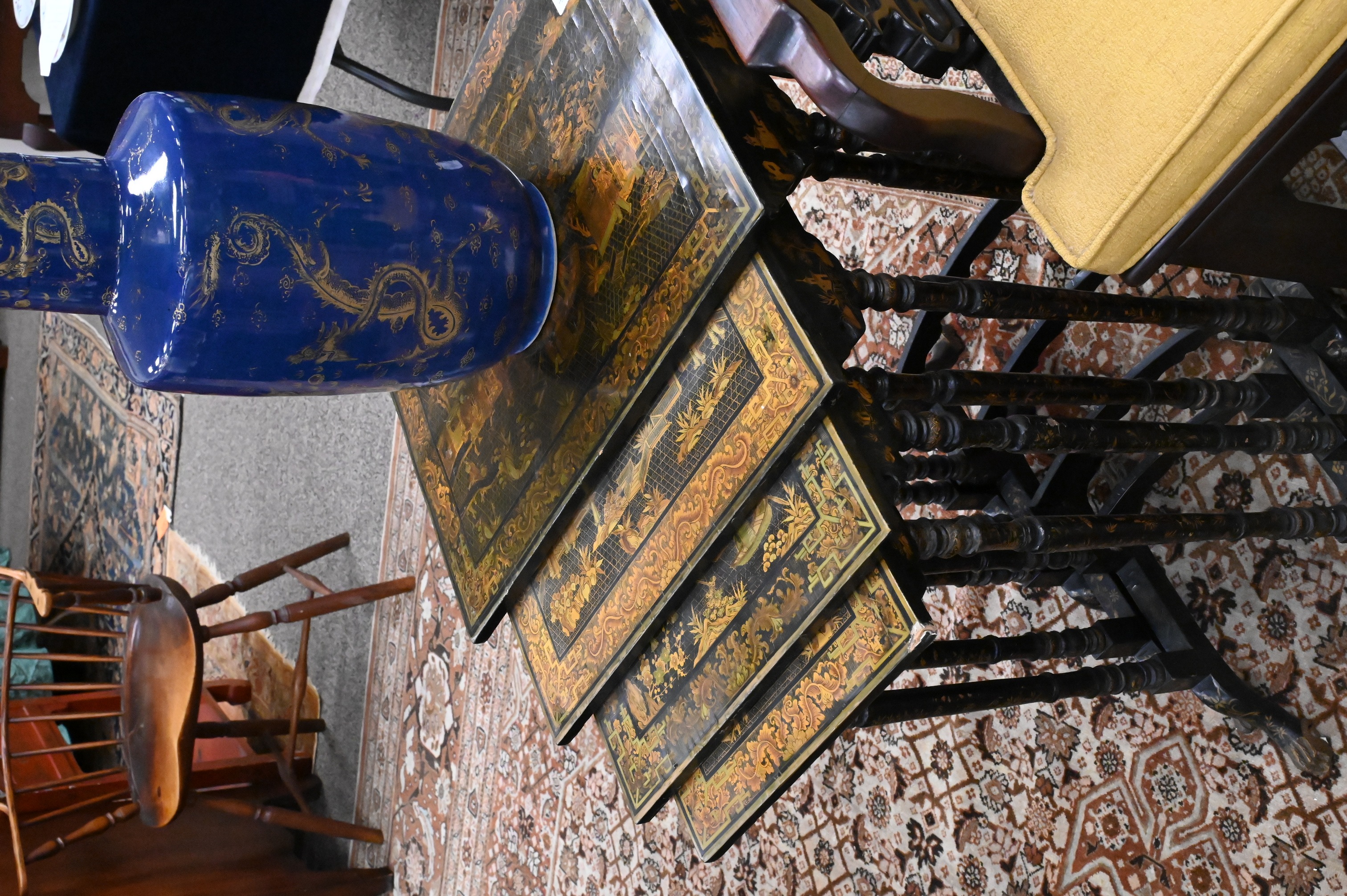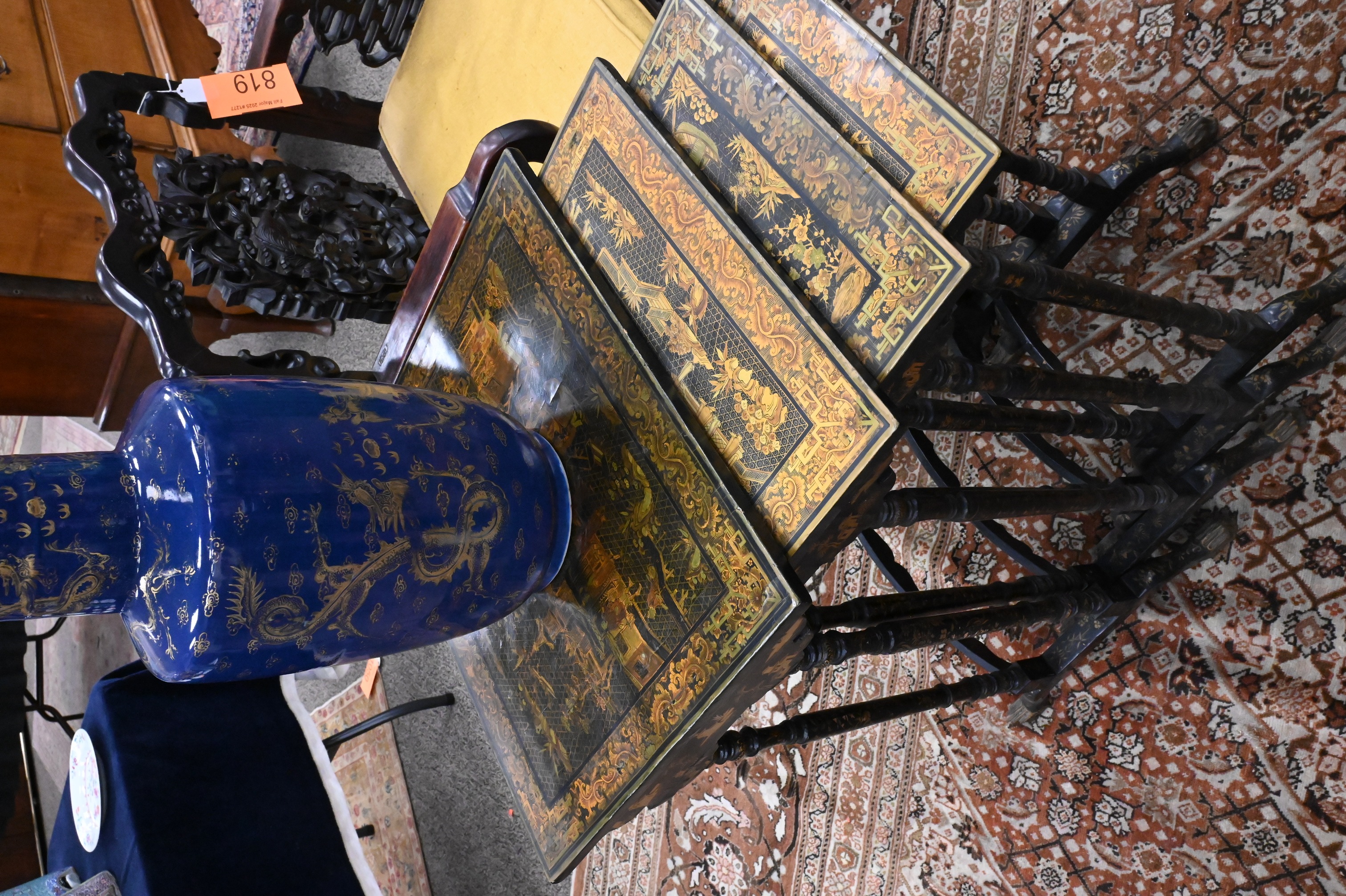 A set of four graduated nesting tables, each with rectangular top decorated in black and gilt japanning with figures, pavilions, and floral motifs within patterned borders, raised on slender supports ending in carved paw feet.