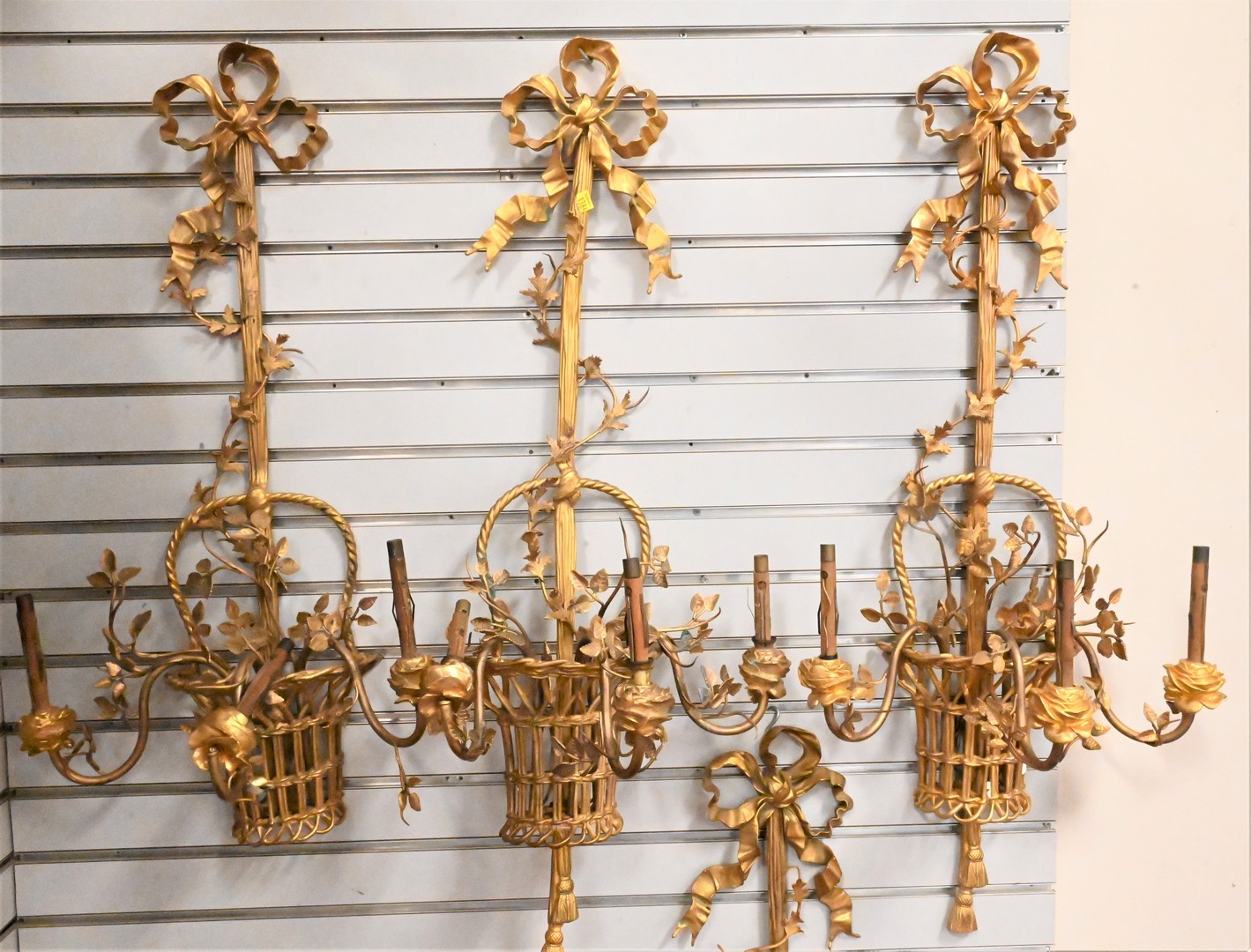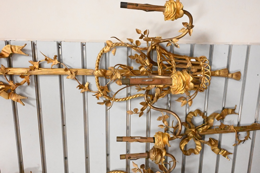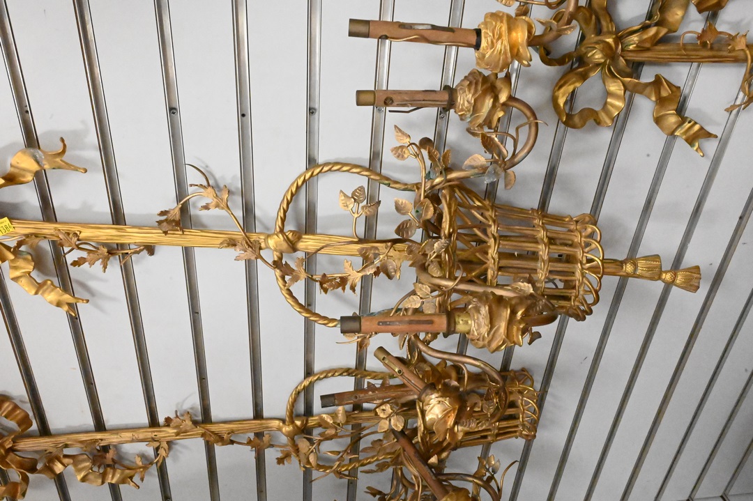 Set of Four Gilt Bronze Sconces, basket of flowers design, two flowers broken, one tassel on bottom off but available, one piece of ribbon off but available, height 38 inches.