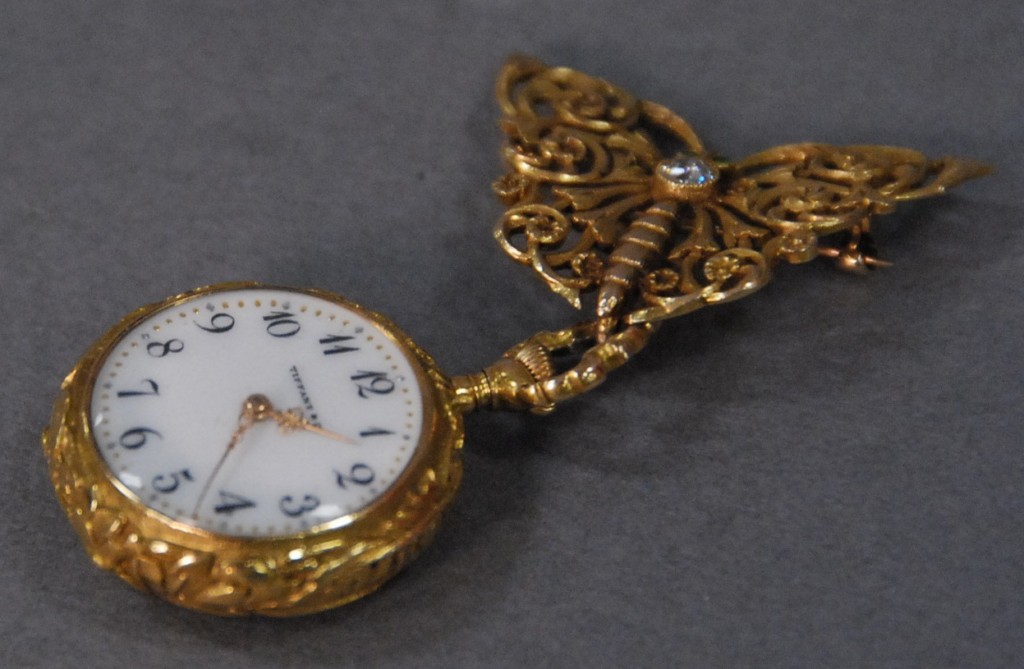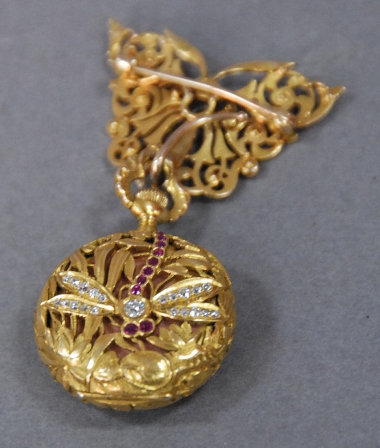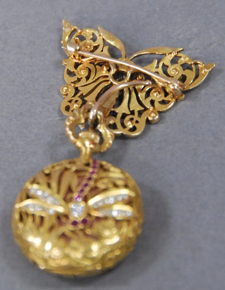 Tiffany 18kt gold lapel watch with reticulated gold pin butterfly mounted with diamond and enameled eyes, watch with reticulated back with dragonfly mounted with diamonds and rubies, back inside enameled chip in enameling porcelain dial marked Tiffany & Co. total weight 34.2 grams.